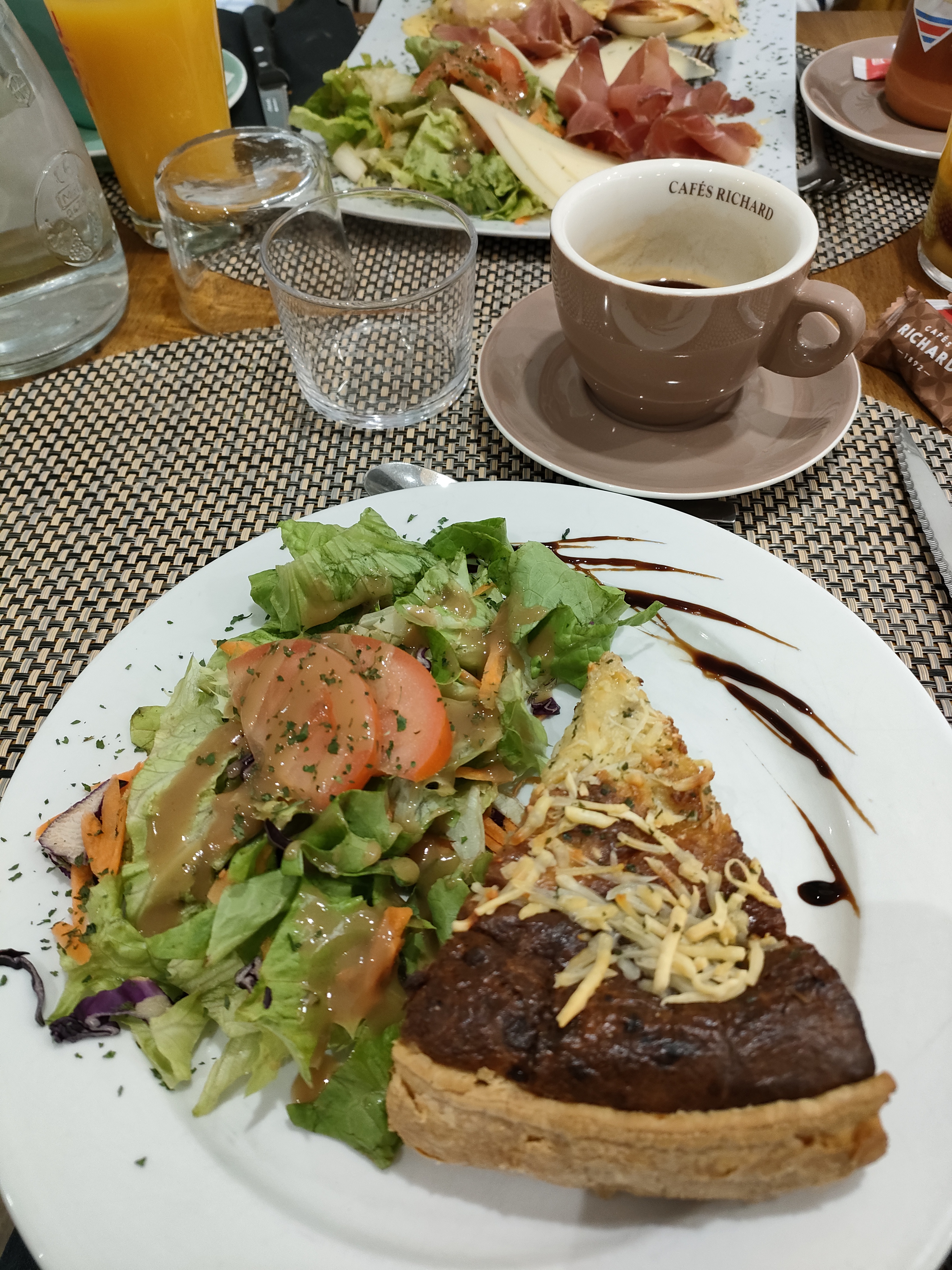 Parfait ! Très bon accueil, des tartes maison, en portions satisfaisantes, accompagnées de salade de saison ou de crudités bien fraîches ! Et le café gourmand (café deca à l'eau - donc pas de produits cracra), mousse au chocolat à la framboise (mummmmmmm), crème brûlée, tarte aux fruits rouges... Très bon du debut à la fin !! Une pause déjeuner fort agréable !
