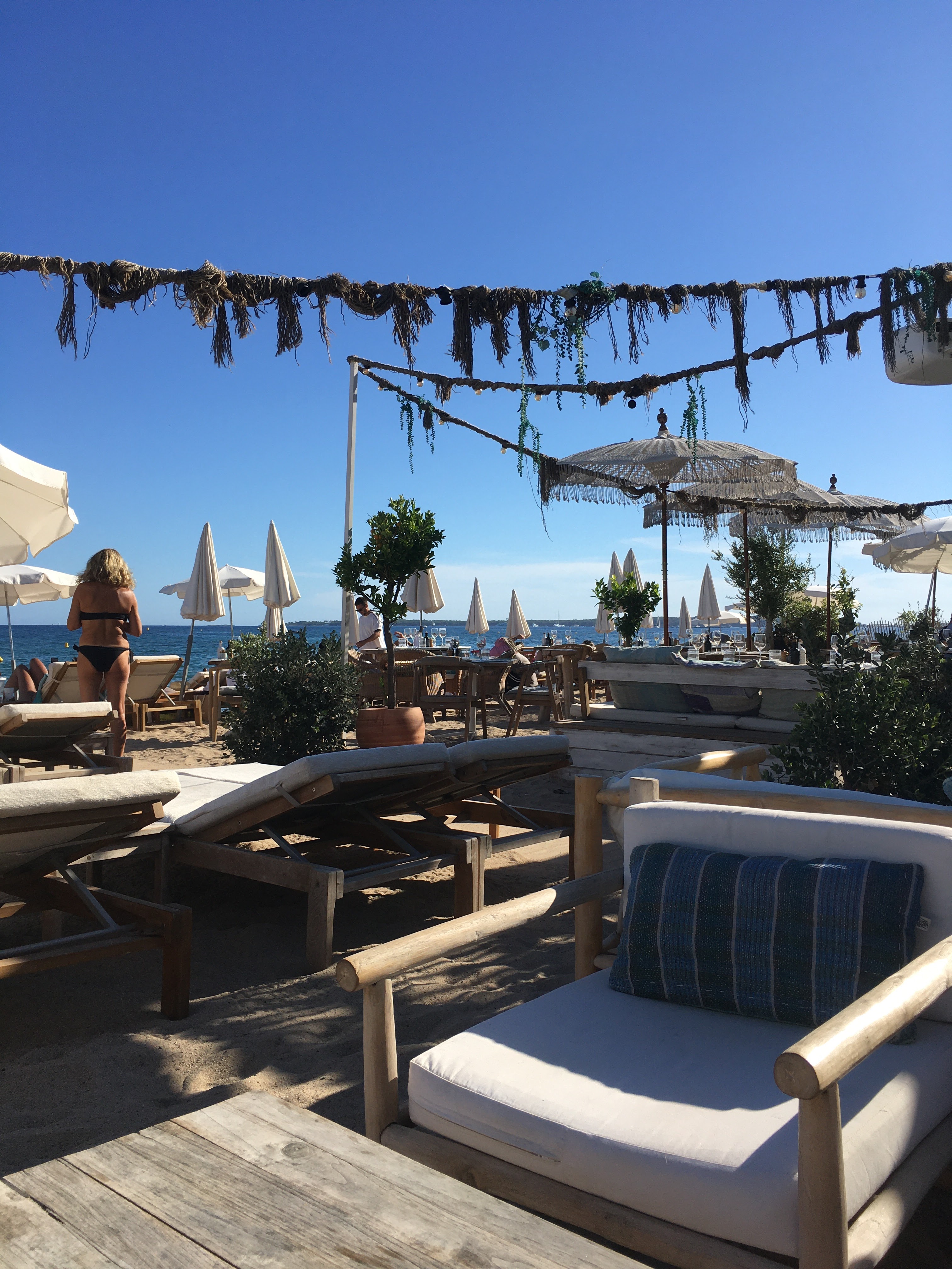 Superbe cadre vue sur les îles de Lerins. Seul petit bemol, il n’y a plus de soleil ☀️ sur la plage (côté loundge vers 19h30-20h). Sinon ambiance très sympathique avec le dj avec de la musique electro chill. Serveurs et serveuses au petit soin. Nous avions goûté les 2 cocktails rosa et gilette (dans mes souvenirs) mais légèrement déçue des cocktails à base de litchi et l’autre de rose. Pas très frais. Il faudra y retourner pour tester d’autres cocktails. Concernant les plats, très frais et produits de qualités. Nous avions pris la salade de poulet, la feta au four accompagné de petites tomates cerises & poivrons, les tomates & coeur straciatella et en plat chaud les ravioli aux truffes. Petit plus : parking à l’extérieur mais au prix de 5€ la soirée.