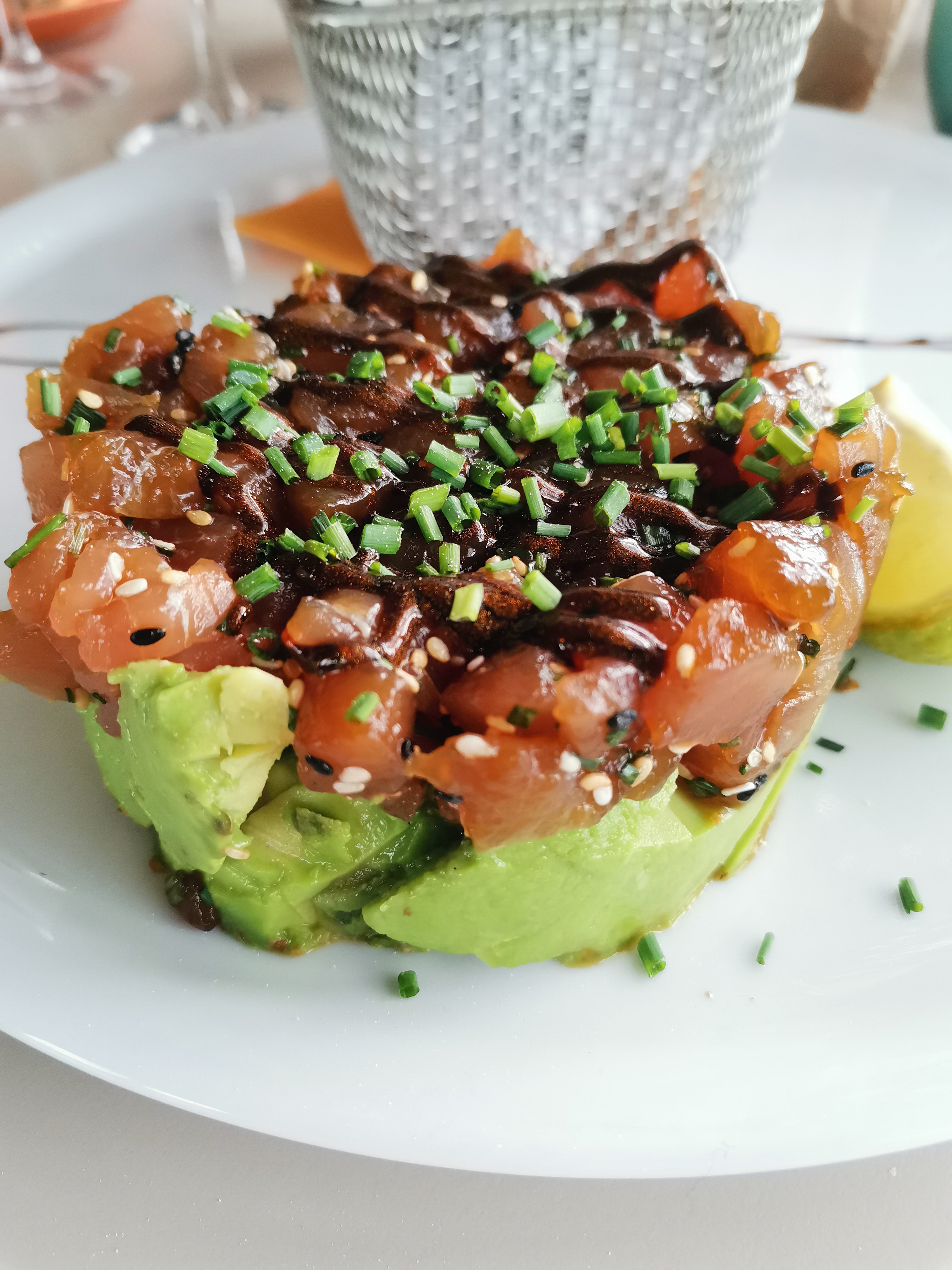 Tartare de thon sur lit d'avocat, excellent. Très bon accueil et quel plaisir de bien manger au bord de l'eau avec un très beau coucher de soleil ☀️