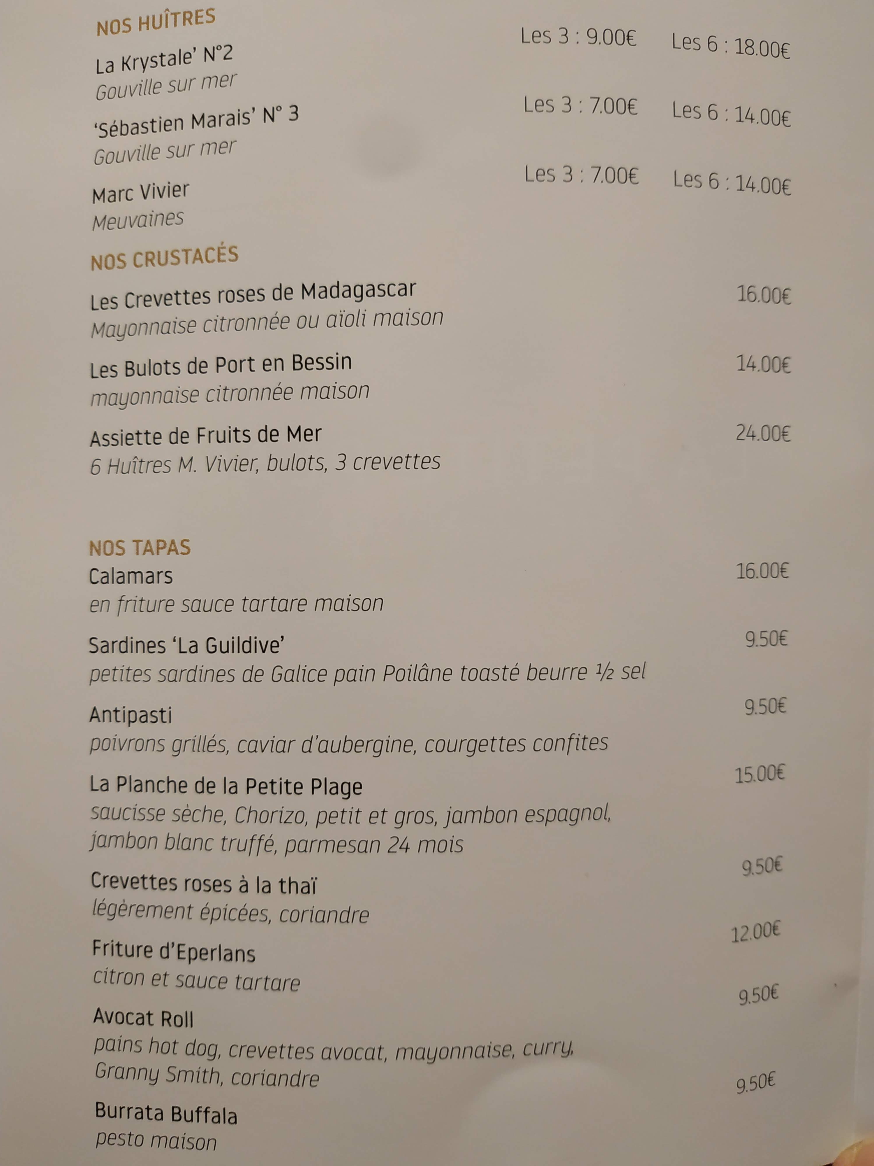 La carte propose divers fruits de mers, poissons, burgers et moules frites. Les plats sont savoureux et généreux, comptez entre 10 et 30 euros en moyenne. Décoration contemporaine et personnel dynamique au rendez-vous, la petite plage nous a donné satisfaction, je recommande.