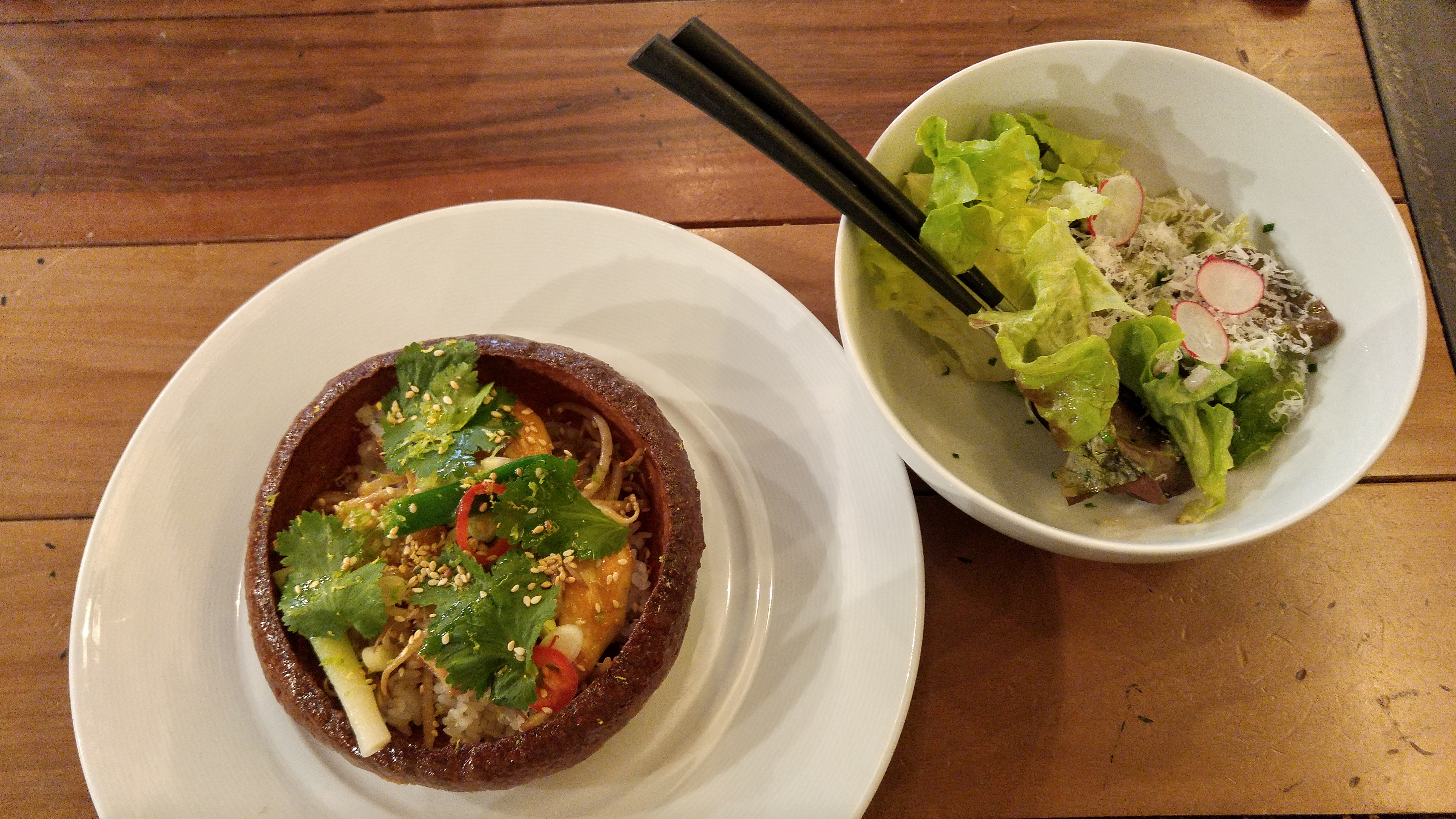 C'est original puisque les plats sont servis dans ce que j'appellerai des tourtes quiches ou tartes. C'est très bon très réussi produits frais et de qualité absolument délicieux et expérience de Fooding qui vaut le détour. La déco est épurée en bois et métal très agréable avec les couverts dans des boîtes sur le côté c'est très intéressant.