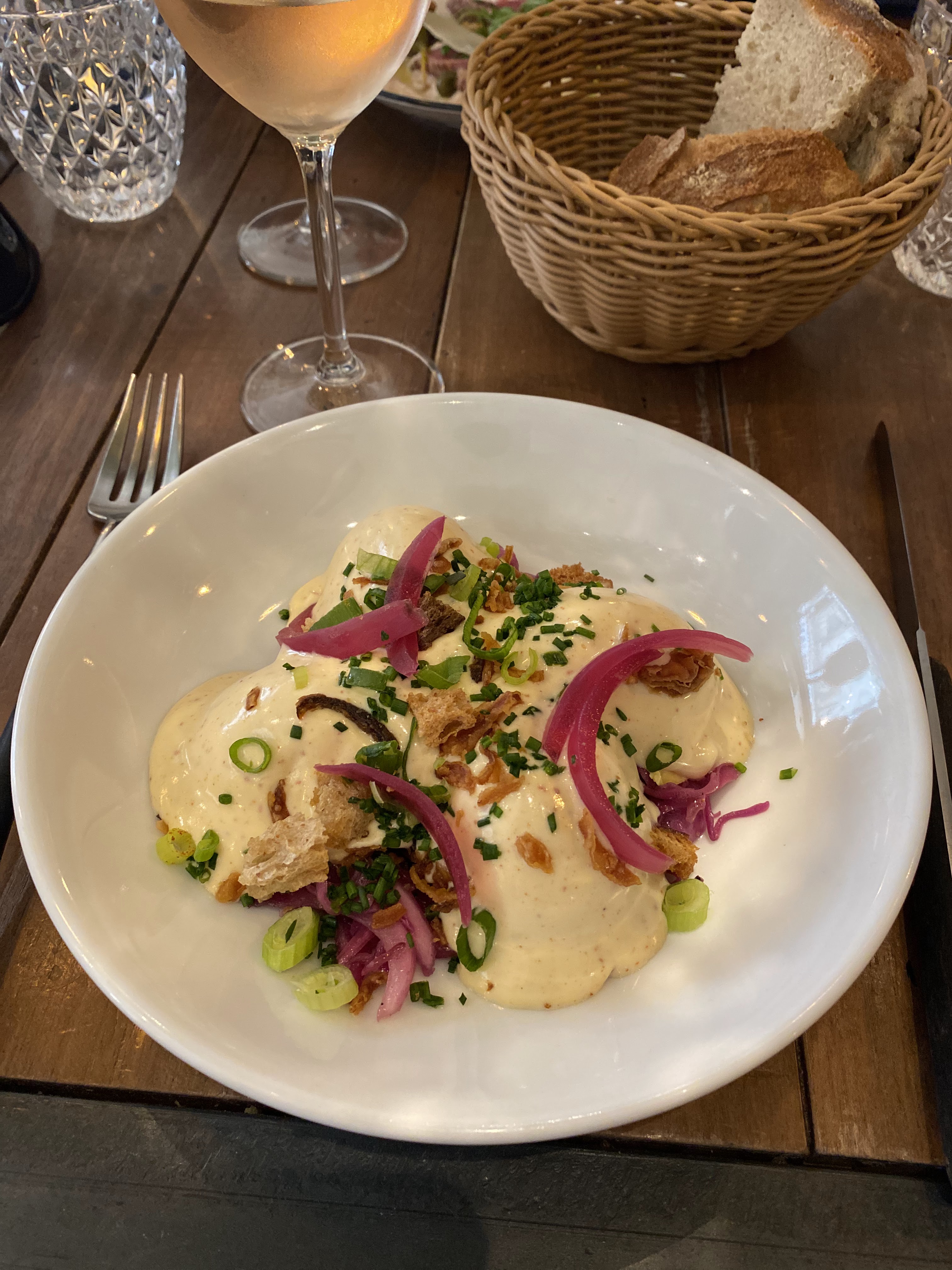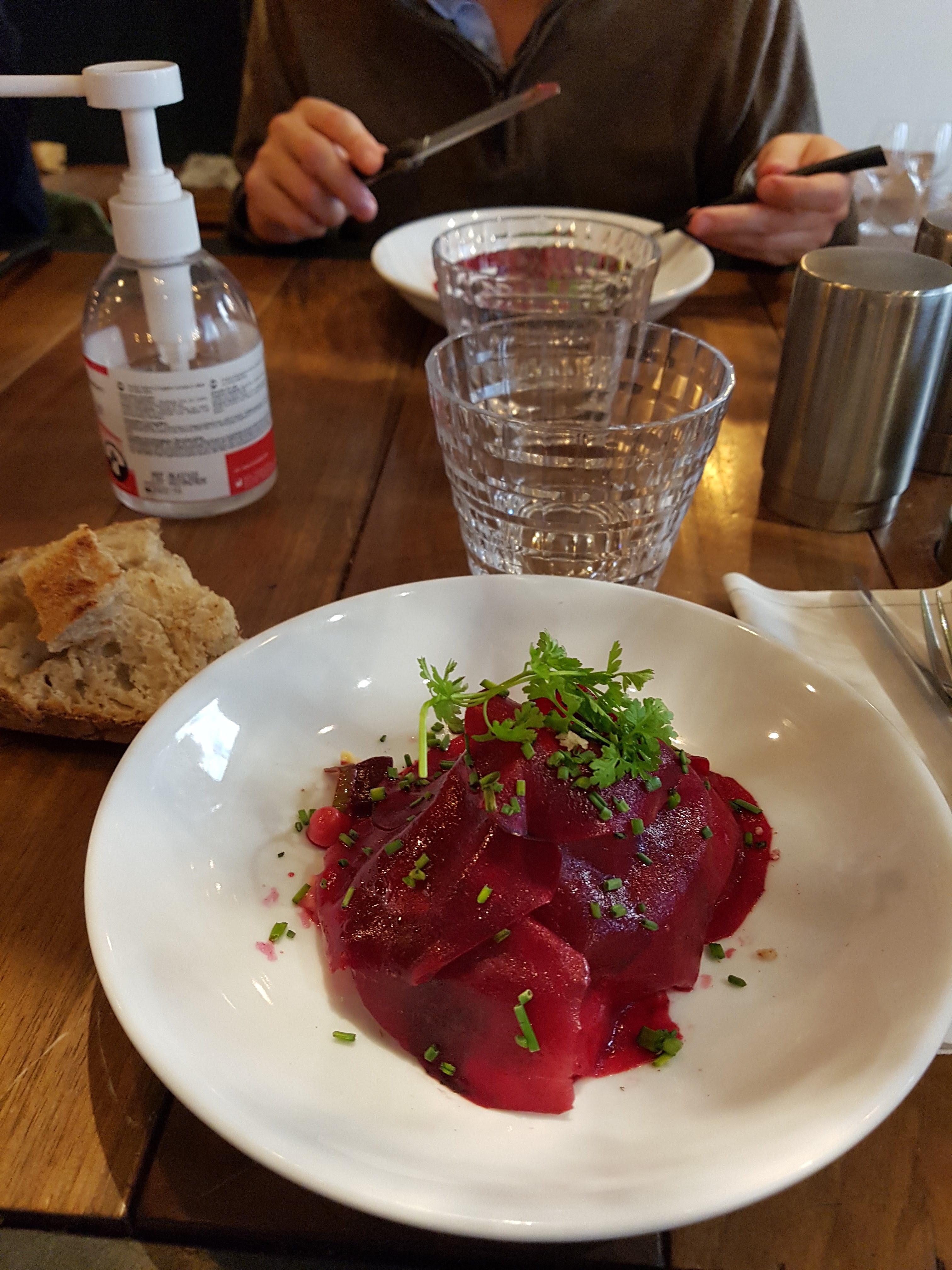 Service lent et aucune attention durant 15 minutes. Le serveur devrait peaufiner sa formation attention au client. Trois personnes sont pourtant suffisantes pour assurer un bon service. Eh bien non. Quant aux plats, over rated... Des soit disant ravioles de betteraves qui sont en fait des tranches de betteraves fourrées à la salade betterave... Super inventif le plat... Et beaucoup de blabla pour un plat pas génial. La salade Cesar avec de la salade aux extrémités orangées ce qui signifie pas très fraîche la salade... 19 EUROS la Cèsar... Foutage de gueule ? Oui. Le beaujolais délicieux.