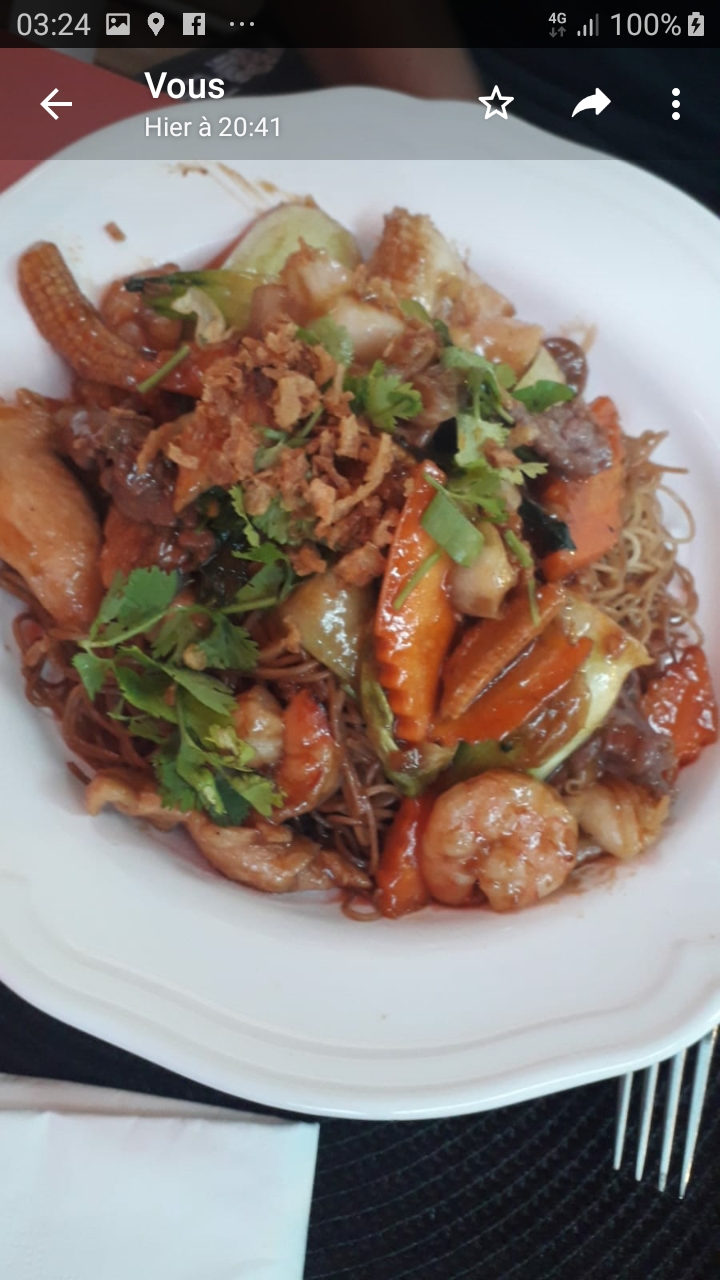 Le personnel est aimable mais le curry trop piquant; riz cantonais bizzare et collant; crevettes avec leur queues, copieux mais mieux enlever les queues; la mangue pas présentable! des carrés jettés dans une assiète; cuisine bizzare style débutants; Le patron nous parle de la guerre et des exactions, des horreurs a vous couper l appétit; la 8 ème dimension!! bizzare ! rouleau du printemps énorme et dur a mettre en bouche!! pas top du tout! c était vide, on comprend pourquoi !