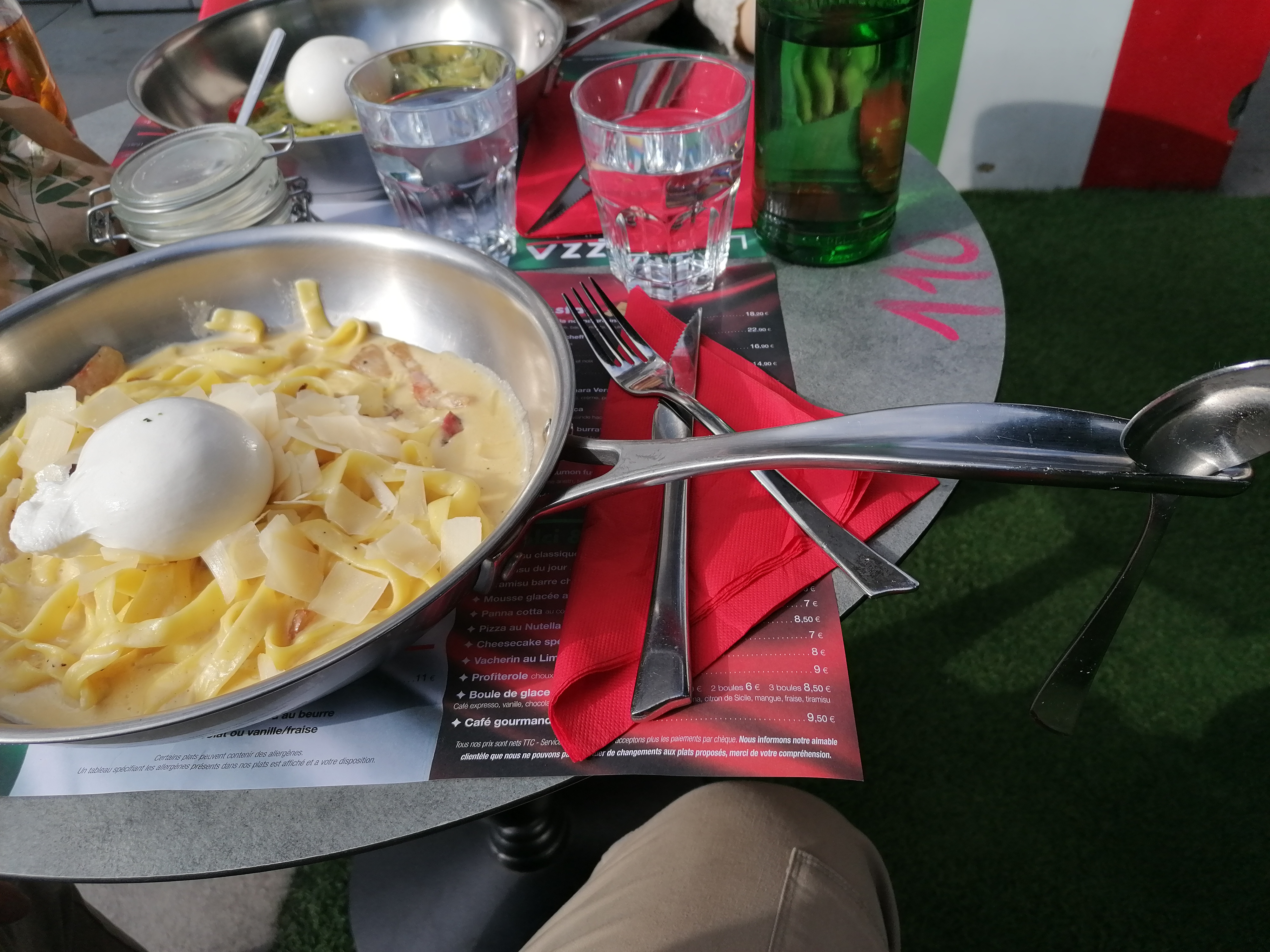 La soirée a commencé par le film sur les Trois Mousquetaires puis j'ai été dans votre merveilleux établissement pour équilibrer cette soirée qui était sans doute trop bien jusque là. J'ai commandé des pâtes carbonara et j'ai reçu une poêle carbonara. Pour rattraper cette folie j'ai eu en supplément du parmesan mille et une pattes 🐜. Je mets 3 sur 5 pour l'ambiance car nous étions collés à une porte d'entrée et non pas collés à celle des toilettes.
