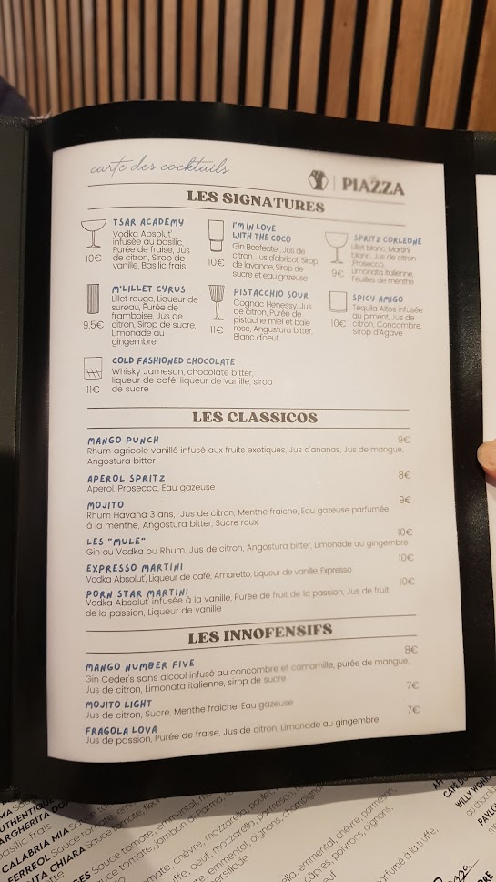 Une expérience culinaire exceptionnelle à La Piazza. Les cocktails exquis et la sélection de vins pour tous les budgets ont vraiment élevé notre expérience. Les pizzas étaient délicieusement authentiques, le risotto était parfaitement crémeux et la salade était fraîche et délicieuse. Concernant les desserts mention spéciale pour les profiteroles ! La variété des saveurs et la qualité des ingrédients font de ce restaurant italien un incontournable du secteur. Le service chaleureux et efficace ainsi que l’ambiance accueillante complètent cette expérience mémorable. Réservation en avance recommandée !