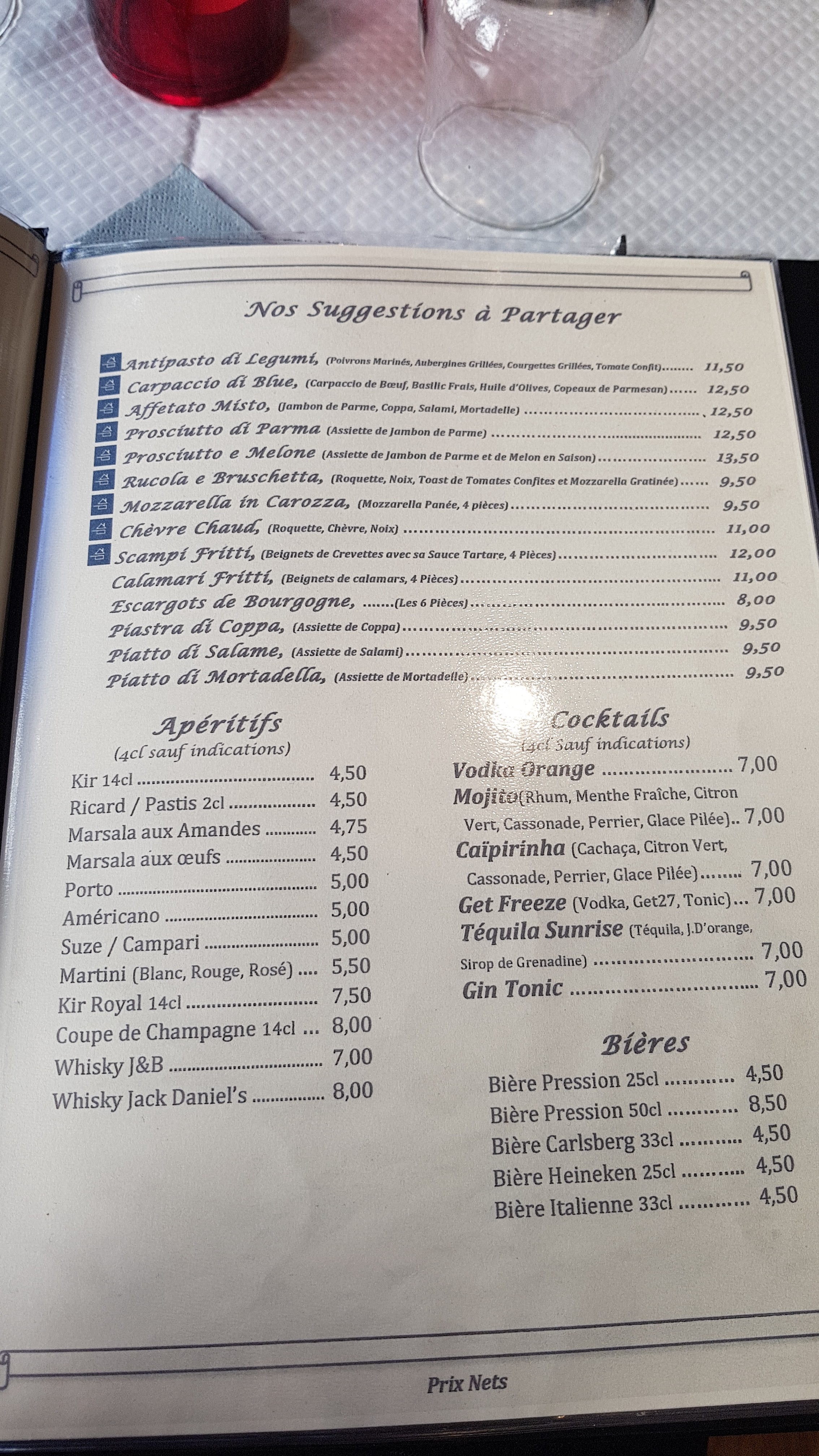 Un restaurant avec un prix très raisonnable (10 euros la margarita et beaucoup de pizzas à 13 euros). Elles sont très bonne. Cadre tranquille avec musique italienne en fond sonore ainsi que foot sans son pour ne pas déranger. On n’est pas serré Une serveuse très pro et agréable (notamment dans des choses simples comme servir l’eau sans qu’on ne demande et avoir le sourire du début à la fin). Elle a donné des ballons aux enfants, a été bienveillante vis à vis du fait que ceux-ci pouvaient être bruyant. Le café gourmand, sympa avec un petit chocolat et biscuit en plus. On nous a offert le limoncello et l’amaretto. Je note aussi la grande quantité de bonbons offert accompagnant l’addition.