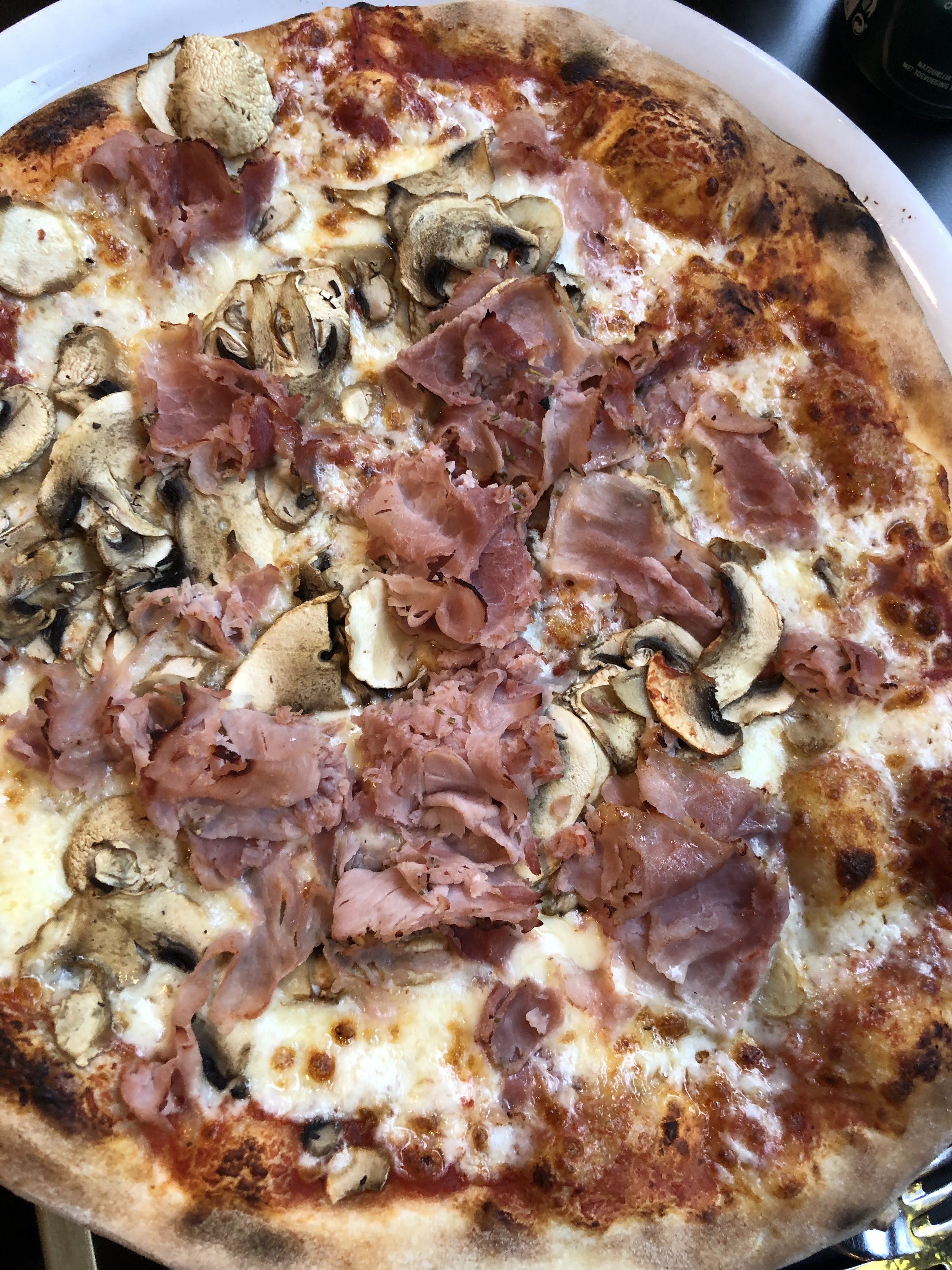 Une magnifique pizza avec crème de truffe champignons jambon speck et roquette dans une belle ambiance chauffée. Très agréable endroit.
