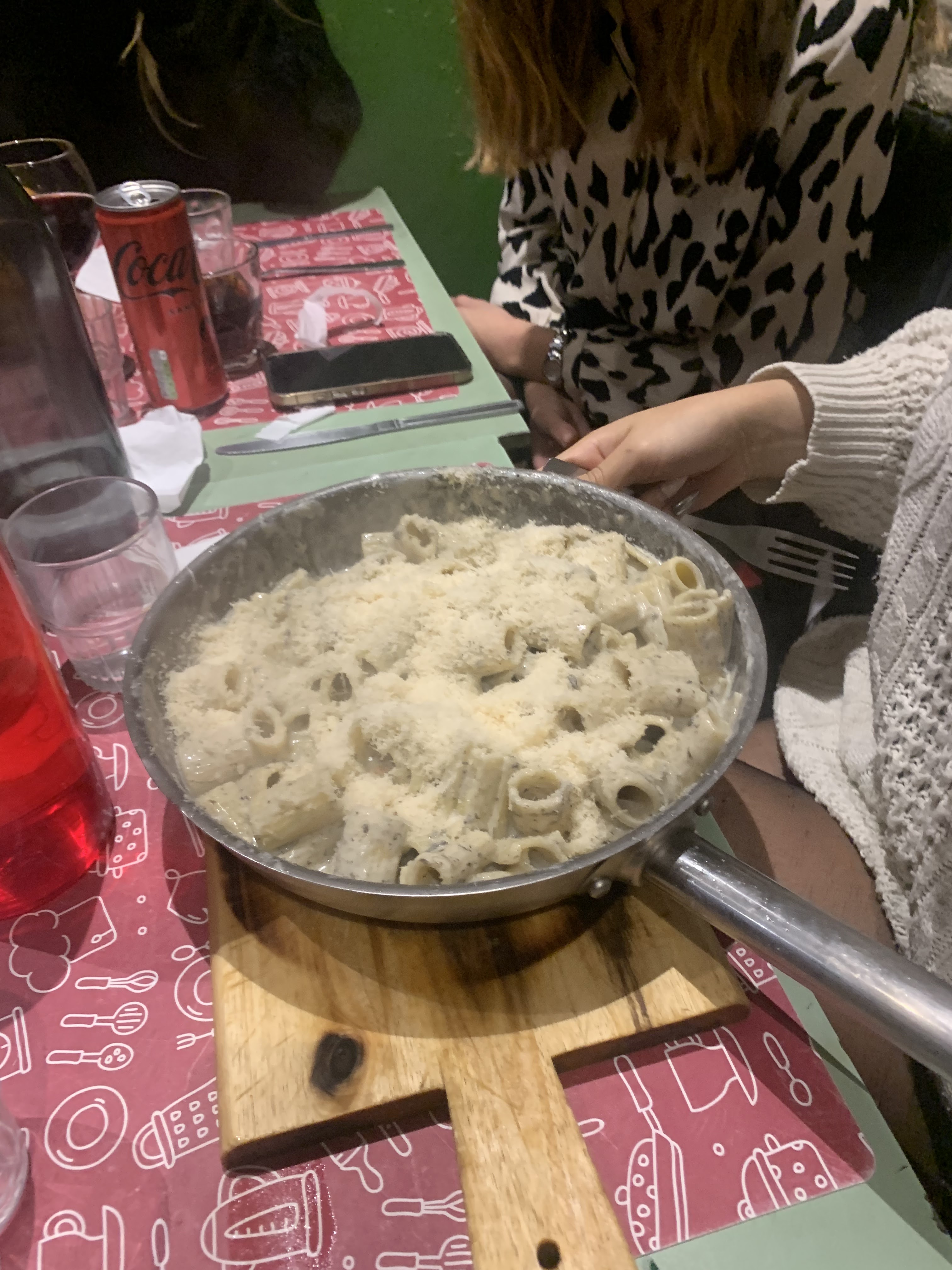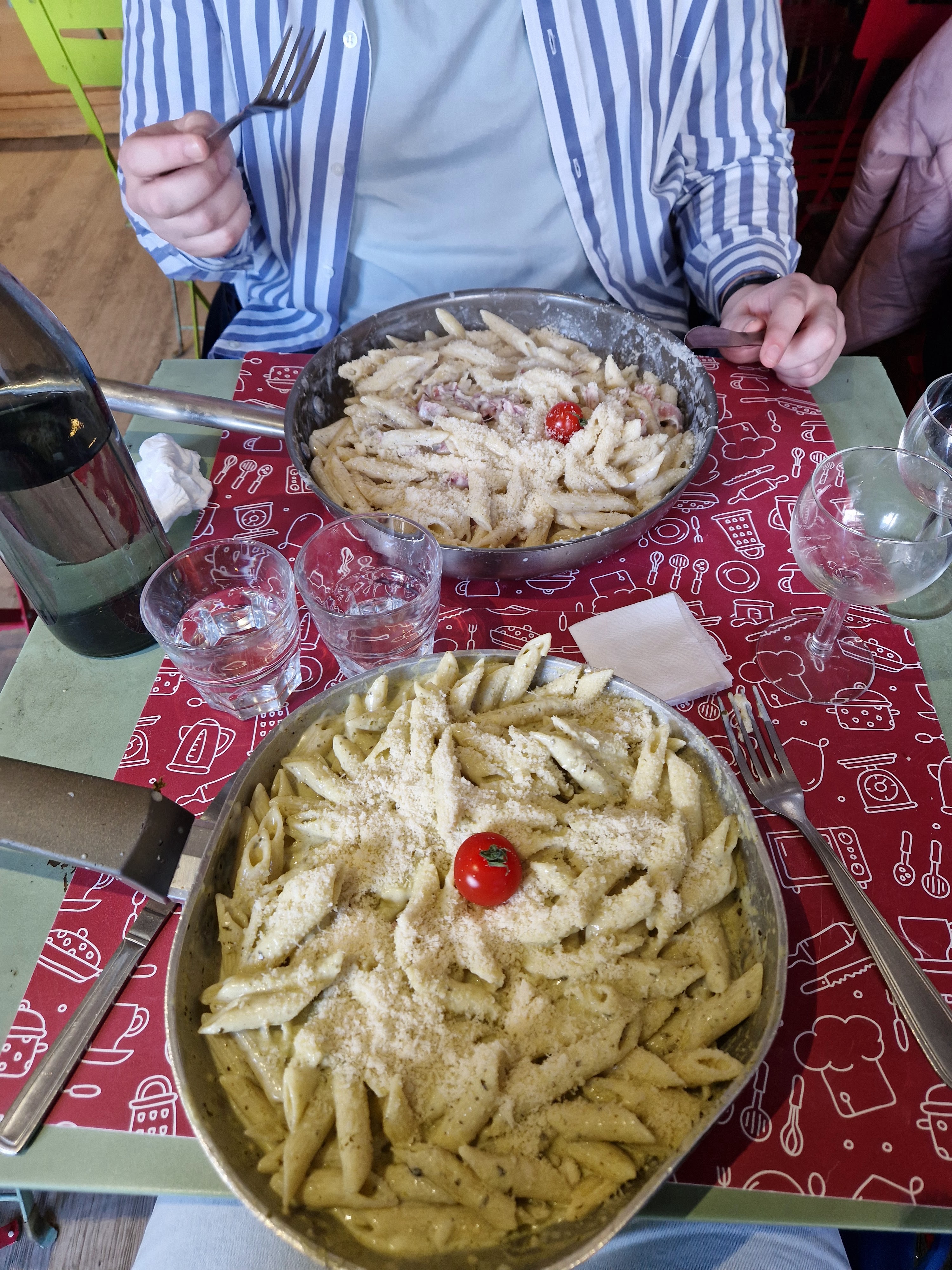 Quantités faramineuses, lemociello, pizza ET tiramisu offerts après avoir été servi de pâtes en quantité gargantuesque pour seulement 15€. Par contre, plutôt très gras, mal présenté, et qualité des produits qui me semblent pas au top, tout comme l'hygiène... On mange dans des poêles, sans assiette, peut être comme a la maison, sauf qu'on est au resto, je suis pas fan du concept. Personnel agréable cependant