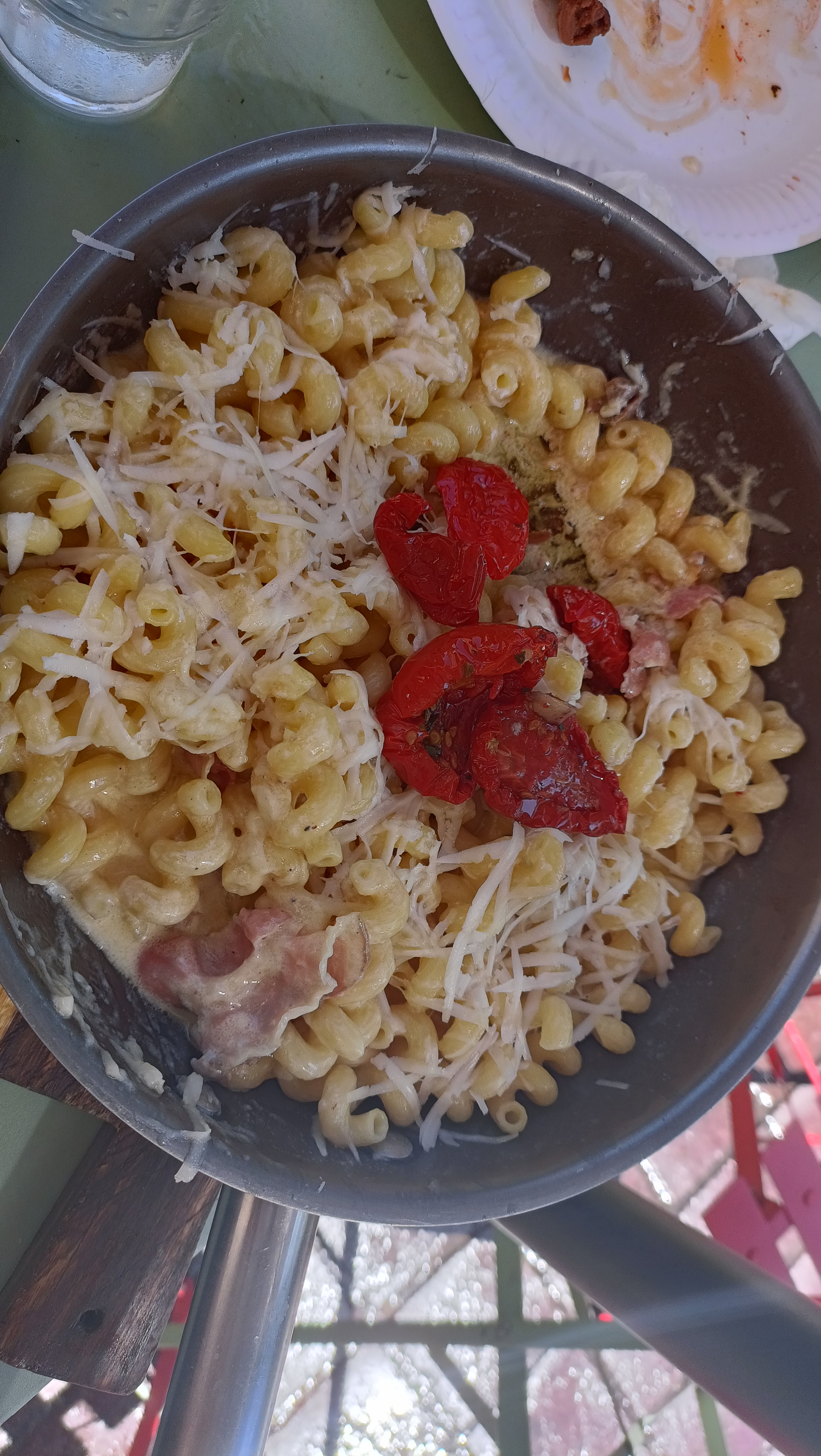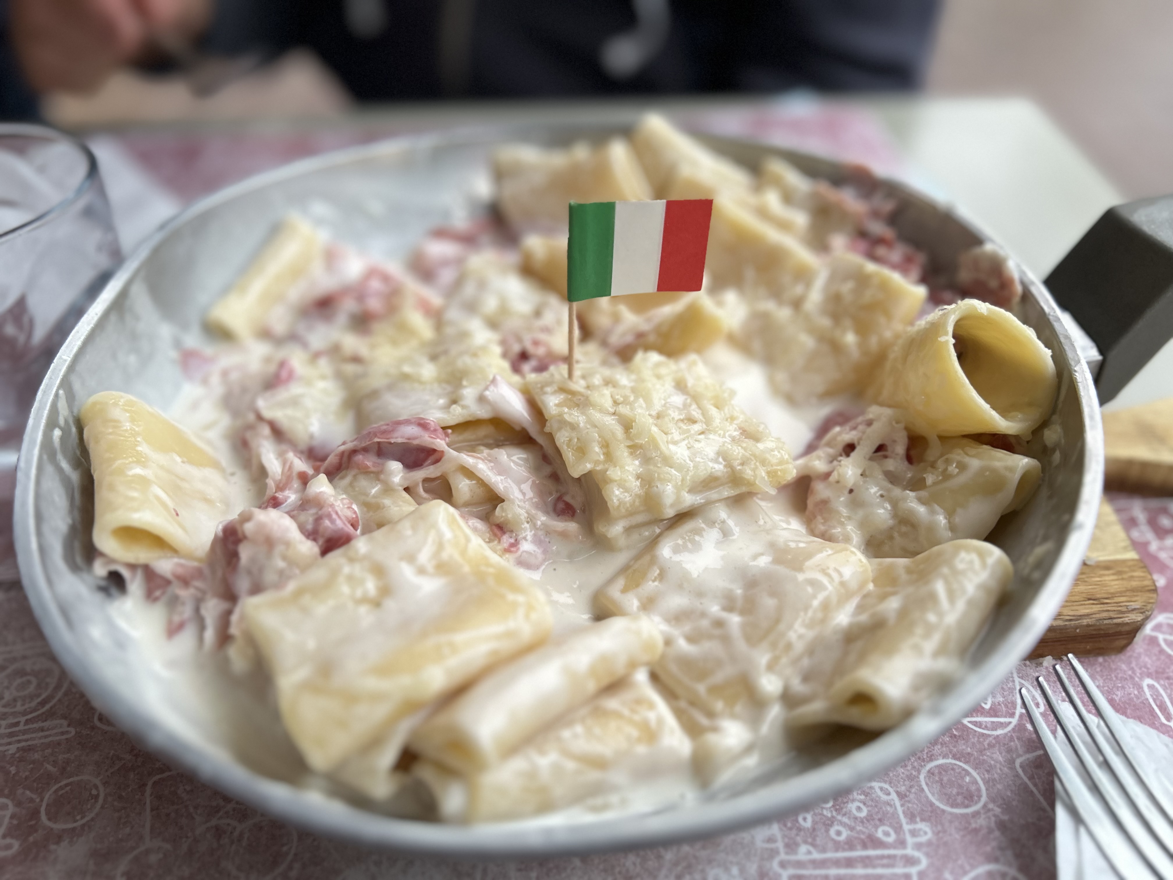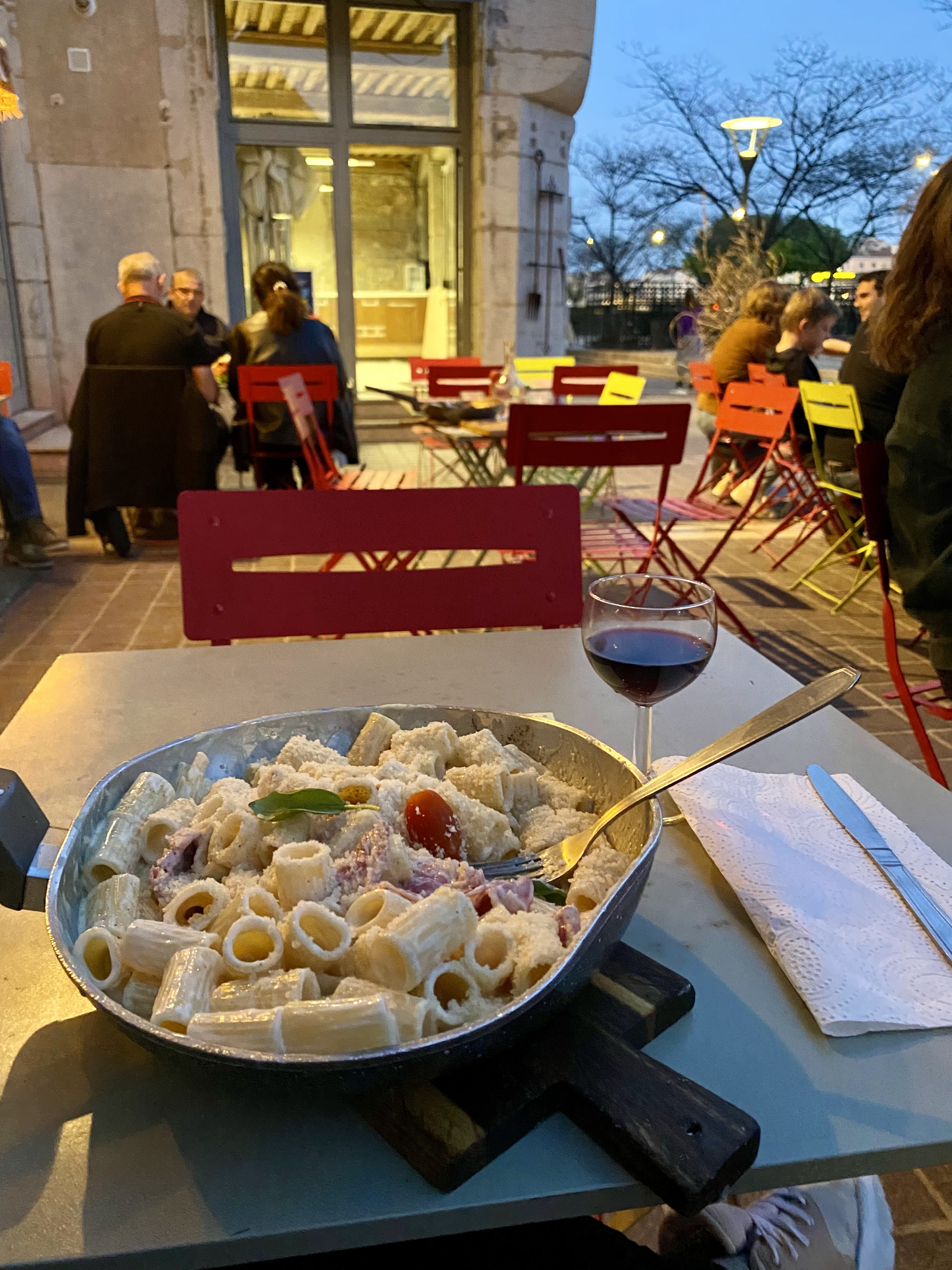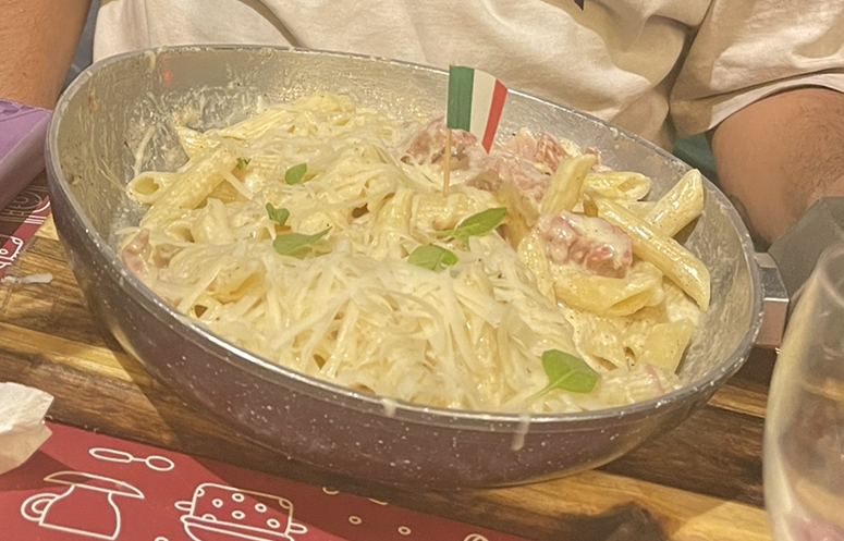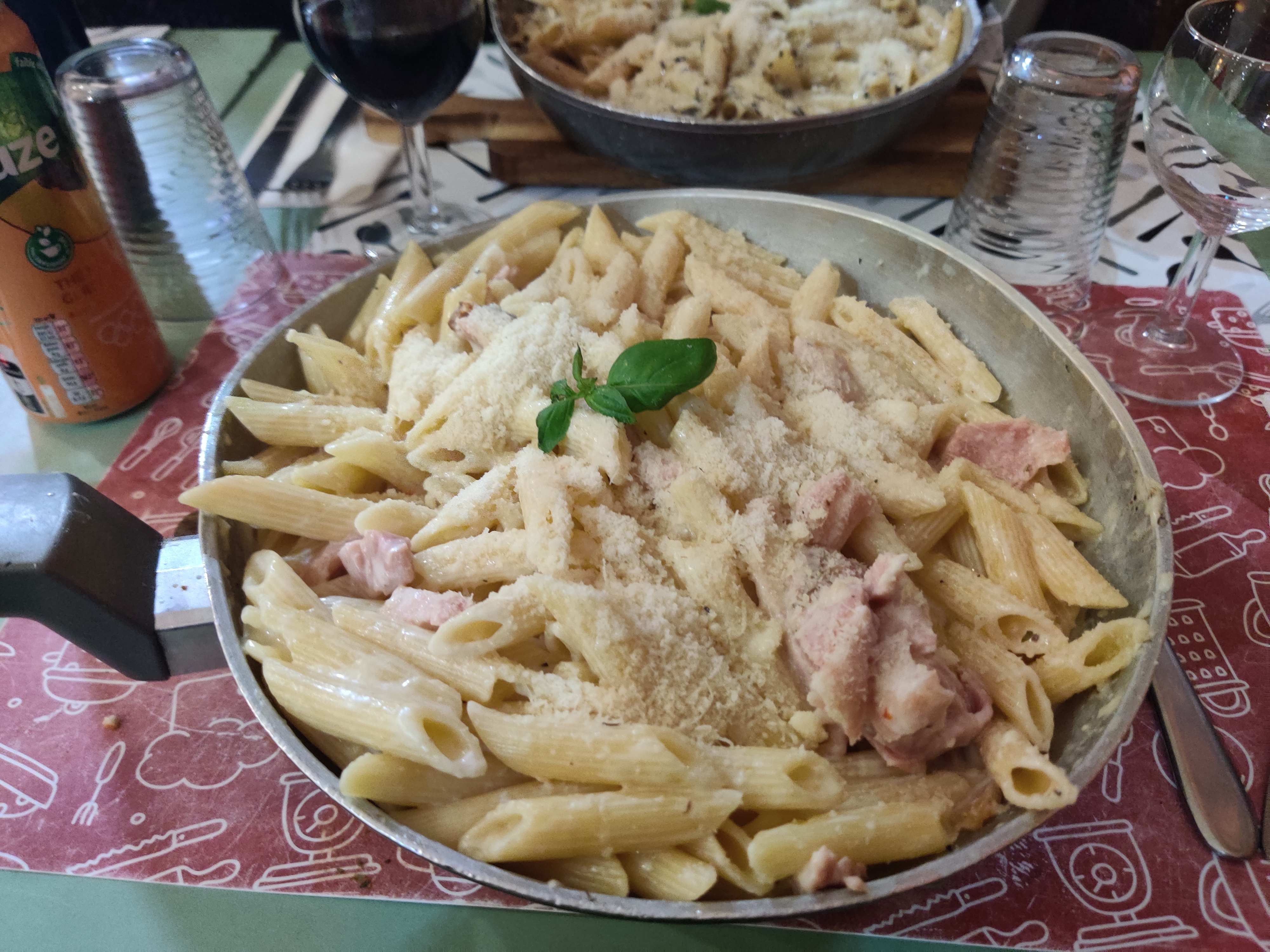 Dans les points positifs : l’emplacement, le fait qu’il y ait un petit parc pour les enfants à portée de regard, un service sympa. Mais par contre, au niveau de la cuisine, ça ne l’a pas fait, en tout cas pour nous tous (2 enfants, 2 adultes: on a pris des pizzas, une salade burrata et des pâtes > tout le monde a trouvé ça mauvais, même les kids). Par exemple, les carbonara. Passons sur l’idée qu’elles ne respectent pas la recette italienne (les goûts et les couleurs…). Mais elles baignent (littéralement) dans la crème fraîche, avec un peu de jambon (blanc). Alors oui, il y a de la quantité. Mais pour 18 euros, je pense qu’on peut faire bien mieux. Servies dans la poêle, c’eut été marrant si le plat était fin, mais là, ça m’a remis à mes 20 ans, en rentrant de soirée. Nous avons pu en discuter avec le patron, qui m’aura dit qu’il peut s’adapter et qu’il faut juste venir le voir pour lui dire comment on veut ses pates. Donc si vous voulez tenter son restaurant (sa trattoria) n’hésitez pas à lui donner la recette exacte de tous vos plats. Car nous, personne ne nous avait dit ça quand on pris la commande. (Et il y a pas mal de flux niveau clients)