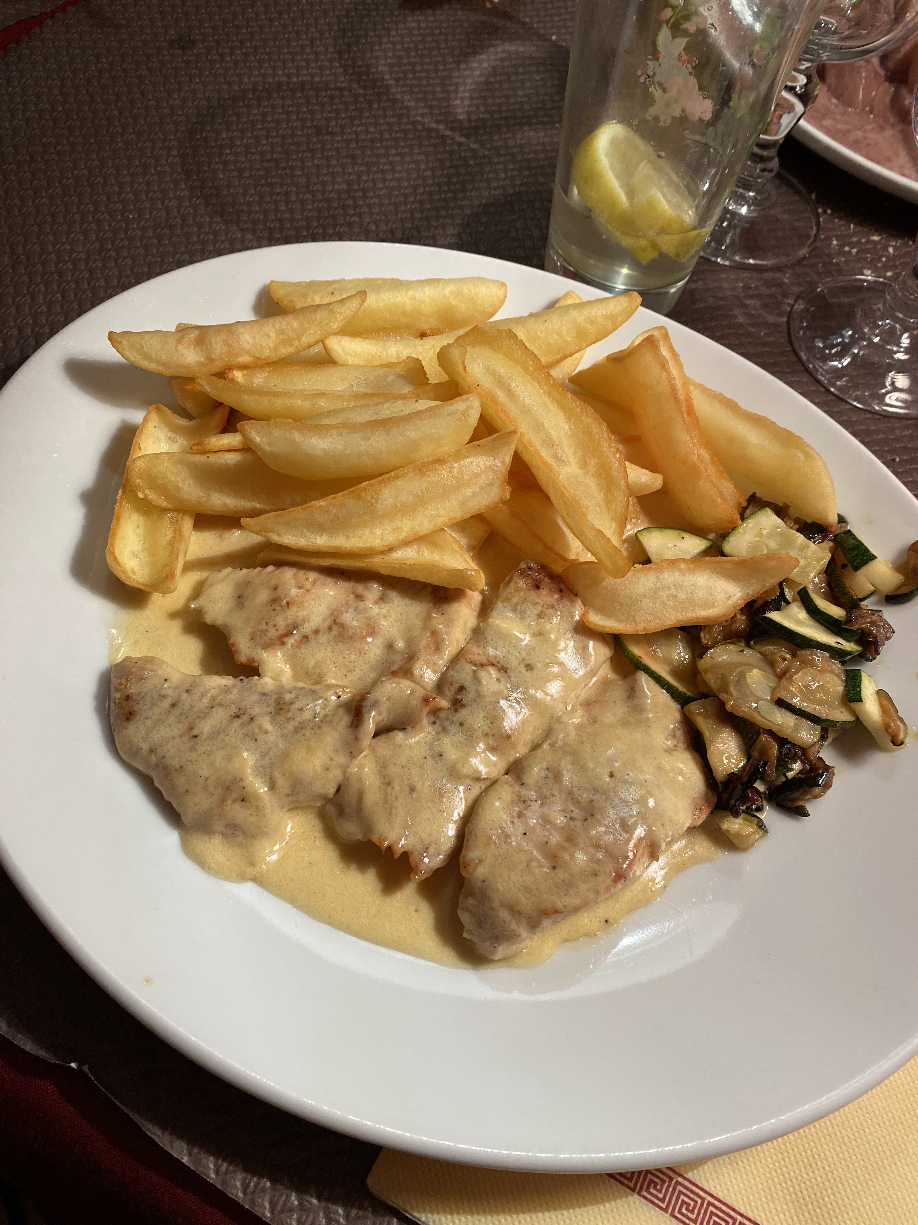 Les modules frites étaient parfaitement cuits et le goût du Roquefort était délicieux. Le pain, les frites épinglées et le vin blanc maison étaient ordinaires.