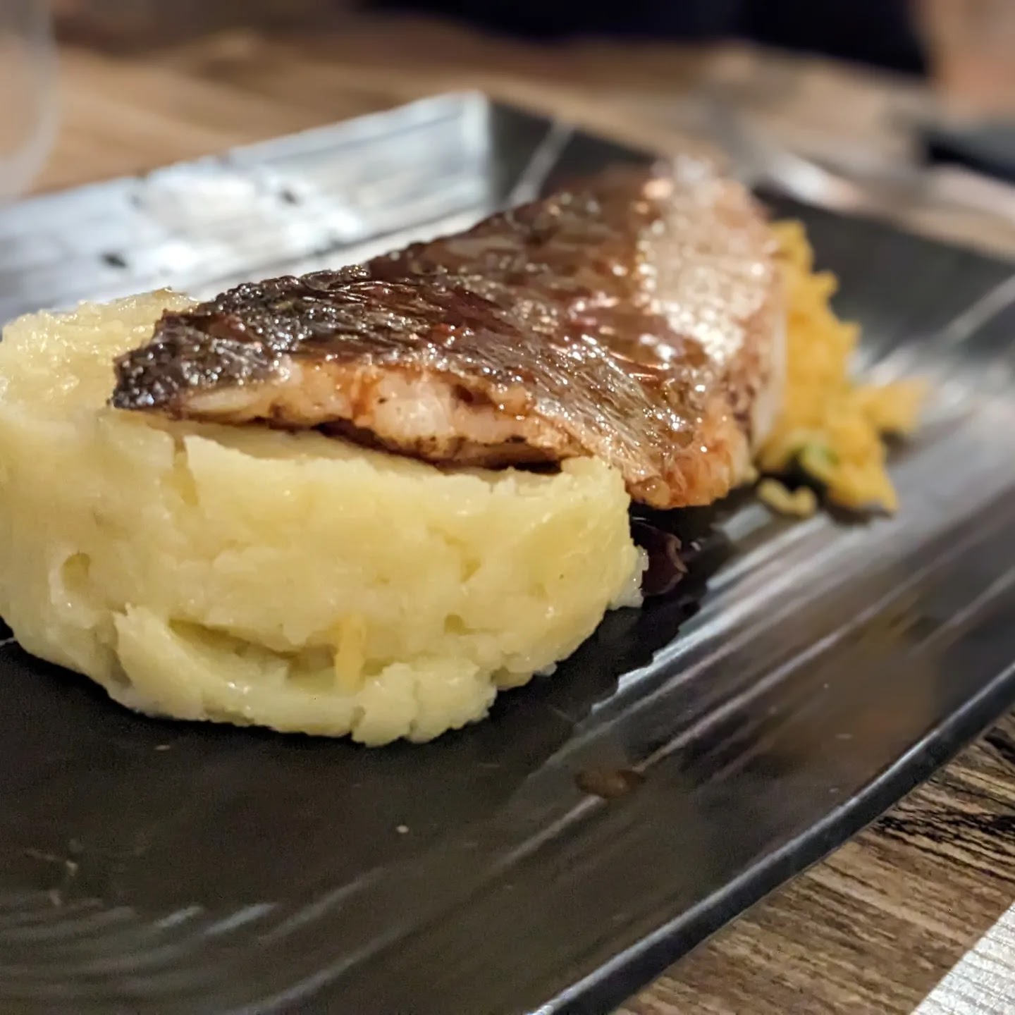 Plat avec le dos de cabillaud = un carré de poisson 3 morceaux de légumes une cuillère à soupe de purée pour 19€ Énormément bruilland avec ce groupe de plus de 30 personnes dans une salle non adapté très désagréable ce bordel on ne s'entendait plus du tout horrible. Et le pompon une des serveuses à découpé du pains 2 morceaux sont tombés par terre et on été remis dans la corbeille vraiment dégoûtant