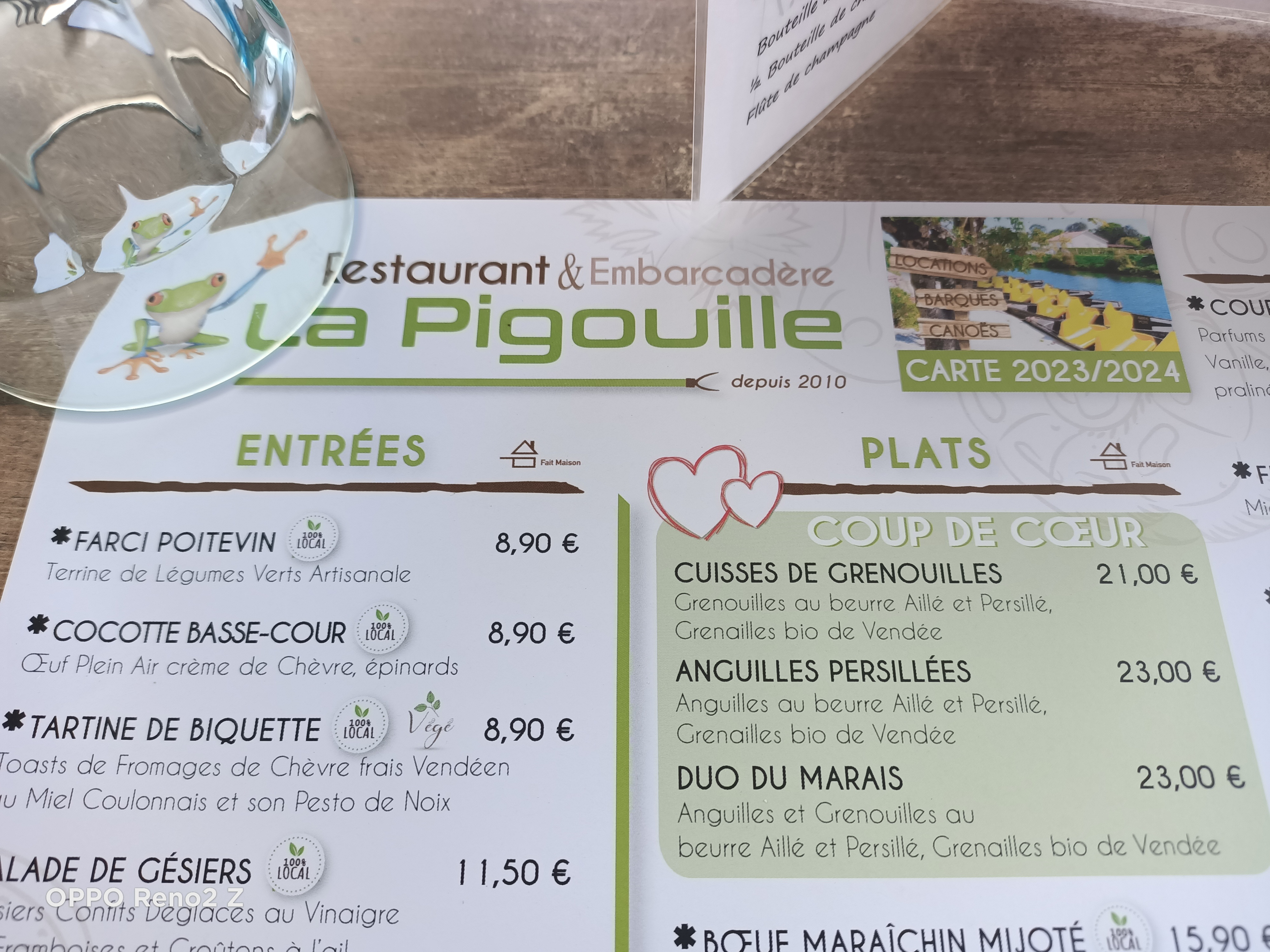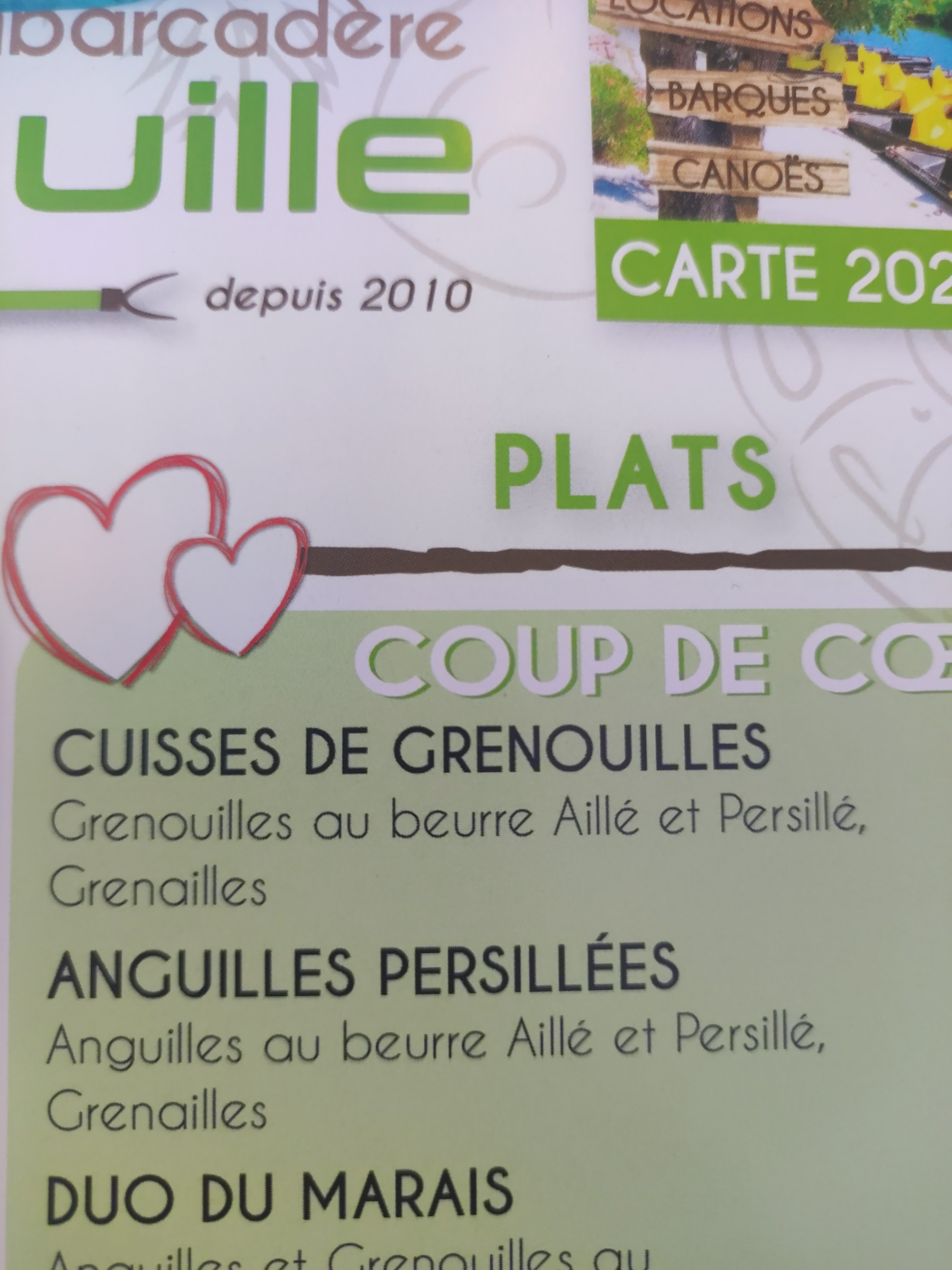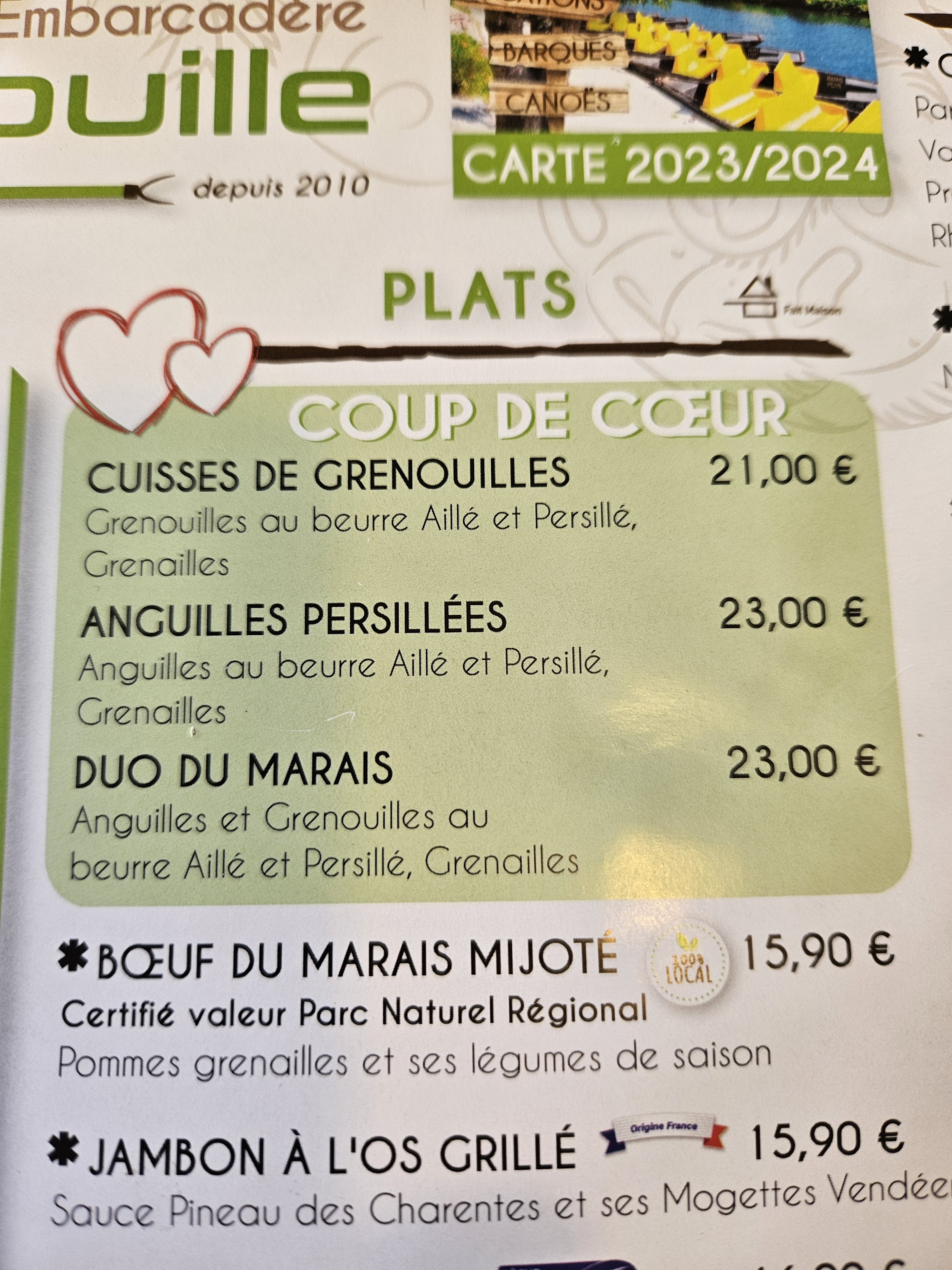 une carte bien fournie avec des spécialités régionales. les entrées sont très fraîches et la viande est de qualité. Les frites sont maisons. l'emplacement est agréable en face des départs de barques et canoës...dans le village de coulon, plein de charme (hors saison). Le service est rapide, souriant....