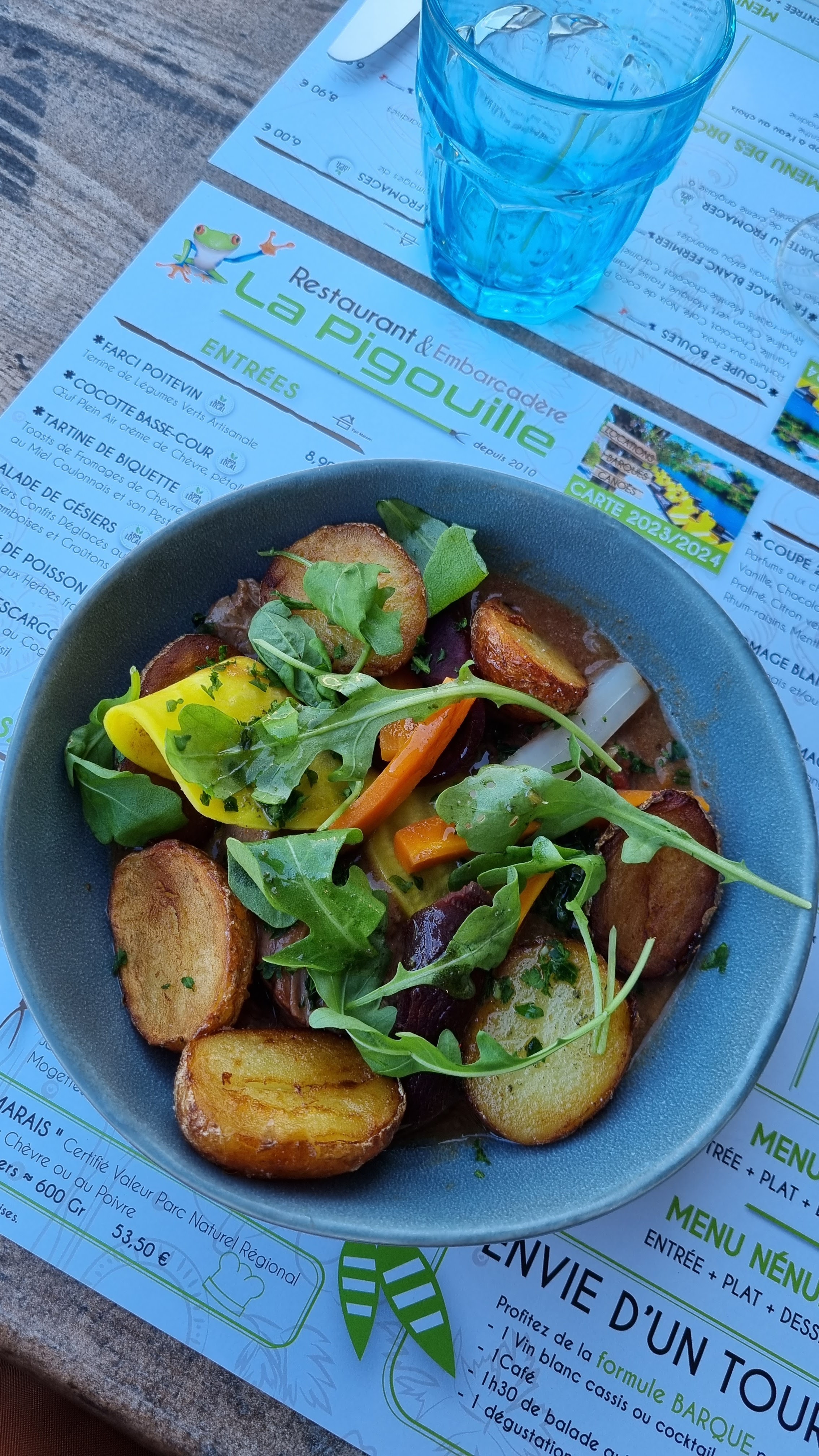 Mangez est faite un tour en barque la formule parfaite. La Pigouille est un très bon restaurant où on est bien accueillis - Les produits locaux sont bien présents comme les anguilles, les cuisses de grenouille et le farcis poitevin - les cuissons sont justes et les assaisonnements bien réussis. Mes conseils : prenez la formule Barque à 16€ par personne, le prix est intéressant, vous aurez avec un café, un kir et une dégustation d'apéritifs locaux (Trouspinette) à 2 pas du restaurants à votre retour de ballade avec Guide (1h30). Mais attention, si vous commandez un apéro, vous vous retrouverez avec 2 verres en même temps et le café arrivera surement avant le dessert. Un petit bémol sur les températures des vins et apéritifs qui manquent un peu de fraicheur à mon gout. Coté prix le plat phare est à 22€, c'est un peu cher mais vous ne serez pas déçu.