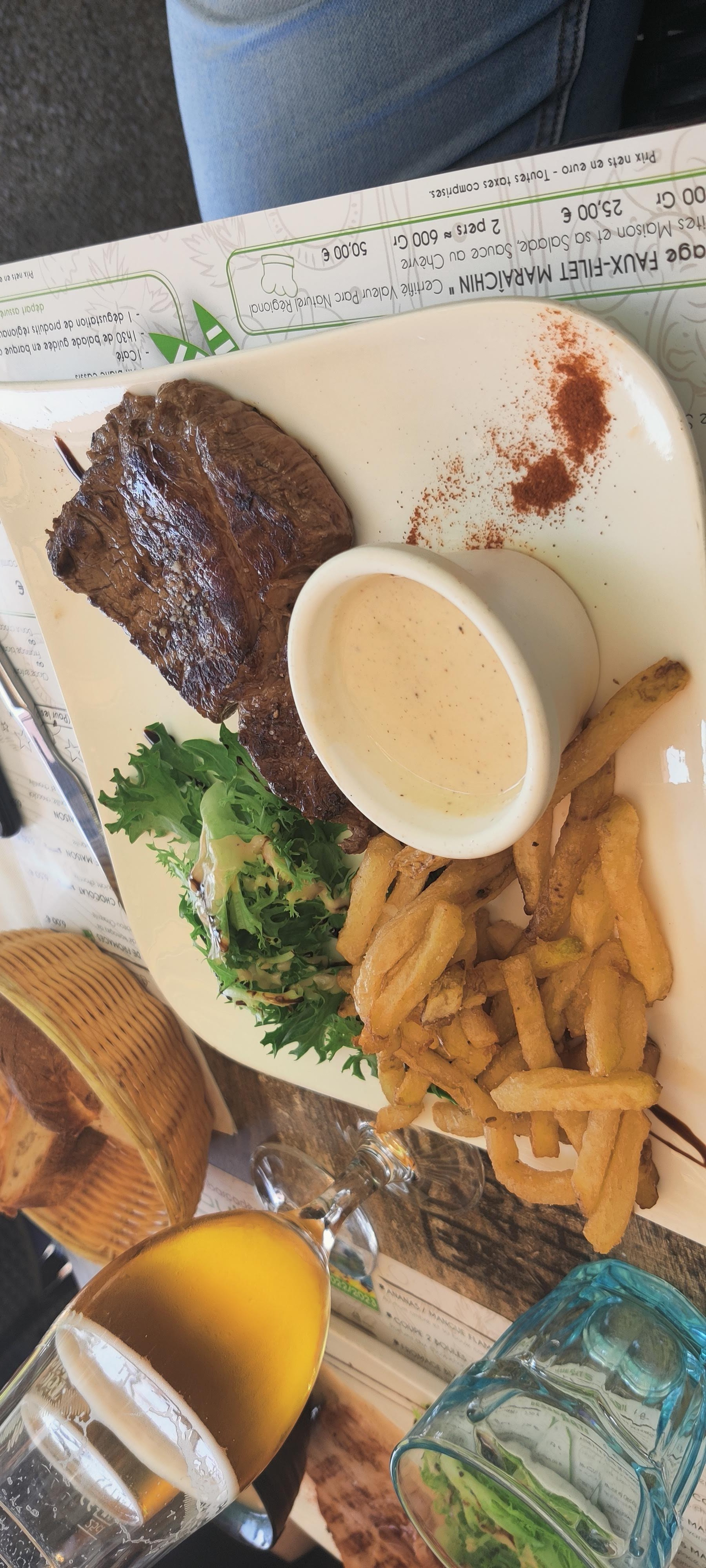 Menu iris à 22€ assiette copieuse, aliment de bonne qualité. Service sympathique. Nous avons fait une balade de 1h30 sur les marais superbes. Je recommande cette adresse