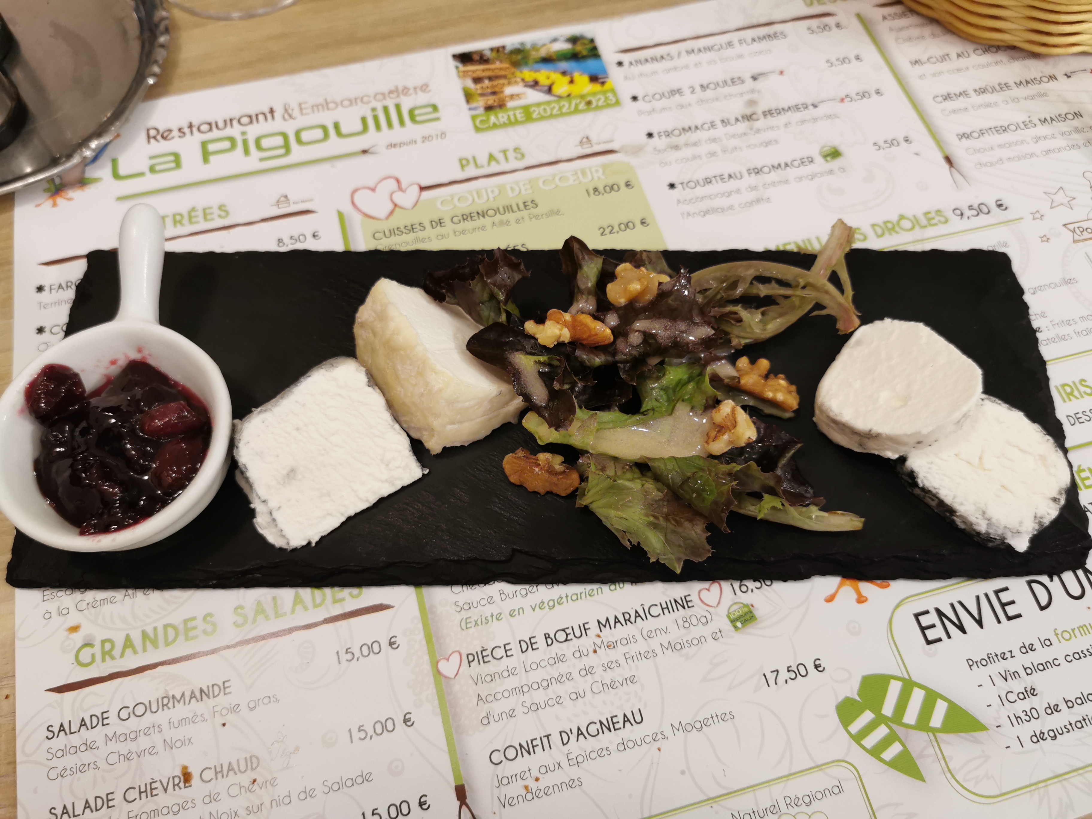 Produits 100% local escargots anguilles cuisses de grenouilles plateau de fromage de chèvre Attention réservation conseillée