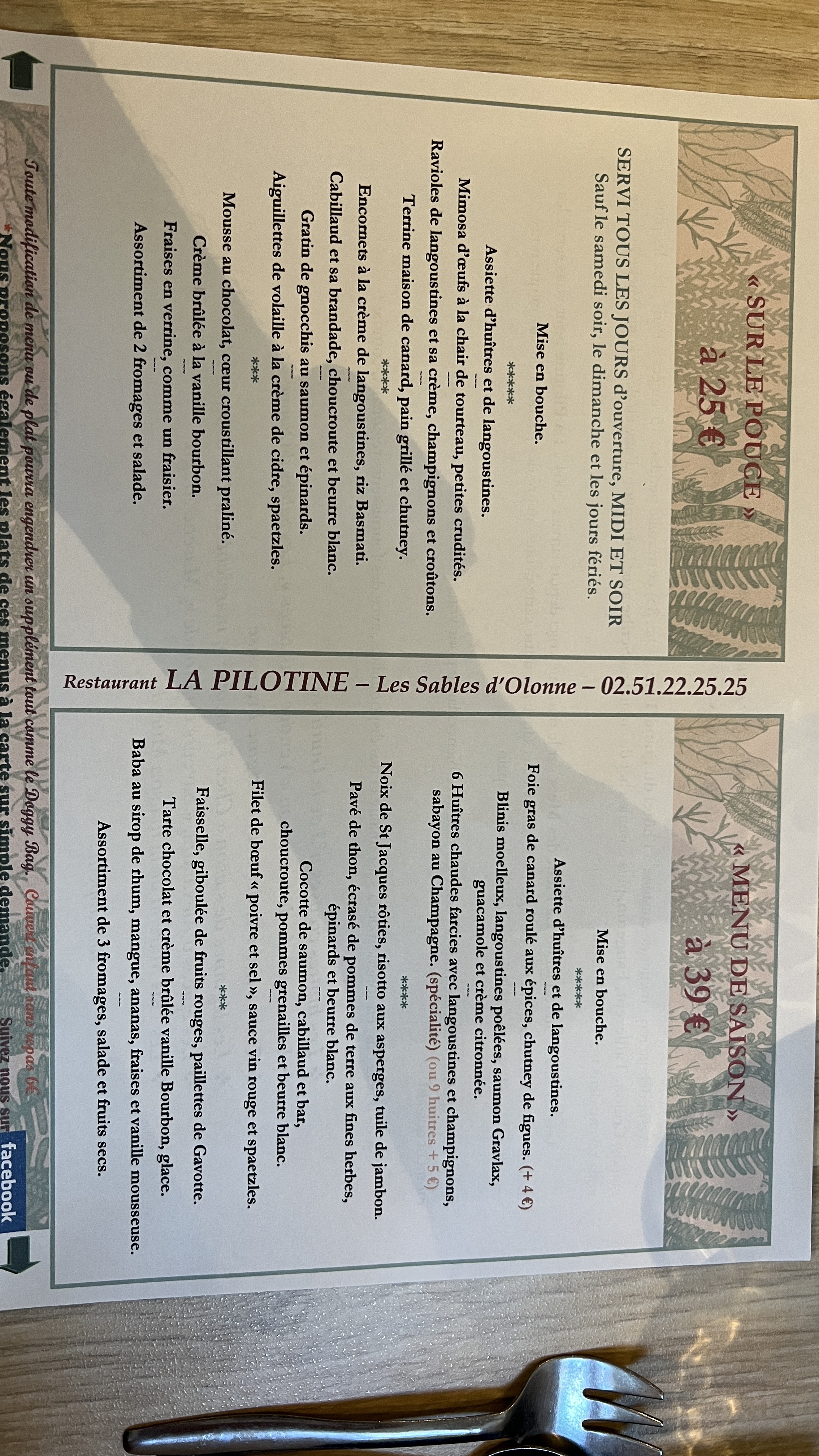 Le menu Sur le pouce à 18€ est déjà attrayant avec amuse bouche, entrée, plat et dessert. Pour l'anniversaire de ma femme, nous avons pris le menu De saison à 32€. Le choix est large à chaque étape du repas. Nous sortons pleinement satisfaits. Les différents plats étaient pleins de saveurs et en quantité très suffisante. Le service est rapide, efficace et convivial. Nous habitons à moins d'une heure de La Pilotine, nous ne manquerons pas d'y retourner et de recommander cet établissement à nos amis.