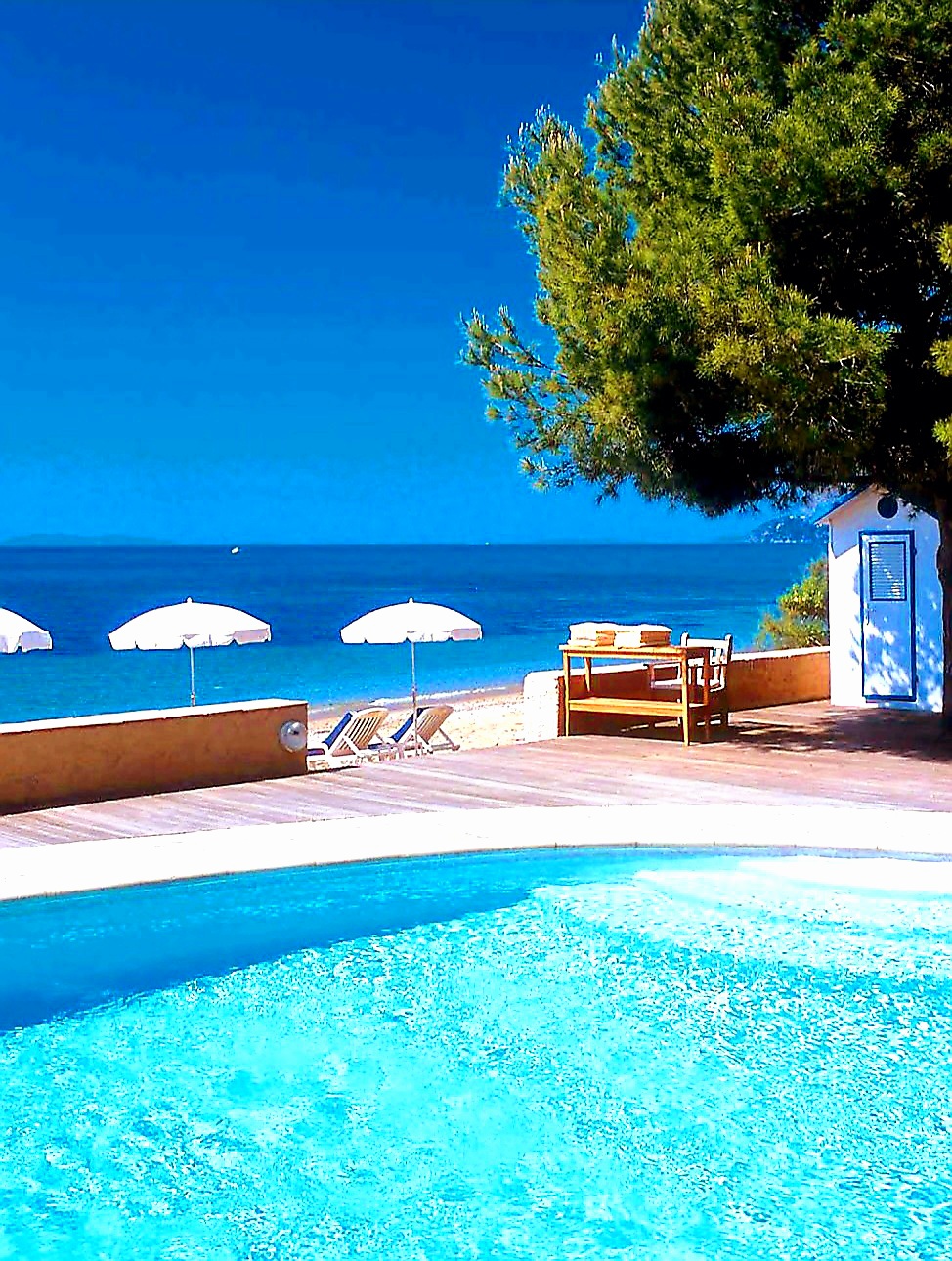 Il reste encore des endroits les pieds dans l'eau ,sur cette côte d'Azur .Cet hôtel offre un cadre idyllique avec ses beaux pins et sa plage bien équipée de parasols et bains de soleil .un grand parking ombragé et fermé vous attend à l'entrée . L'accueil est agréable et avenant .c'est un lieu de détente idéal pour les familles avec sa piscine et ses activités de plage . Cependant , il faut que led plagistes surveillent le matériel ,afin de ne pas être emprunté par les touristes des plages publiques. Excellente restauration avec poisson frais et de bons vins locaux . Nous reviendrons en séjour en choisissant une période hors vacances scolaires , comme Septembre ,car ici on peut profiter de l'eau claire de la mer et faire des ballades . Direction à l'écoute de sa clientèle. C'est bien .☺