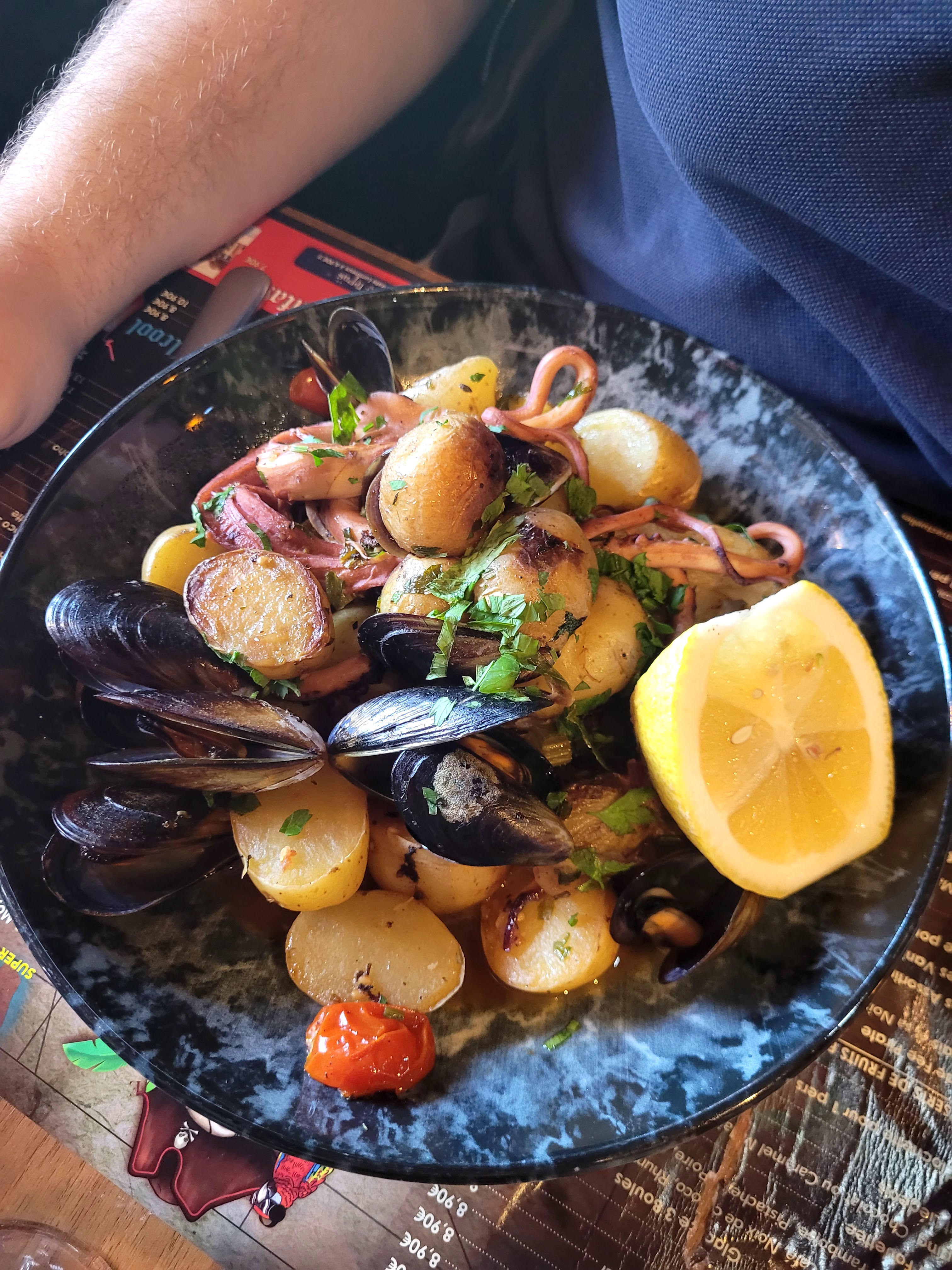 - Lieu agréable car belle décoration, bonne ambiance pirate, restaurant très animé -Serveur très gentil mais service en revanche relativement long (30/40 minutes d’attente) - Carte variée mais centré sur les moules et les produits de la mer (ce qui est normal), le reste de carte est classique (entrecôte, saumon, burger gourmets) etc etc - Mon plat: plat très moyen, voir pas très bon du tout, une salade avec des tomates cerises, une buratta, une galette de pomme de terre et UN STEAK demandé SAIGNANT mais reçu très CUIT… si vous voulez manger une semelle bienvenue (j’ai demandé à avoir un autre steak car celui-ci immangeable et on m’a resservi le même encore plus cuit, car ils l’ont passer sur la plaque pour le chauffer) Voir photos, dans l’ensemble expérience mauvaise et prix bien au dessus de la qualité