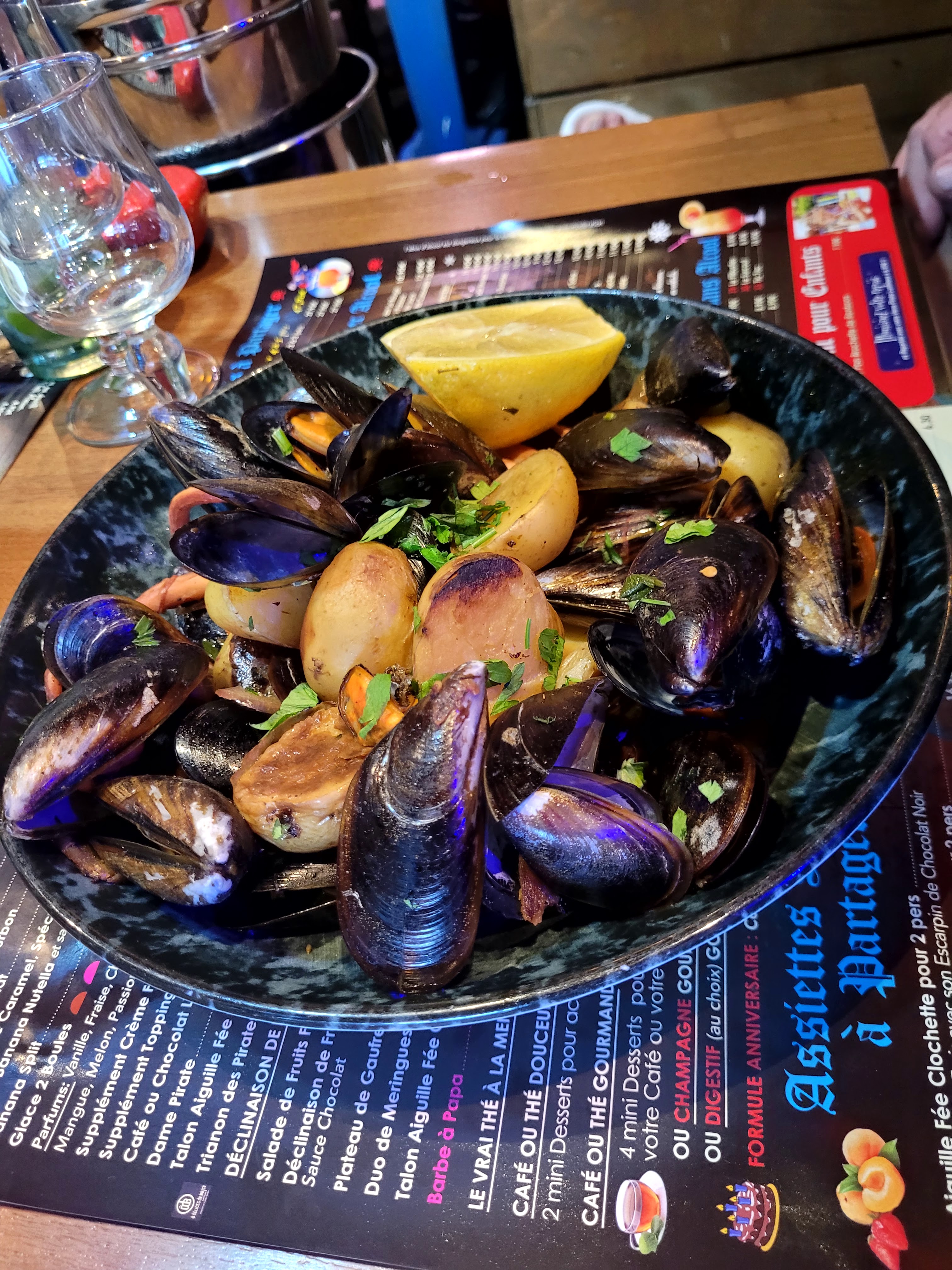 La carte est assez fourni il y a beaucoup de choix que ce soit à l'entrée plat dessert. Les moules sont très bonnes. L'ambiance est vraiment très sympa, ils fêtes les anniversaires des enfants avec beaucoup d'enthousiasme. Un bon moment à passer.