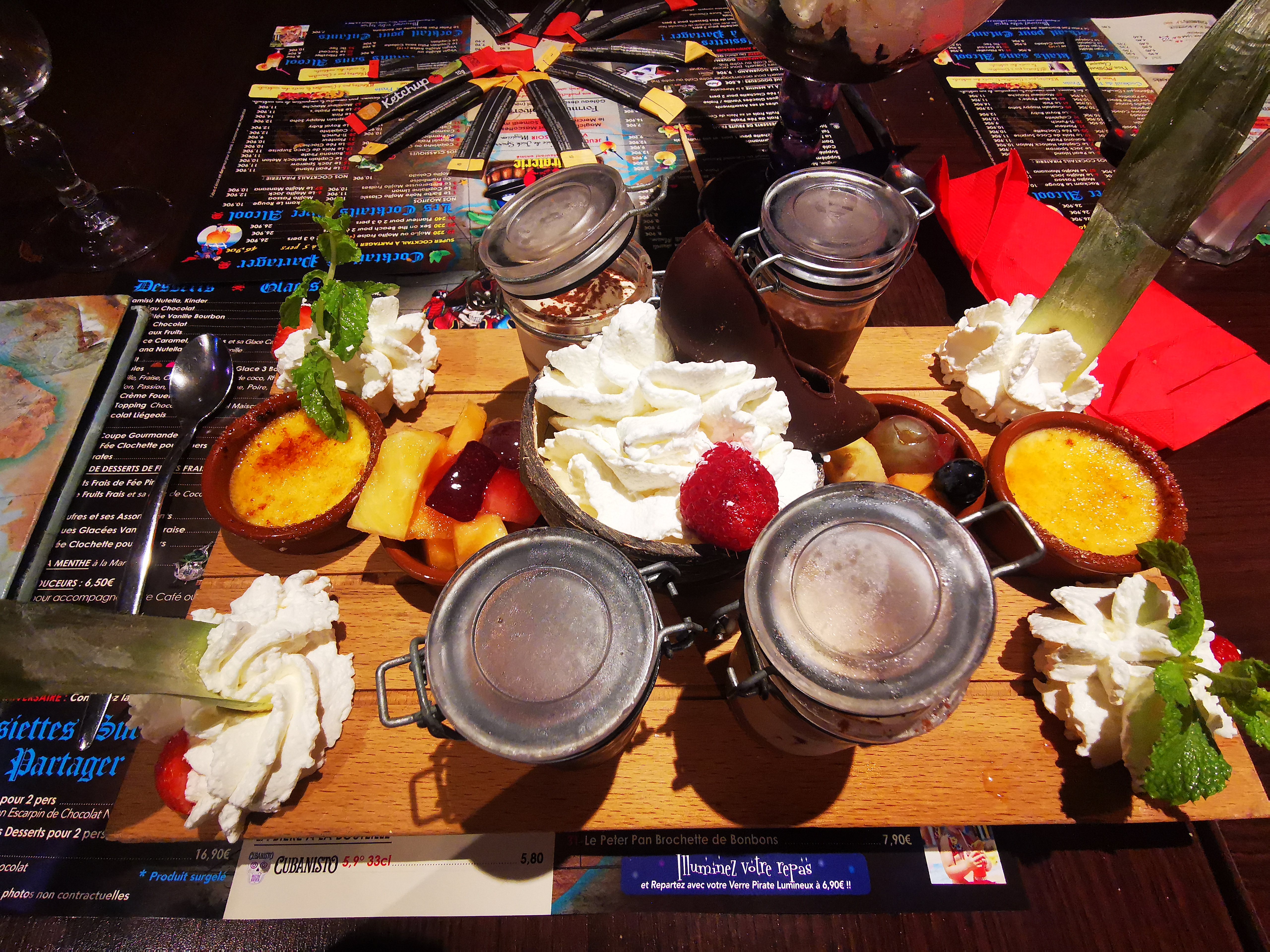 Nous avons passé un bon moment en famille. Jeudi soir animation Jack Sparrow, le personnage est fort sympathique et passe de table en table plaisanter avec les différentes personnes. Le service est top, pas d'attente excessive, serveurs souriants et efficaces. Côté cuisine c'est là que le bas blesse, le rapport qualité prix est particulièrement mauvais. En apéro les cocktails sont sans grand intérêt, le Monaco peu gazeux. En plat nous avons pris des moules cocotte (sauce crème fraîche) sans aucun goût et de très petite taille, l'assiette rustique est très pauvre pour le prix (camambert rôti minuscule, salade ressemblant à celles en sachet et sans vinaigrette), la planche estivale comportait des tranches de jambon cru d'une épaisseur énorme rendant la chose impossible à marcher. Le pain proposé en corbeille ressemble aux baguettes 1er prix des grandes surface. Les burgers, frites (maison) étaient bons. Les desserts pas mal mais à des prix excessifs.