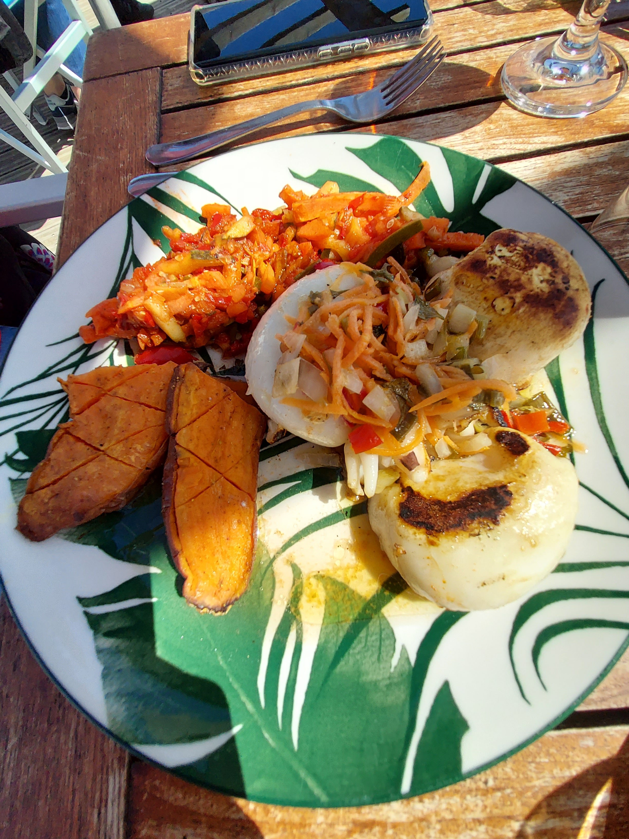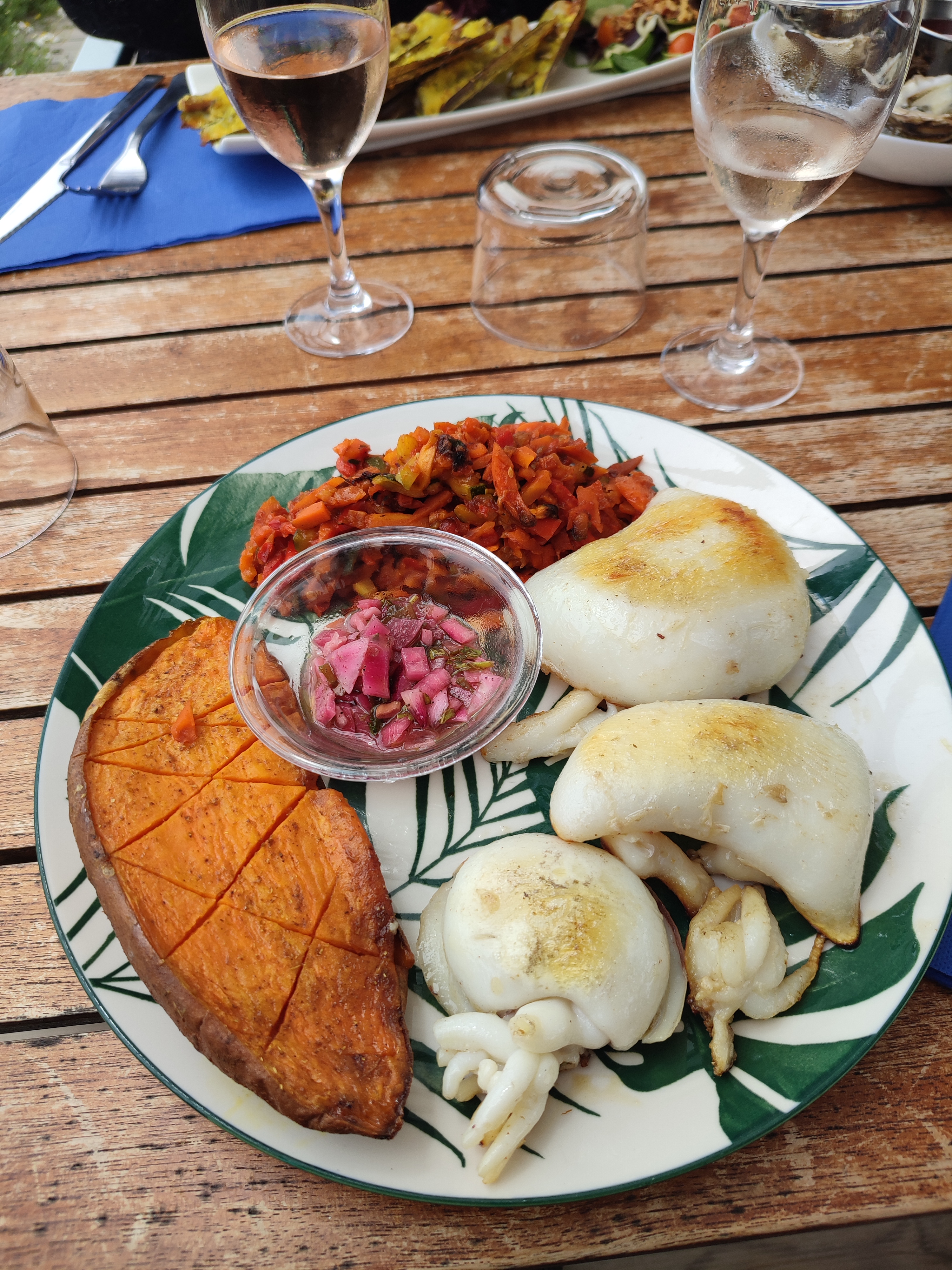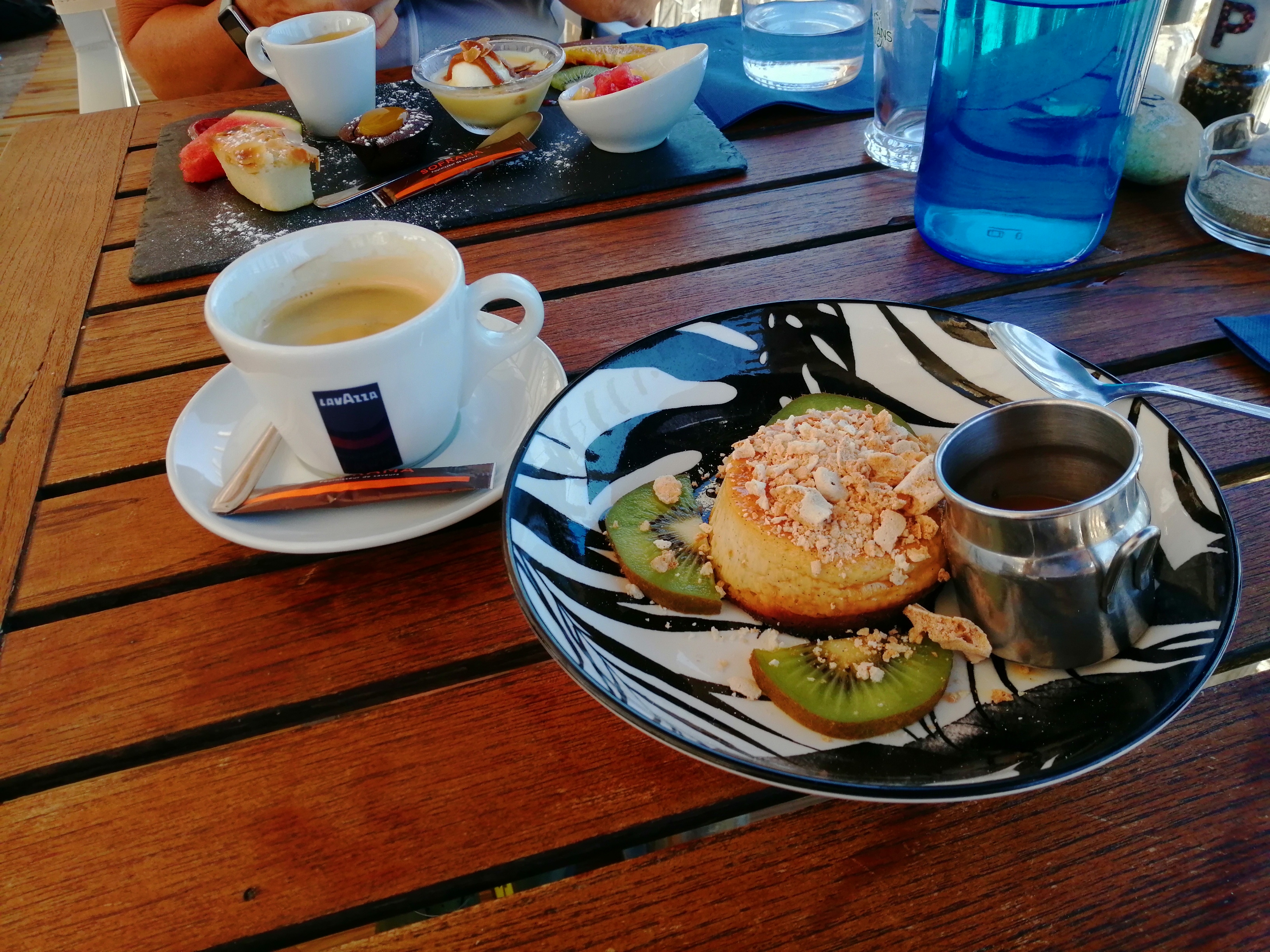 La vue est magnifique, encore plus si vous avez la chance d'avoir une place sur la terrasse sur la plage, pour ça assurez-vous bien de réserver ! C'est cette vue qui relève bien la note, sans elle j'aurai mis 3 étoiles, car vu le prix (16€ une salade, 19€ une plancha) on pourrait s'attendre à mieux dans l'assiette (la salade remplit son rôle, mais riz trop cuit pour la plancha, et légumes eux pas assez cuits). Les frites avaient l'air bonnes mais je n'y ai pas goûté. D'habitude fan de desserts, j'ai préféré ne pas y goûter, rien d'attirant à la carte, et minimum 7€. On retiendra donc surtout la vue (et le service agréable quoiqu'un peu désordonné ce jour là) !