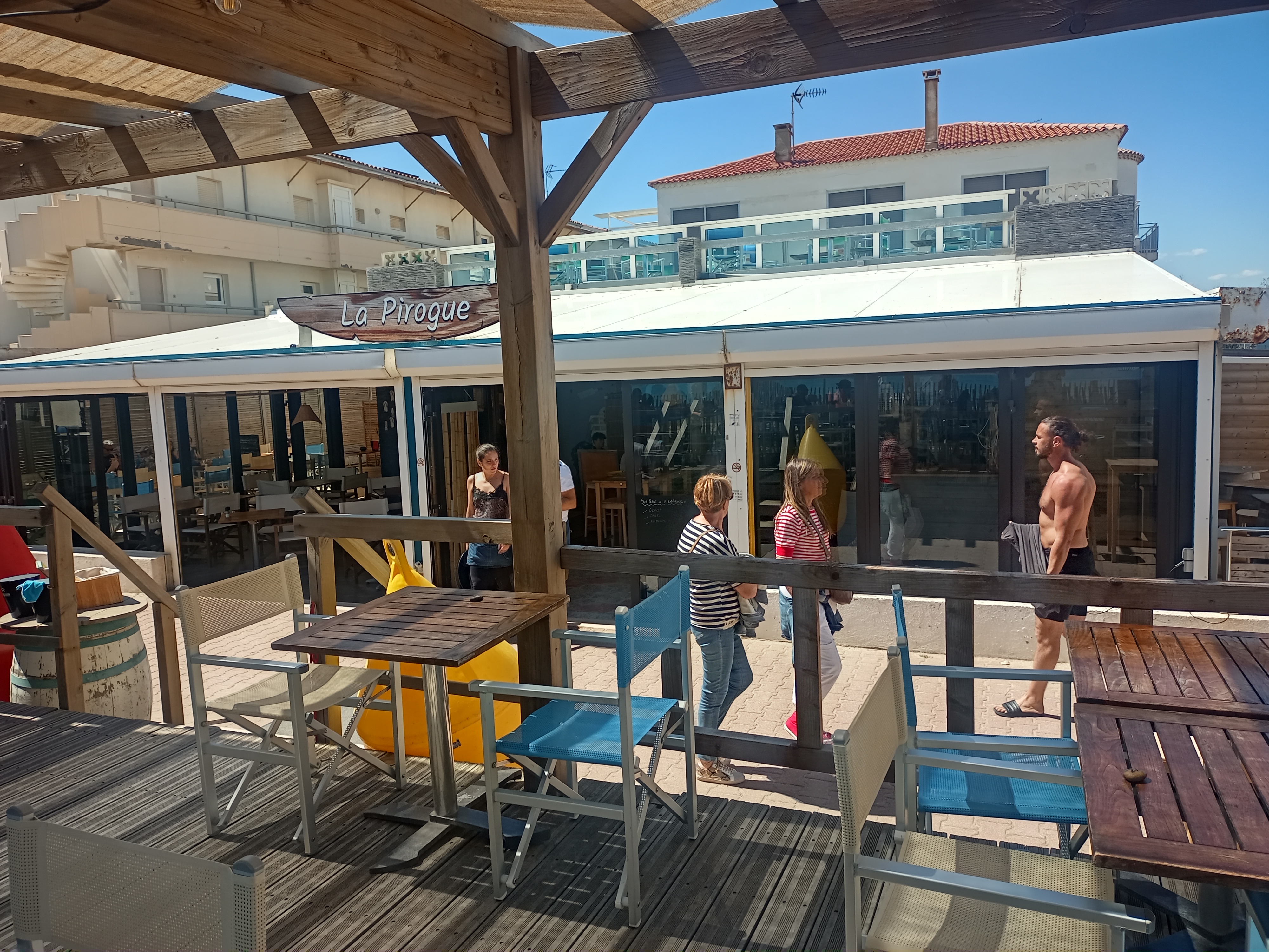 La pirogue, ce restaurant qui ferait presque tâche à nos vacances. Très gros point noir de notre séjour. Qui sont ces gens qui tiennent ce resto ? Le cadre est pourtant très mignon, les plats - sans être fous - sont plutôt corrects. Mais alors l'humain, qu'en faisons-nous ? Nous arrivons à 13h40, certes 10 min en retard. Nous nous en excusons auprès de la serveuse. Nous devons partir avant 15h. Qu'à cela ne tienne ! Nous avons 1h20 devant nous. Suffisant, vous vous dites ? Ahah, optimistes que vous êtes... C'était sans compter sur l'organisation de notre chère pirogue (qui semble bien trouée...) ! On prend notre commande au bout de 5 min, en même temps qu'un autre couple. La serveuse est très gentille, tout va bien. Et le temps passe... et passe... Le couple à côté de nous reçoivent leur entrée d'huitres, puis leurs plats à base de riz (chaud, donc)... De notre côté, le temps se fait long. La serveuse vient plusieurs fois s'excuser, gênée, et nous assure que ça arrive. Nous tâchons d'être bienveillants envers elle, mais nous lui glissons qu'un geste commercial serait appréciable. Le plat arrive finalement, à 14h40. Nous mangeons et finissons à 14h55, pour partir pas trop tard. La patronne vient nous voir en fin de repas pour nous signifier qu'elle ne trouve pas qu'ils aient mis autant de temps que ça, et que c'est normal en fin de service, un dimanche, qu'il fallait venir à l'heure. Ah oui, normal ? Certes nous sommes en tort mais il ne s'agit que de 10 min. S'il est trop compliqué pour vous de gérer des clients en fin de service, un conseil : ne pas prendre de client au-delà de 13h. Donc nous nous retrouvons finalement à être fautifs pour leur propre incapacité à gérer leur clientèle... C'est tout ? Nooooon ! En fin de repas, nous exprimons notre mécontentement et notre désaccord complet avec leur manière de voir les choses. Nous nous faisons insulter et priés de ne jamais revenir. Grande classe, bel accueil, belle mentalité... Alors je vous conseille d'y venir, si vous avez du temps, que l'humain ne vous importe peu, ou si claquer 20 balles pour un plat moyen ne vous gêne pas. SInon, allez plutôt vous régaler à La Plagette, un poil plus loin. Ou au snack juste en face, sur le bord de mer, vous y mangerez tout aussi bien. Bisous.