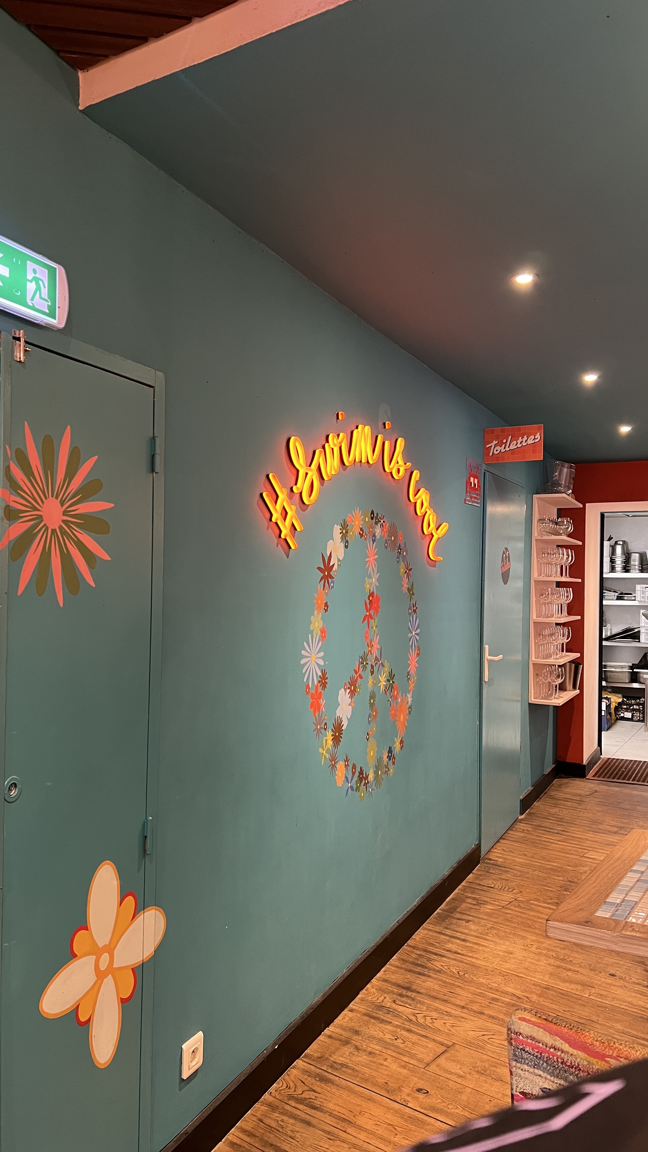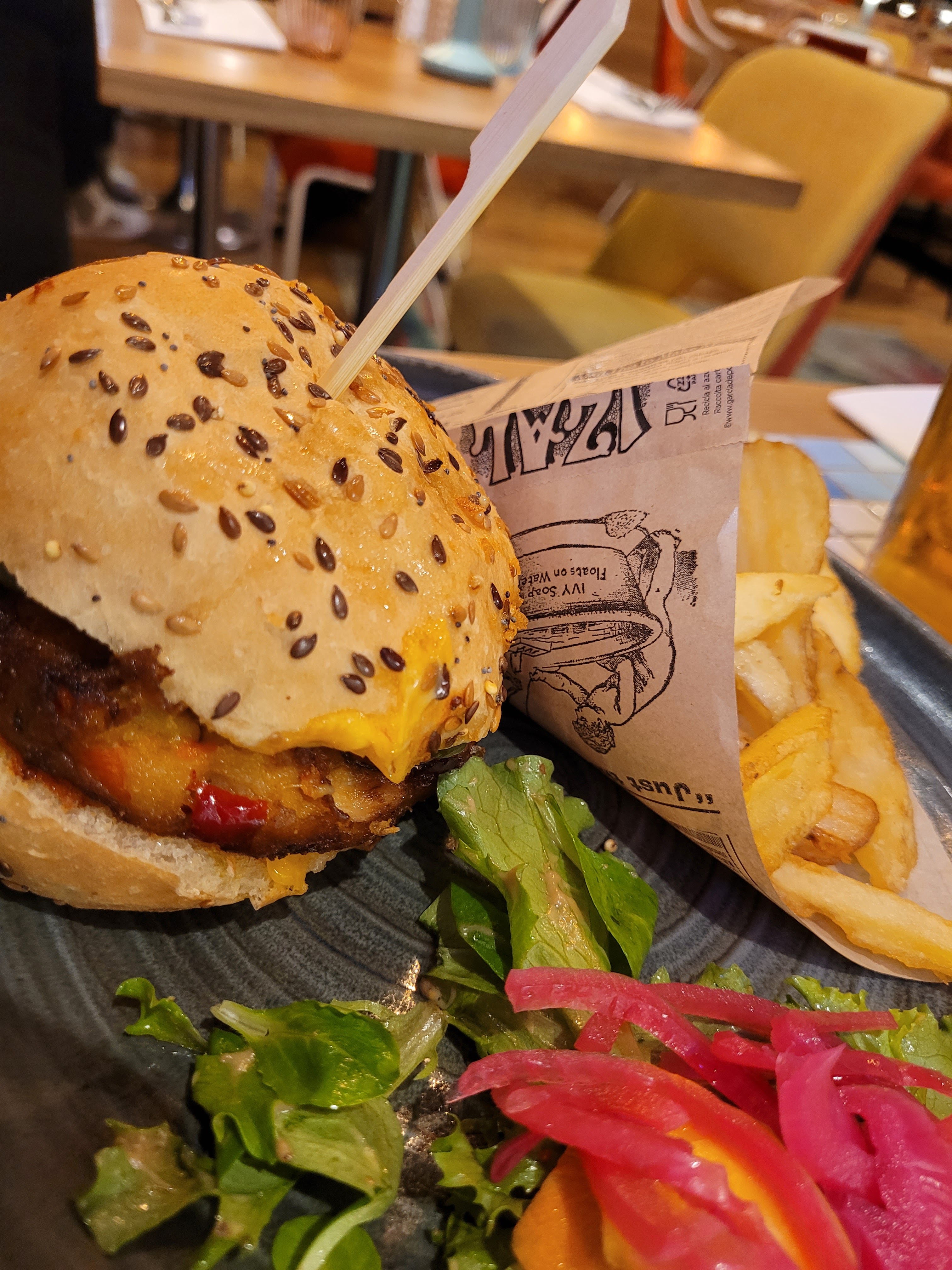 L'ambiance est vraiment géniale avec cette décoration unique. Il y a beaucoup de plats proposés dont des options végétariennes, toutefois c'est peut être aussi pour ça que le goût est bien mais sans plus. Ce n'est pas mauvais, mais ce n'est pas extraordinaire. Les petits pickles c'est top, mais des sauces en sachet pour des frites décongelées ça manque d'effort !