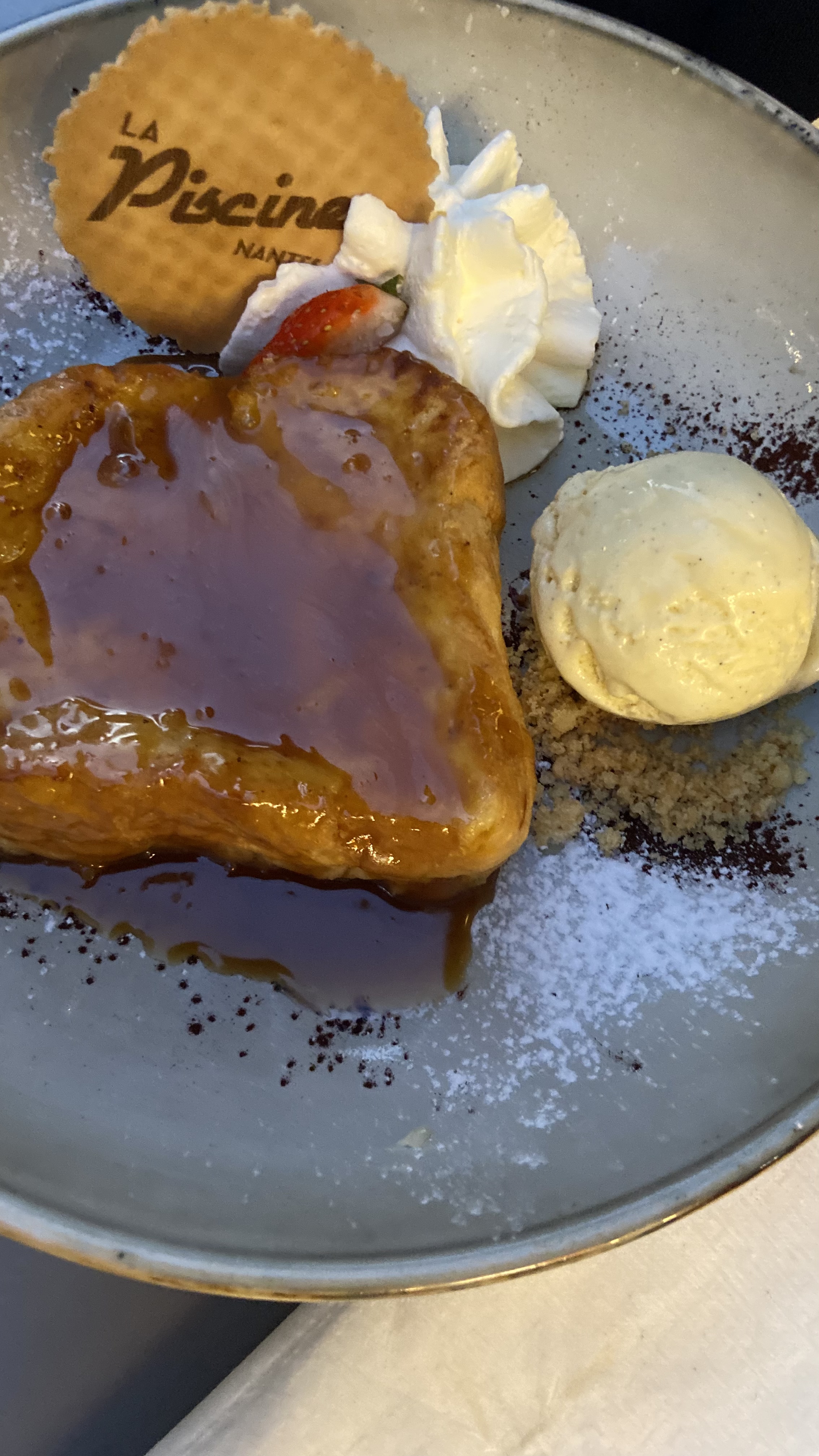 Soirée Décontractée. Le cadre de la Piscine est vraiment atypique, des petits détails dans le restaurant qui amusent et intriguent. La carte propose une belle palette de saveurs où tout le monde peut facilement s'y retrouver. Pour l'entrée: émulsion de légumes et petit tartare de saumon Entrée bien présentée, bon équilibre des saveurs. Le vin est en accords et a bonne température. Pour le plat: Les poissons (saumon et thon) Belle présentation, portion généreuse, l'équilibre sauce, poisson, accompagnement est bonne. Pour le dessert: Brioche perdue et café La brioche généreuse et gourmande le café est de très bonne qualité. Les tables de 2 sont de grande taille ce qui est appréciable. Le dimanche soir le restaurant était très calme et le service était a l'écoute.