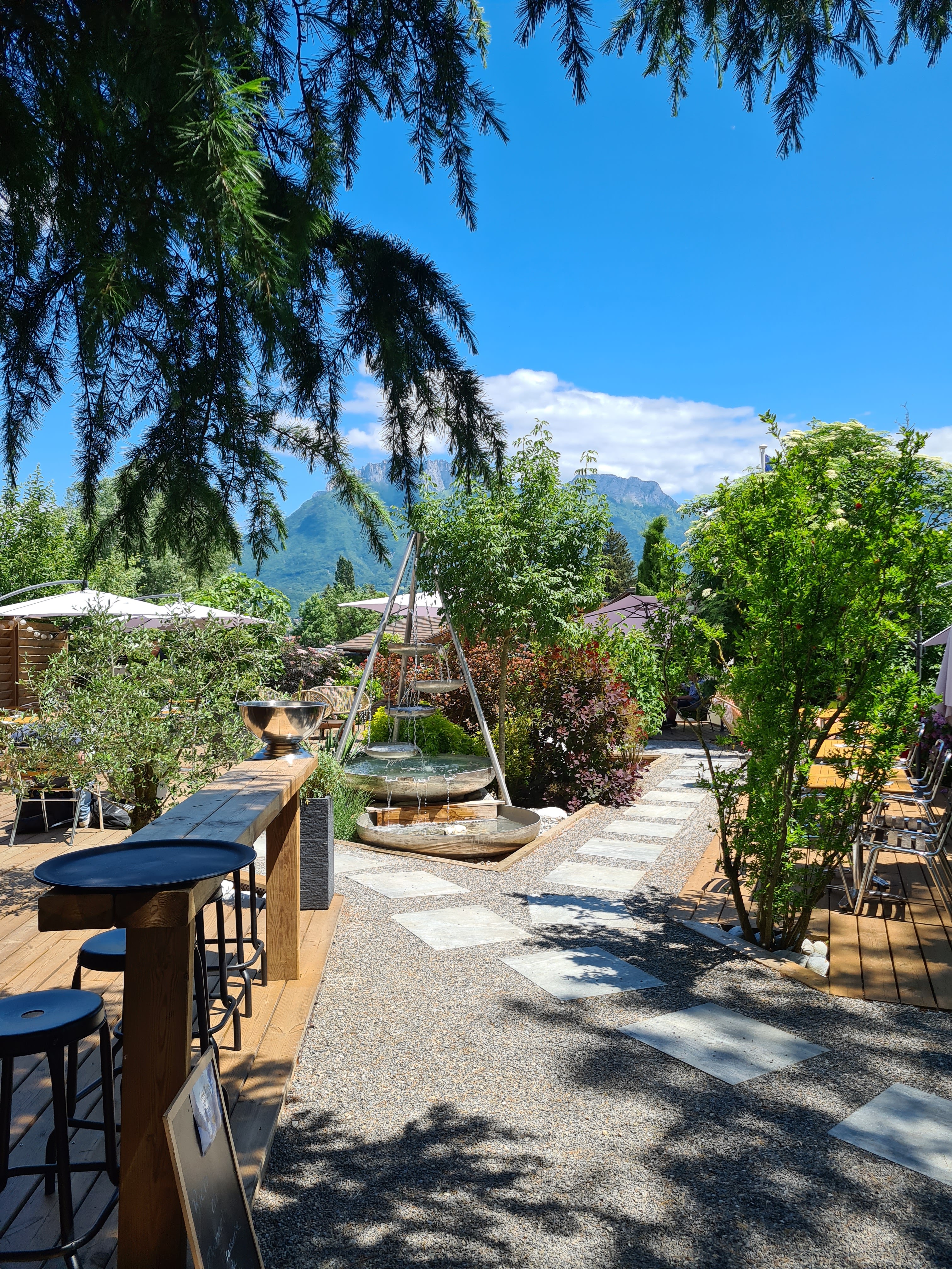 Nous avons emmené notre famille faire une balade à vélo autour d'Annecy aujourd'hui et nous nous sommes arrêtés au hasard dans ce petit restaurant cosy caché au bord de la piste cyclable. Nous avons commandé des boissons et n'avons pas été déçus. Les prix étaient justes, tout ce que nous avions commandé était froid et rafraîchissant. C'était une journée chaude et ils nous ont servi de l'eau froide avec beaucoup de glace pour nous rafraîchir. La décoration est absolument magnifique. On se croirait dans un petit jardin privé avec le bruit apaisant de l'eau qui coule et une vue imprenable sur la montagne en arrière-plan. Pour couronner le tout, le personnel était accueillant, engageant et chaque interaction se faisait avec le sourire. Nous serons de retour!