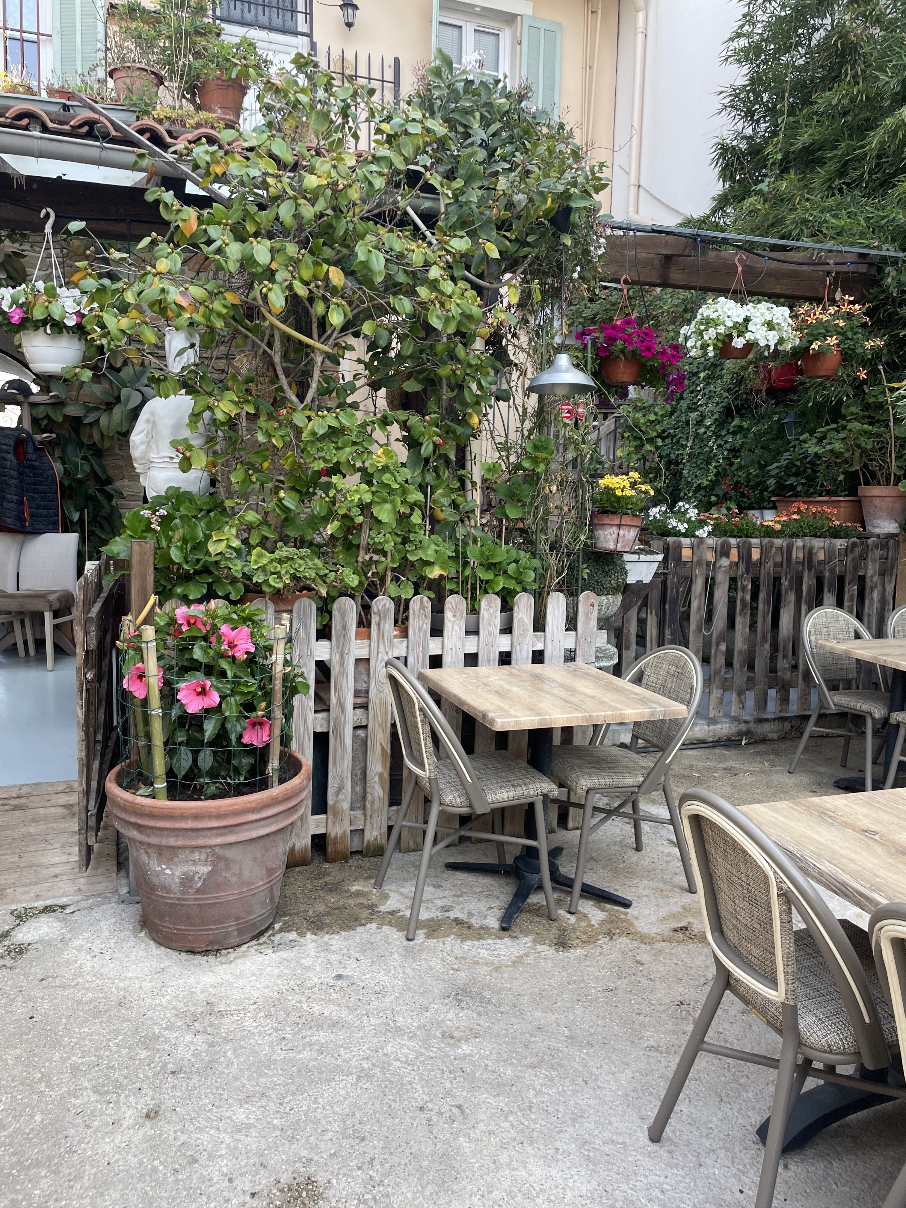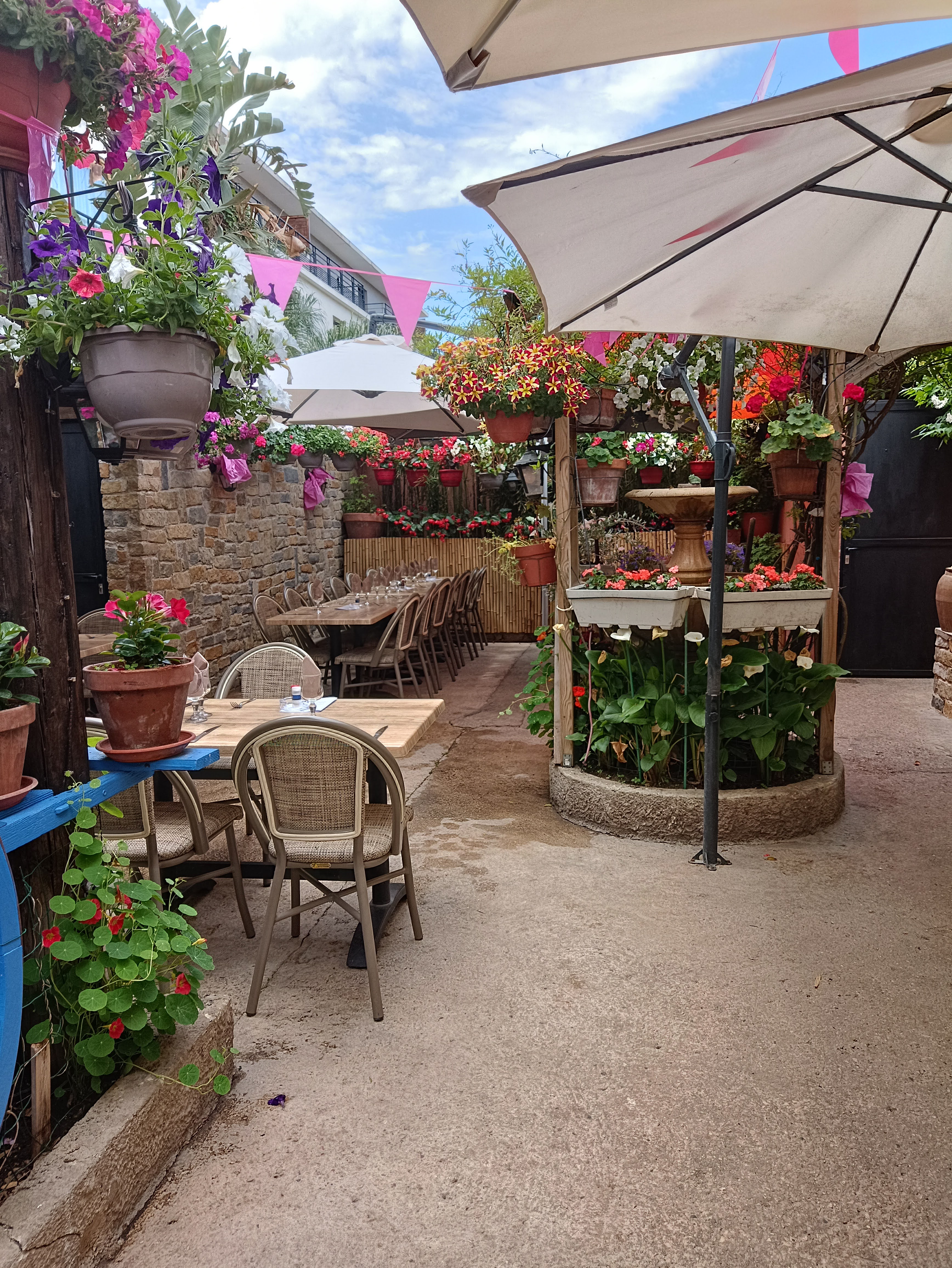 Lové au cœur d une cour intérieure fleurie, ce restaurant offre en plus du cadre une excellente cuisine, pleine de saveurs. Service efficace et avec le sourire. Juste parfait ! Je recommande.