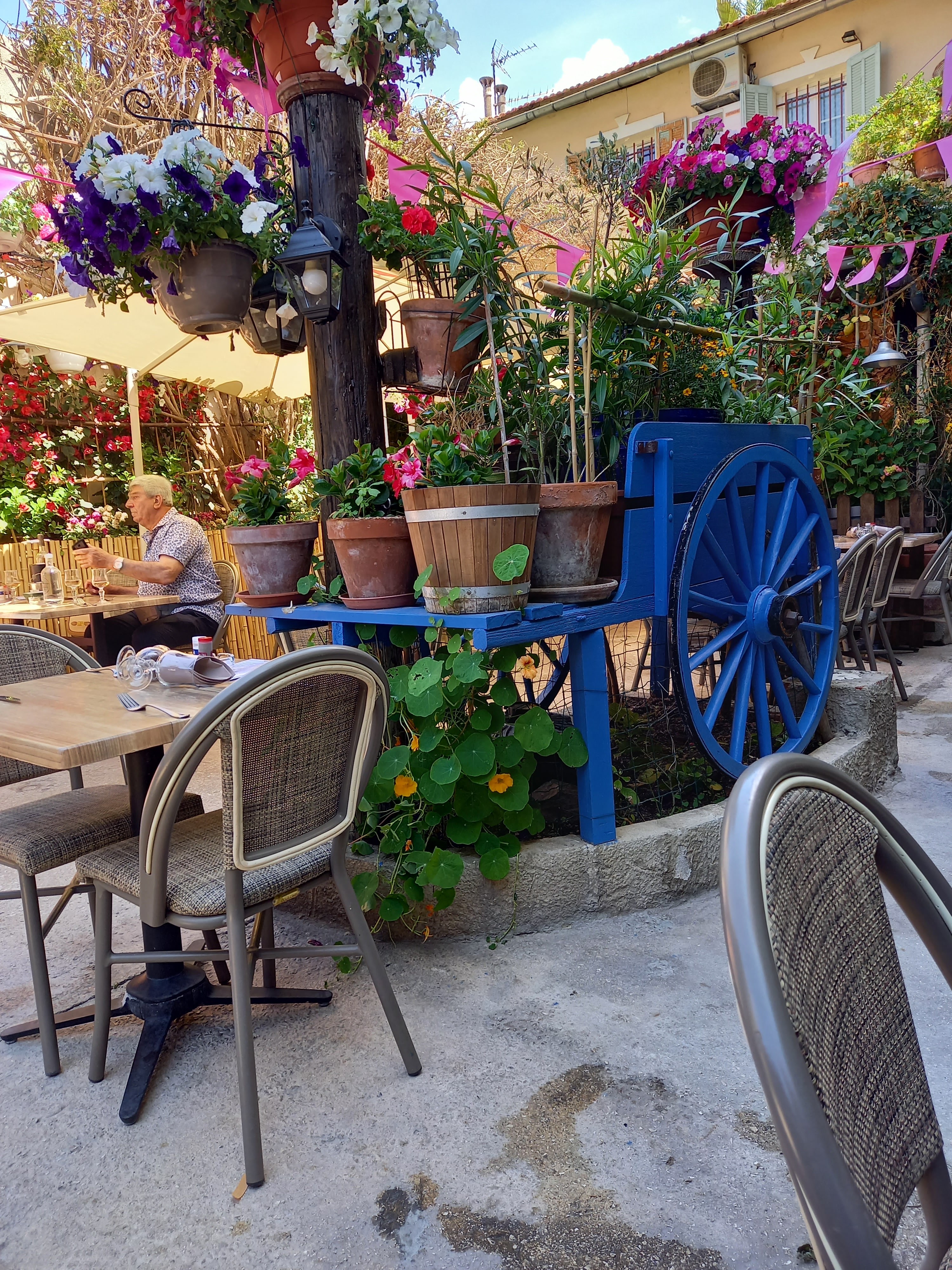 Une cours intérieure très fleurie et agréable. Un service très rapide, peut être un peux trop rapide si vous voulez prendre du du temps. Cuisine très bonne (viandes, poisson, pâtes et pizzas) je recommande.