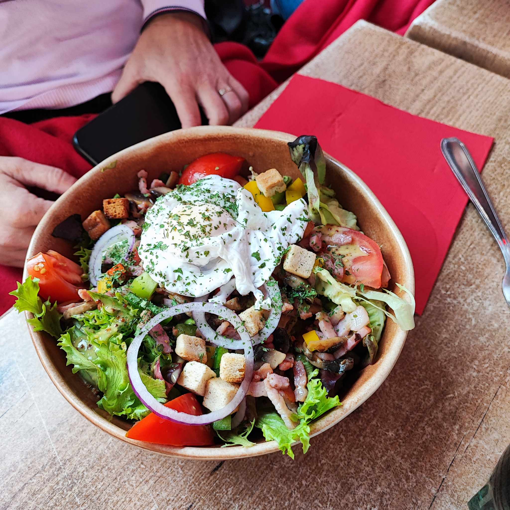 Très bon repas pris en terrasse : grandes salades originales et copieuses, dessert du jour succulent ! Personnel aimable et souriant . Et très appréciable le service à toute heure . On reviendra