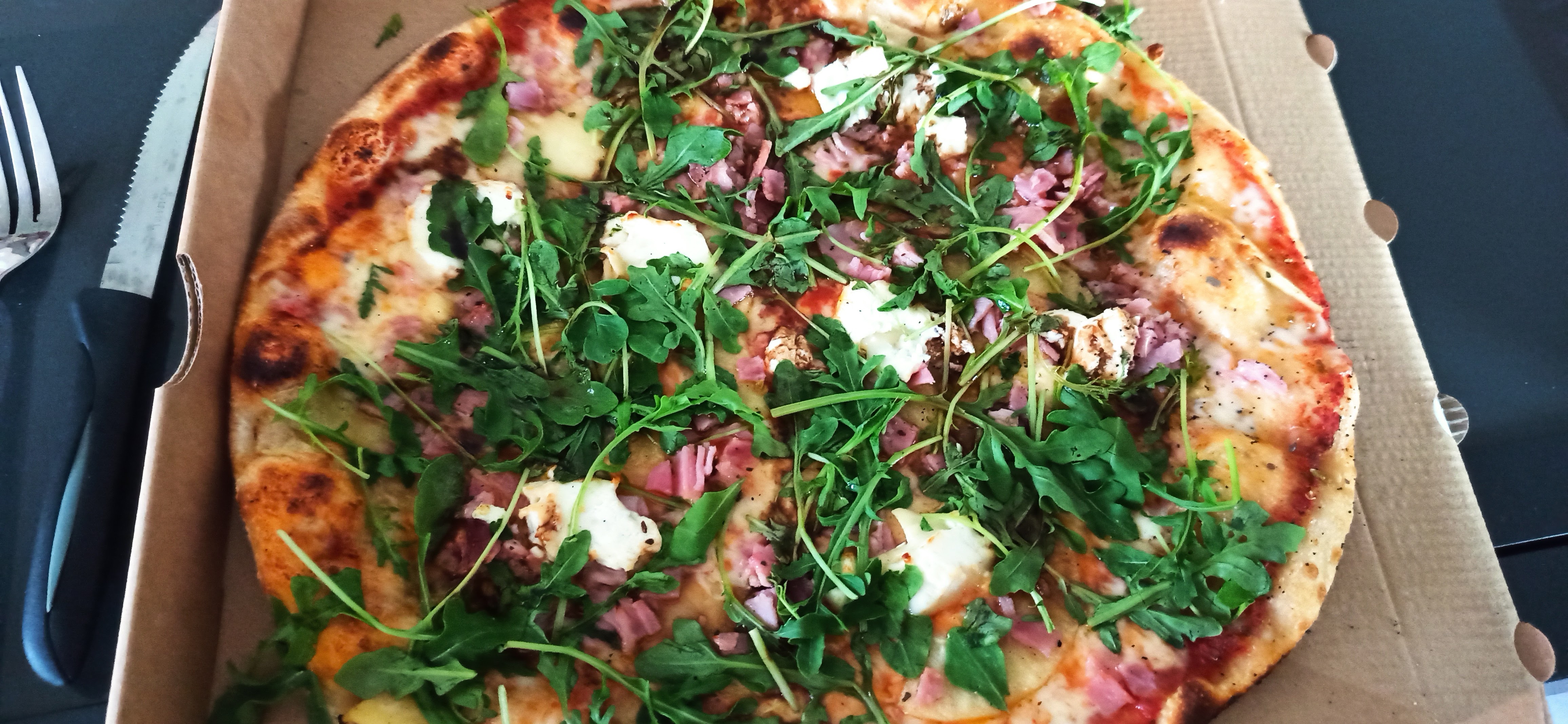 Superbe pizza commandée par téléphone. Prête à notre arrivée. Chèvre miel Serrano roquette.. Un pur régal !