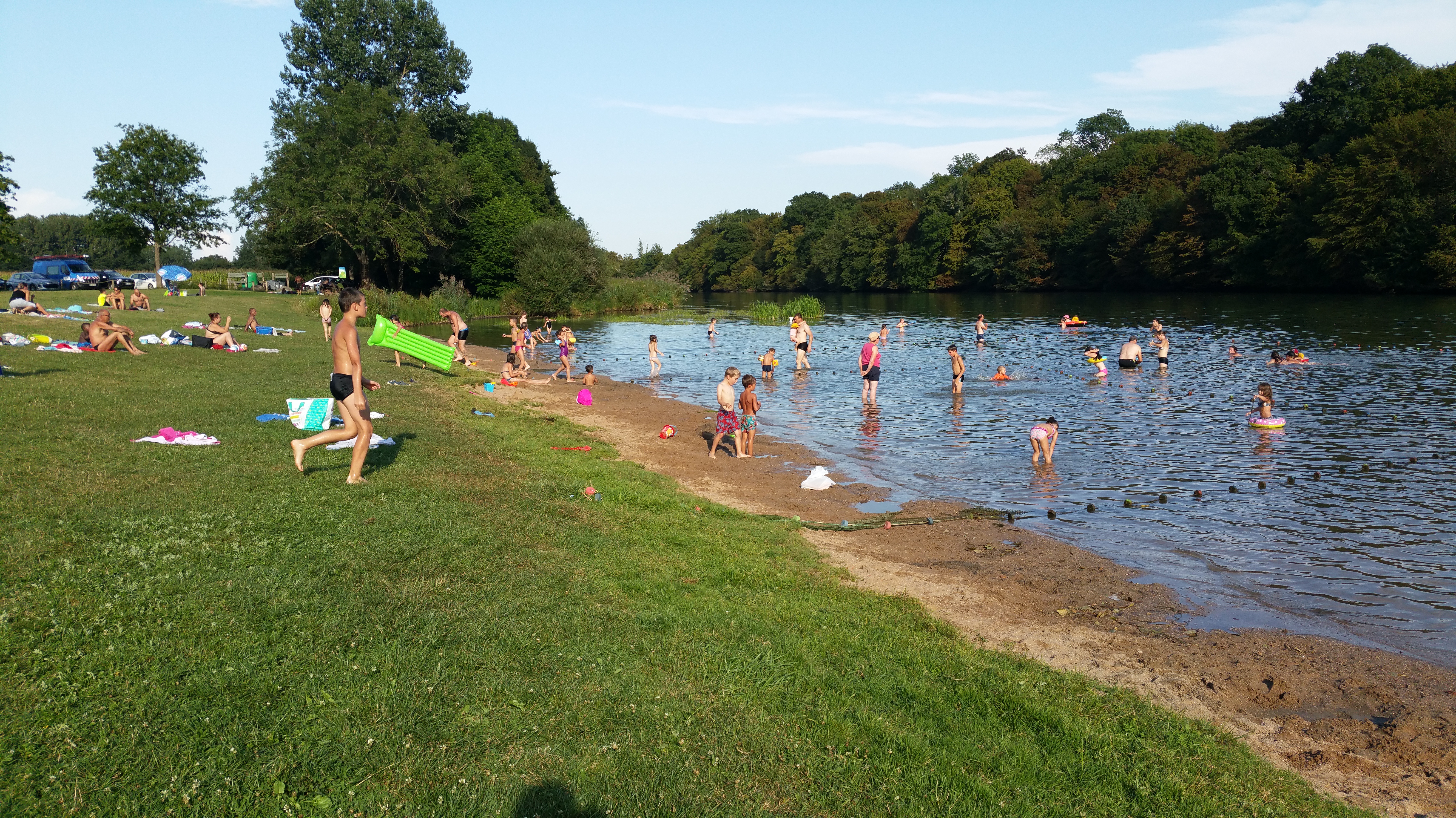 Plage gratuite gardée l'après midi cadre verdoyant avec une grande plage engazonnée. Baignade délimitée par des bouées, buvette, 🚾 tables de pique-nique.