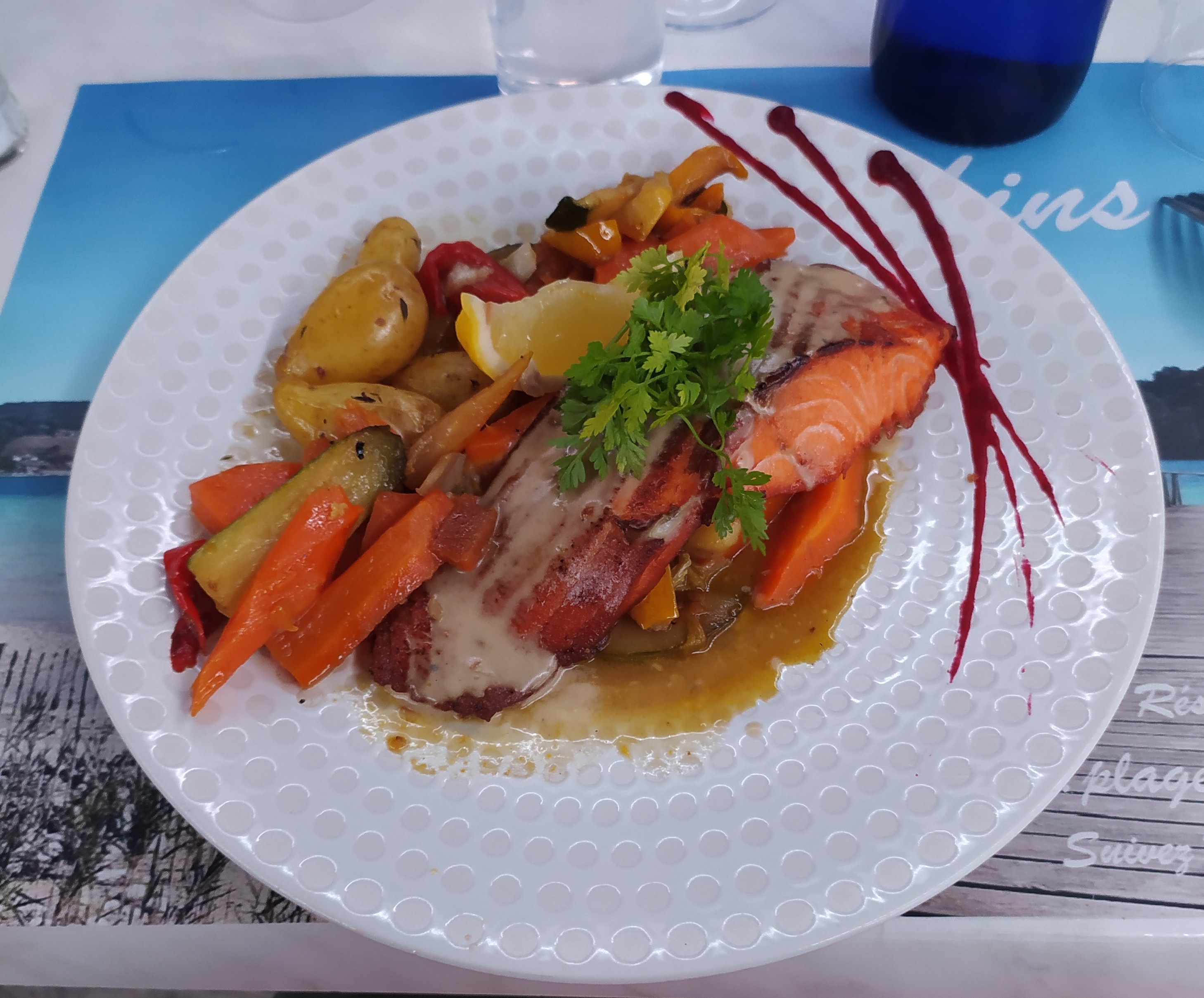 Bonne cuisine,à la carte et 2 menus mais pas d'accompagnement de légumes même dans les menus sauf avec supplément (4 euros) dommage. Mettre un minimum de légumes. serait bien.Tres belle plage avec ponton.