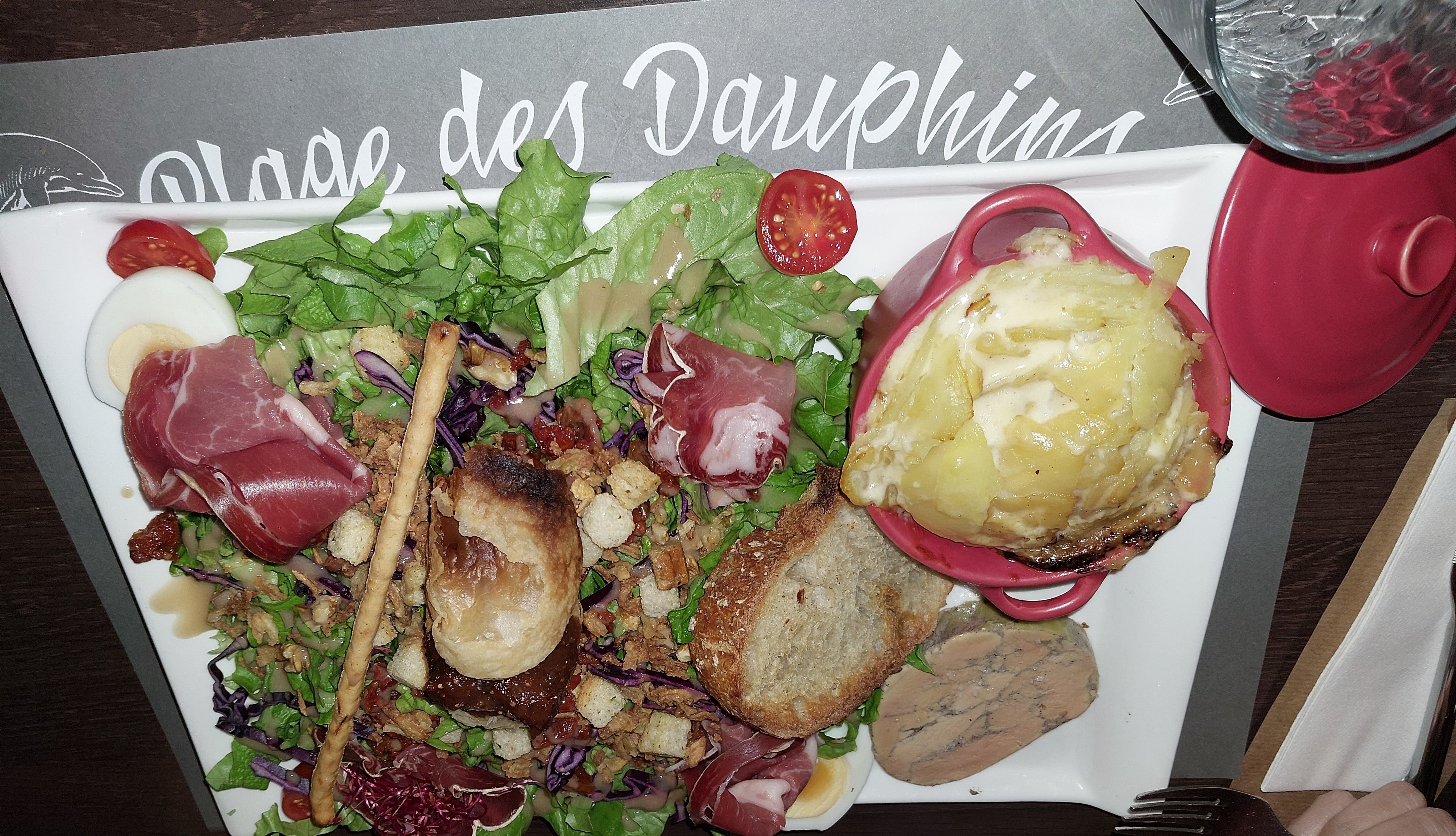 Encore une bonne soirée à la Plage des Dauphins ! Un accueil très chaleureux, convivial et souriant de la part de Arnaud, le patron 👱 et de Frédo. 👦. Une superbe vue sur le lac 🚣♂️ (à 19h30, la clarté est belle pour admirer le paysage 🚣♀️🏞️). Parmi une carte alléchante, nous nous sommes régalés d'un pavé de boeuf 🥩 sauce forestière/purée de carottes🥕/frites 🍟et d'un tartare de saumon 🎣bien rafraîchi/jolie salade composée 🥗et frites. Nous n'avons pas résisté au dessert du jour, une pomme 🍏 au four sauce caramel et thym. Le service est parfait. Nous reviendrons encore et encore ! 😊😊😊. Merci à toute l'équipe