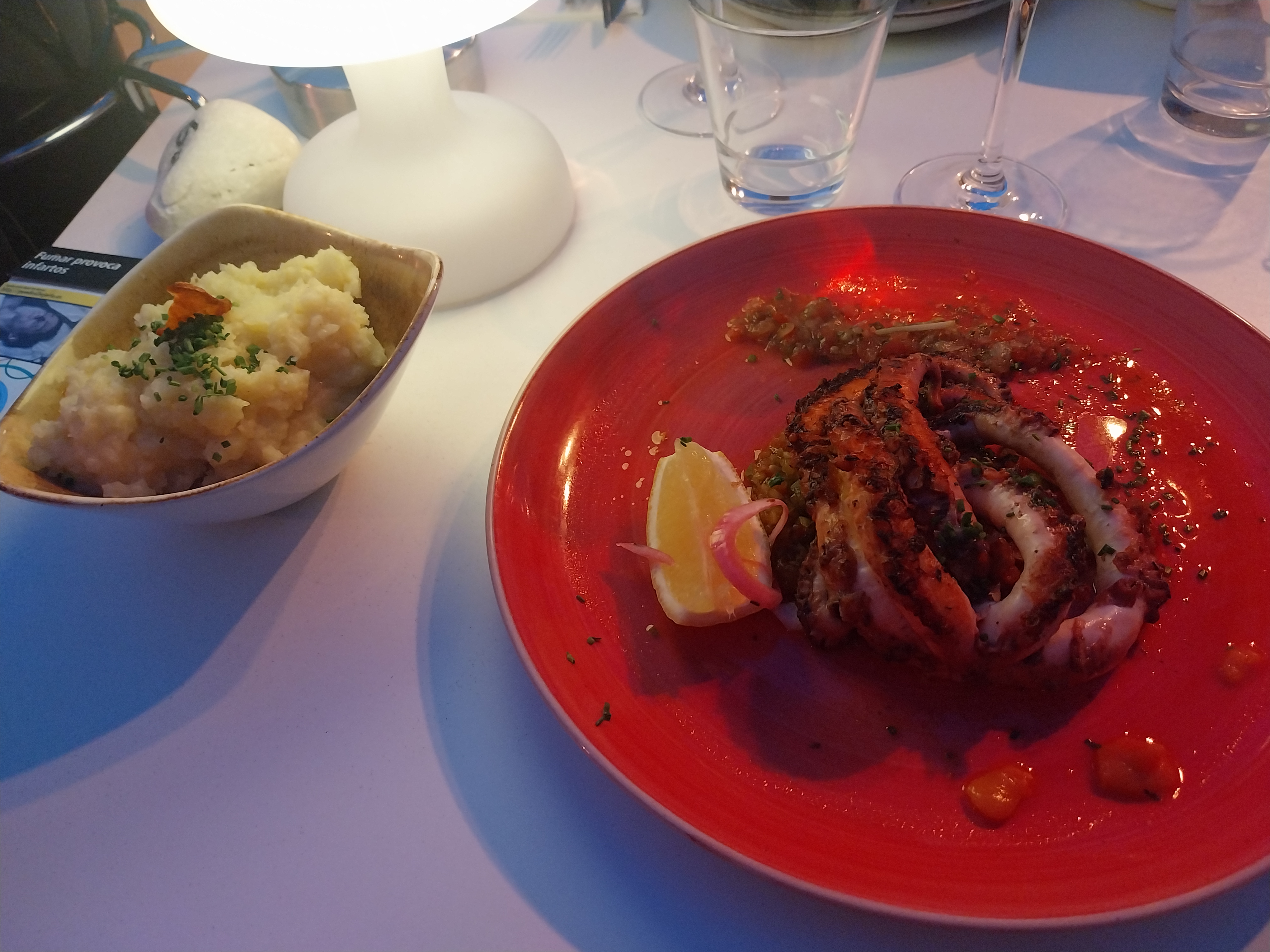Calamars grillés avec risotto et petits légumes très bons, je recommande. Pyramide de gaufre belle et bonne. Cadre et service sympathique. Temps d’attente très correcte.