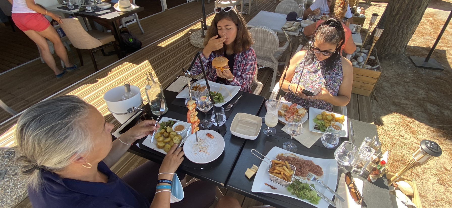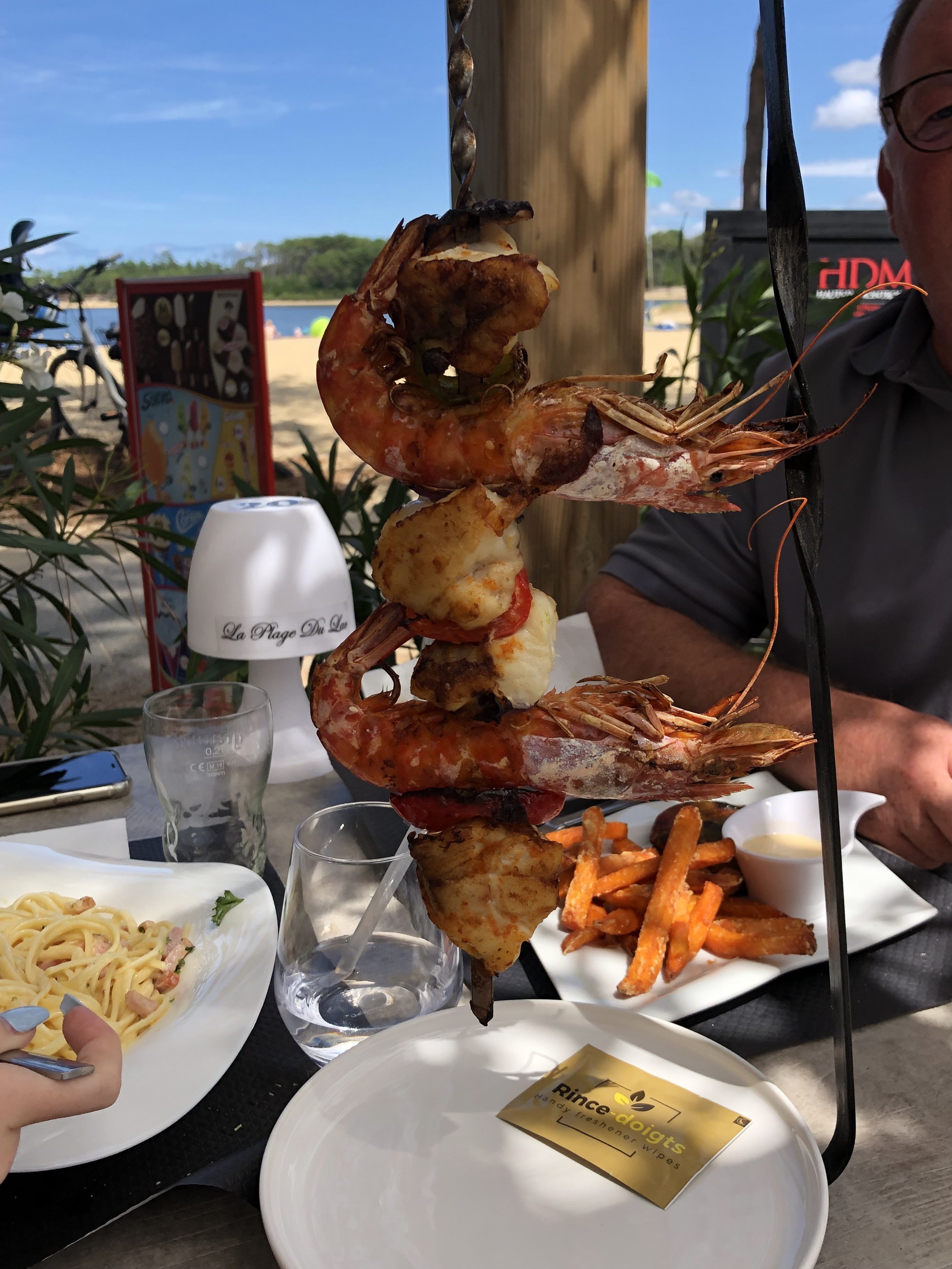 Un accueil et une attention 5 étoiles (...il n’y a pas plus haut...). Installez-vous à table et profitez de la vue sur plage au bout de la pinède. Commandez et savourez une cuisine, faite de produits frais, délicieuse et dressée avec goût. Entrées, terre, mer, desserts...il y a le choix. Pour ma part je vous recommande la cassolette de Chipirons et la brochette de Lotte et Gambas, présentée suspendue un délice ! Forcément on y reviendra !
