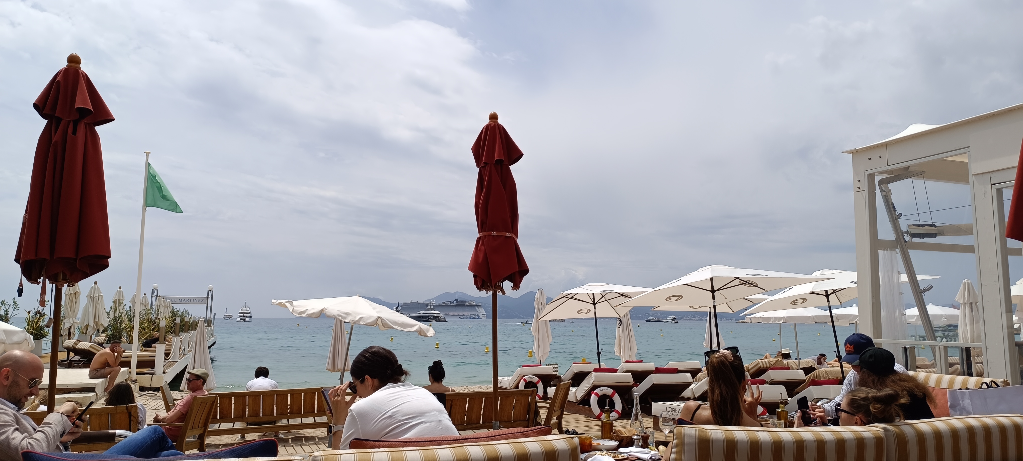 Nous logions à l’hôtel Martinez. Et la plage est vraiment cool. Ils ont des transats et des parasols. Le prix est de 94 € par personne. Uniquement pour le lit et le parasol. Ils ont aussi des cabanes. Le prix de la cabane est de 700€ par jour et comprend 1 bouteille de champagne, quelques boissons et fruits. Un bon endroit où aller. 7/10