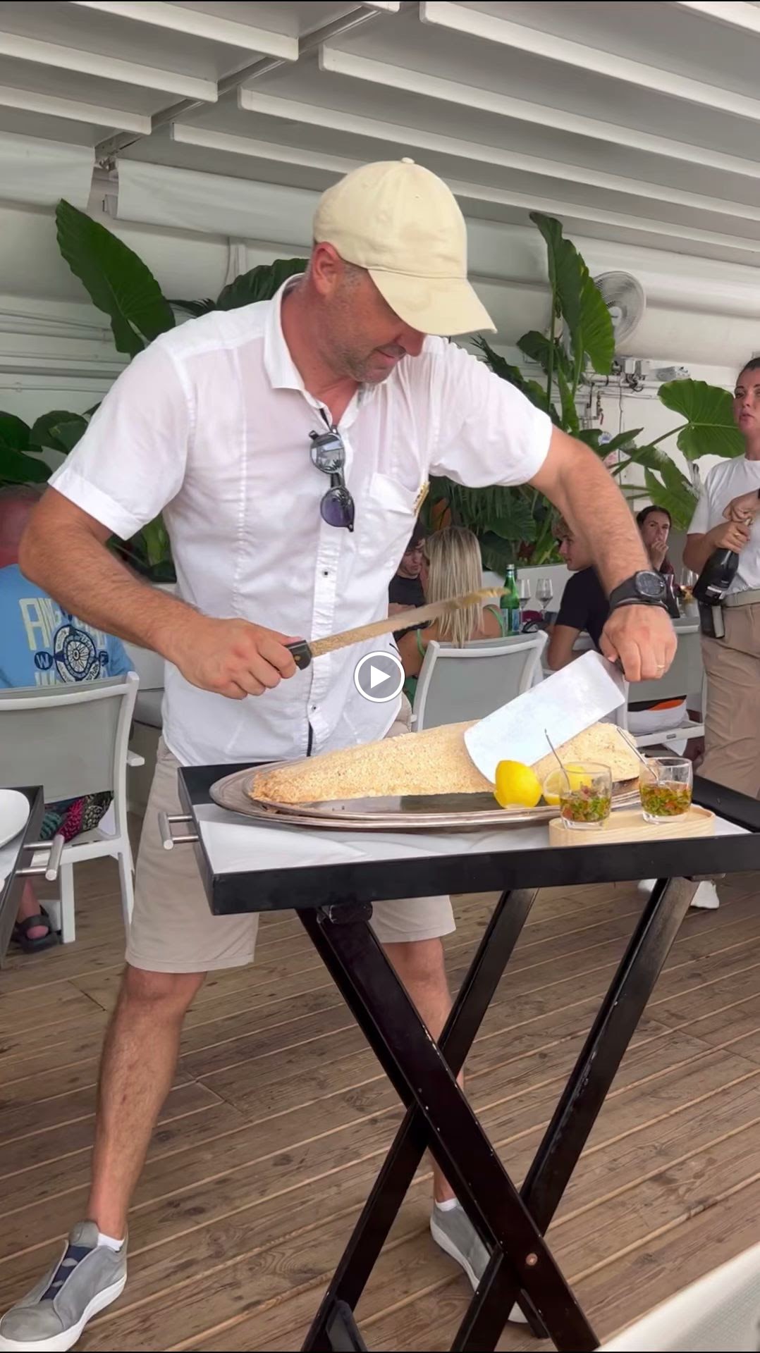 Club de plage incroyablement beau avec un très bon restaurant. Le service sur la plage était vraiment très sympathique, attentionné et bon. Il y avait toujours quelqu'un à proximité quand on voulait commander quelque chose. Les gars font un excellent travail ! La nourriture au restaurant était également très bonne. Nous avons eu la prise du jour (1,2 kg de loup de mère fraîchement frit) avec de délicieux accompagnements. La foccacia aux truffes était à tomber par terre.