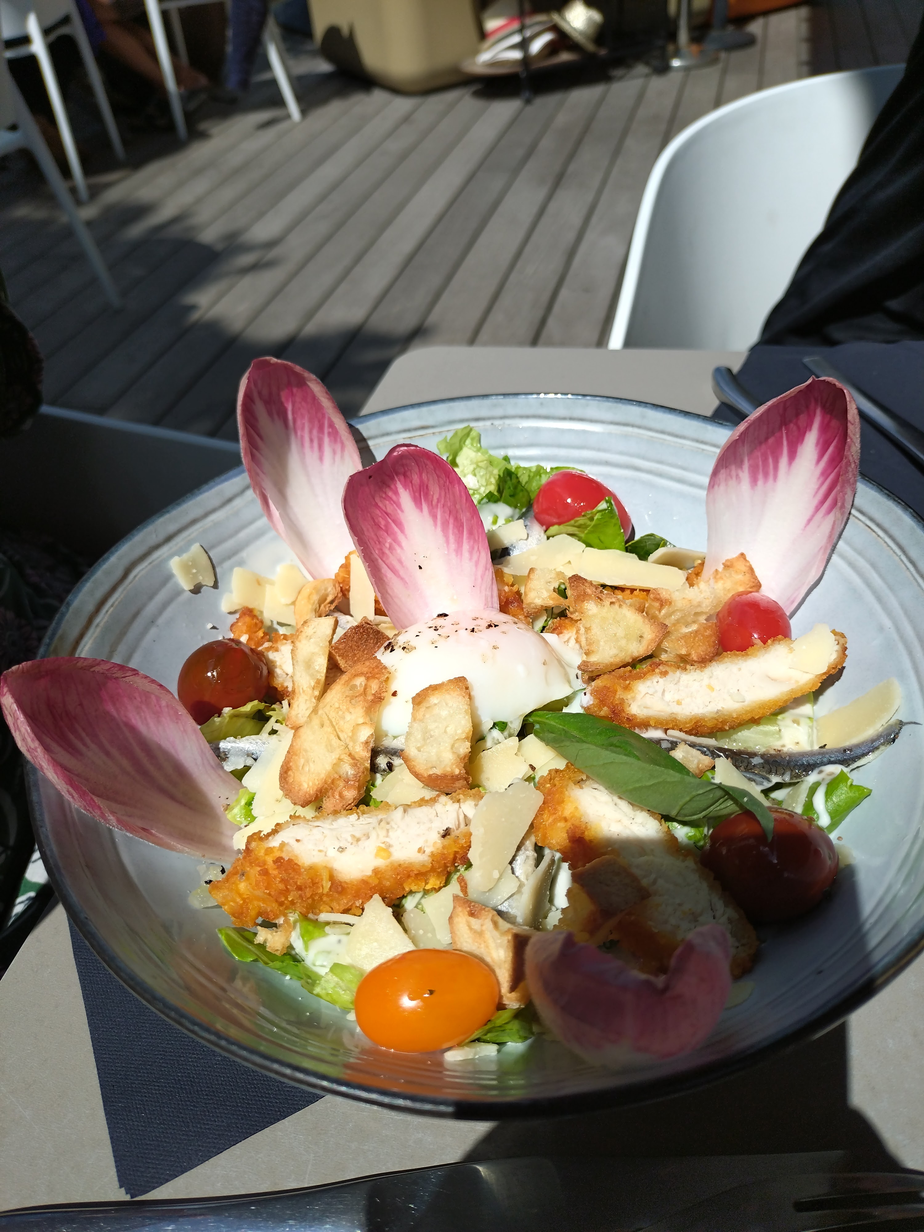 Déjeuner en terrasse. Salades copieuses et savoureuses! Petit plus de ce restaurant la carte change régulièrement ! La vu est sympa et le personnel très agréable !