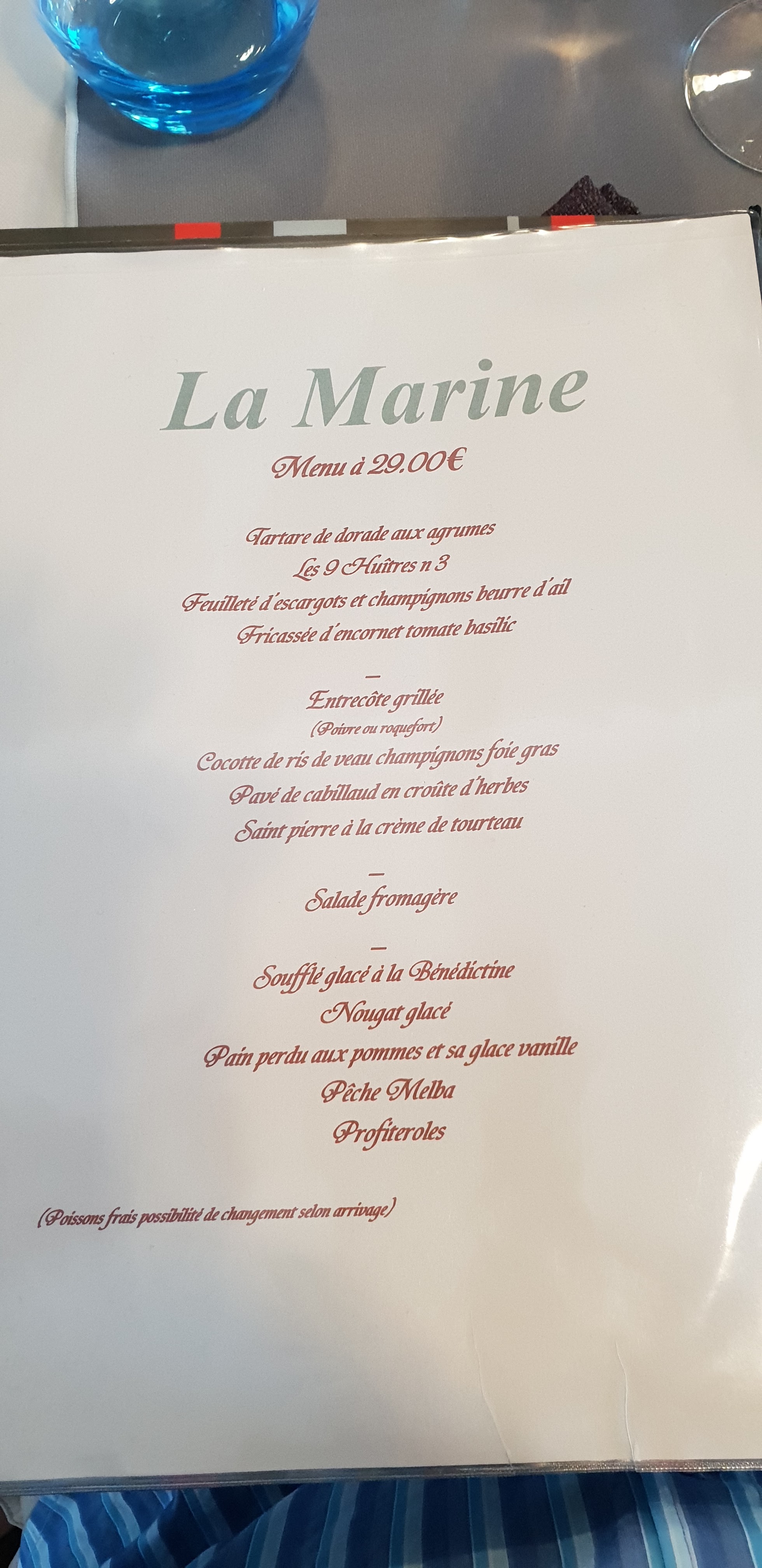 Réservation recommandée. Délicieux de l entrée au dessert formule à 29e80 impeccable .serveuses souriantes .petite pensée et surtout remerciement à la jeune femme qui vends des poissons devant la capitainerie et qui nous a recommandée cette table .NE CHANGEZ RIEN .