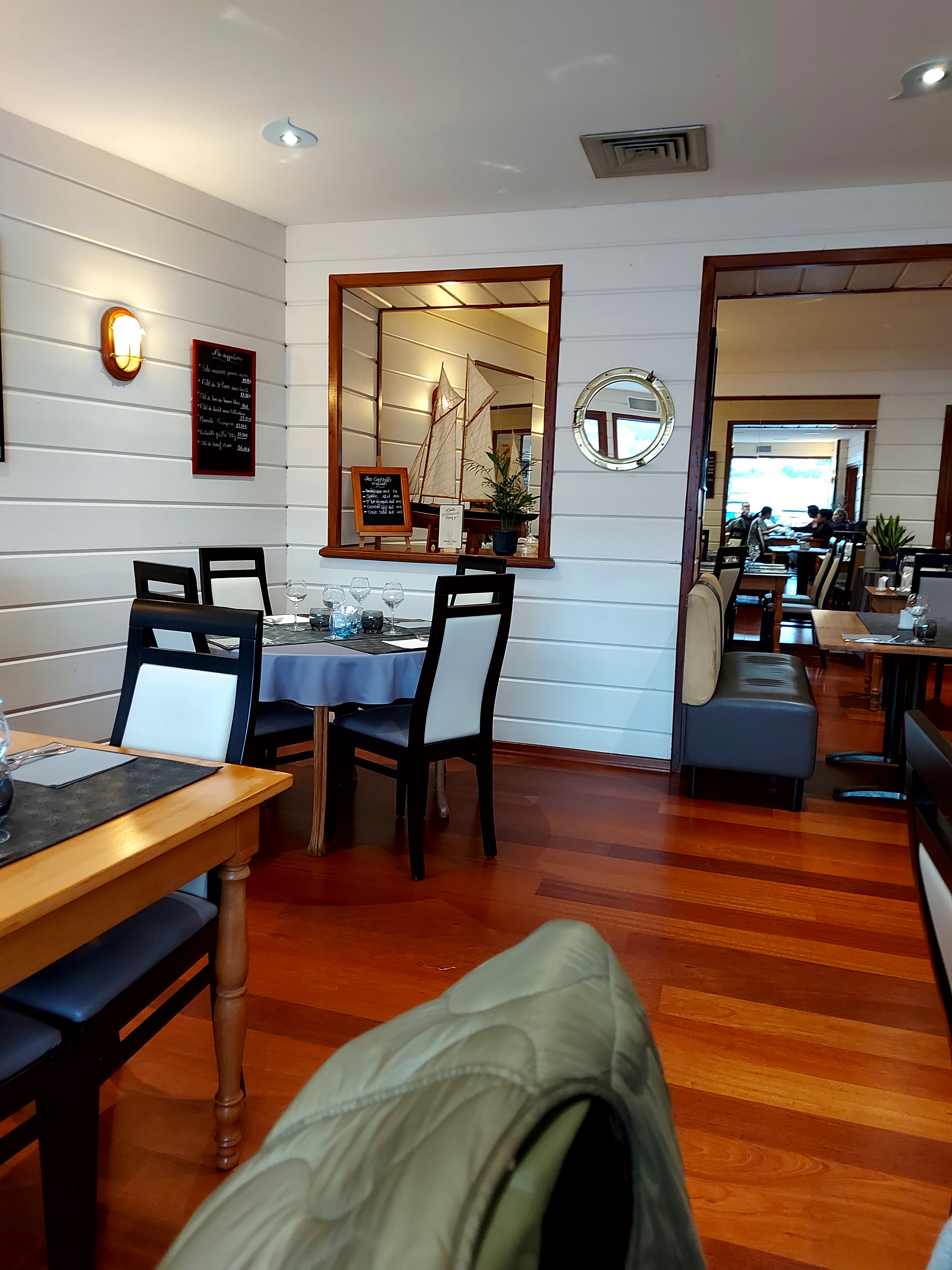 Restaurant en face du port, possédant une salle au RDC et une salle à l'étage, bien agencé, de l'espace entre les tables pour garder une certaine intimité, des tables spacieuses oú vous pouvez prendre vos aises pour déguster les plats, en effet c'est très bien présenté, produits excellents, notamment le poisson, les huîtres... On vous propose différents menus en plus de la carte, à des prix divers, vous allez vous régaler... Le personnel est accueillant, souriant, prévenant, service impeccable, de l'extérieur cela reste simple, surtout n'hésitez pas à rentrer vous ne serez pas déçu...
