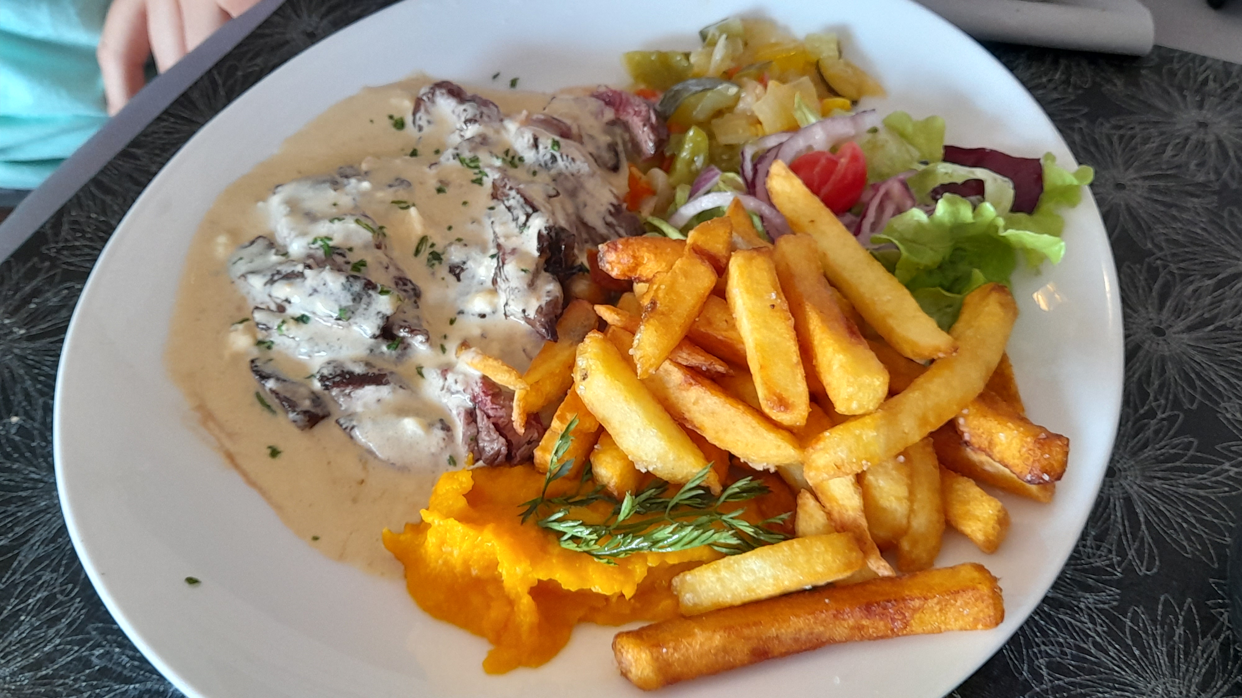 Très agréable accueil. salle propre et chaleureuse Service discret et rapide. .menu correct ; Assiettes savoureuses et bonne cuisine Personnels très agréable .. Je recommande