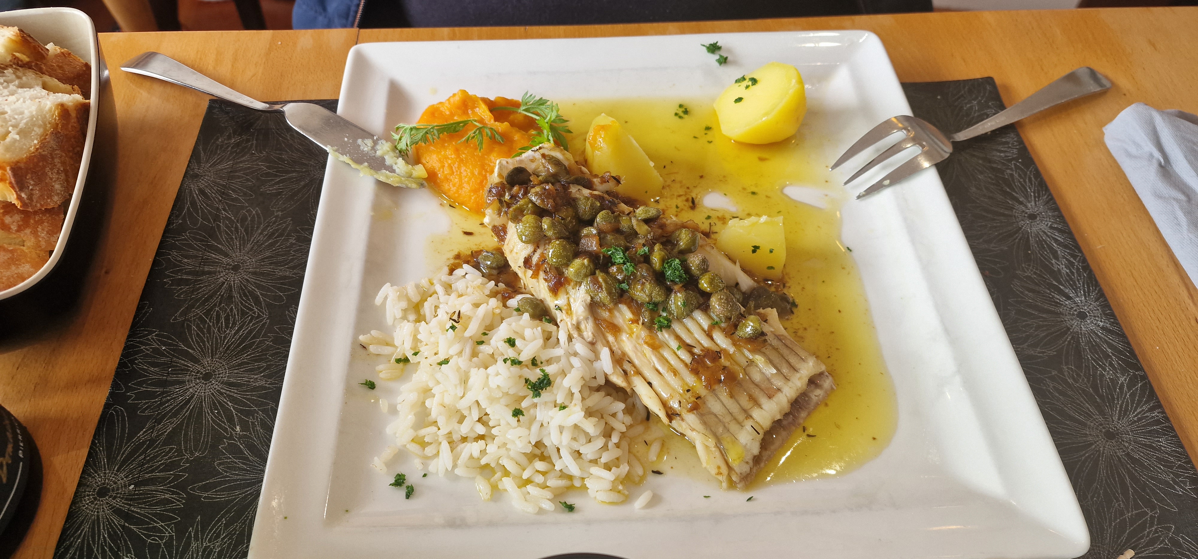 Déjeuner en Namoureux le dimanche 28 avril. Bel endroit et déco en salle très jolie, nous avons l'impression d'être sur un bateau pour le coup. Service impeccable des deux jeunes demoiselles et de leur responsable.. Un peu déçu par l'assiette. Salade de rouget Thaï. Filets de rouget trop cuits, saveur Thaï inexistante. Filet de bar décevant, par contre morue à la Cauchoise excellente.