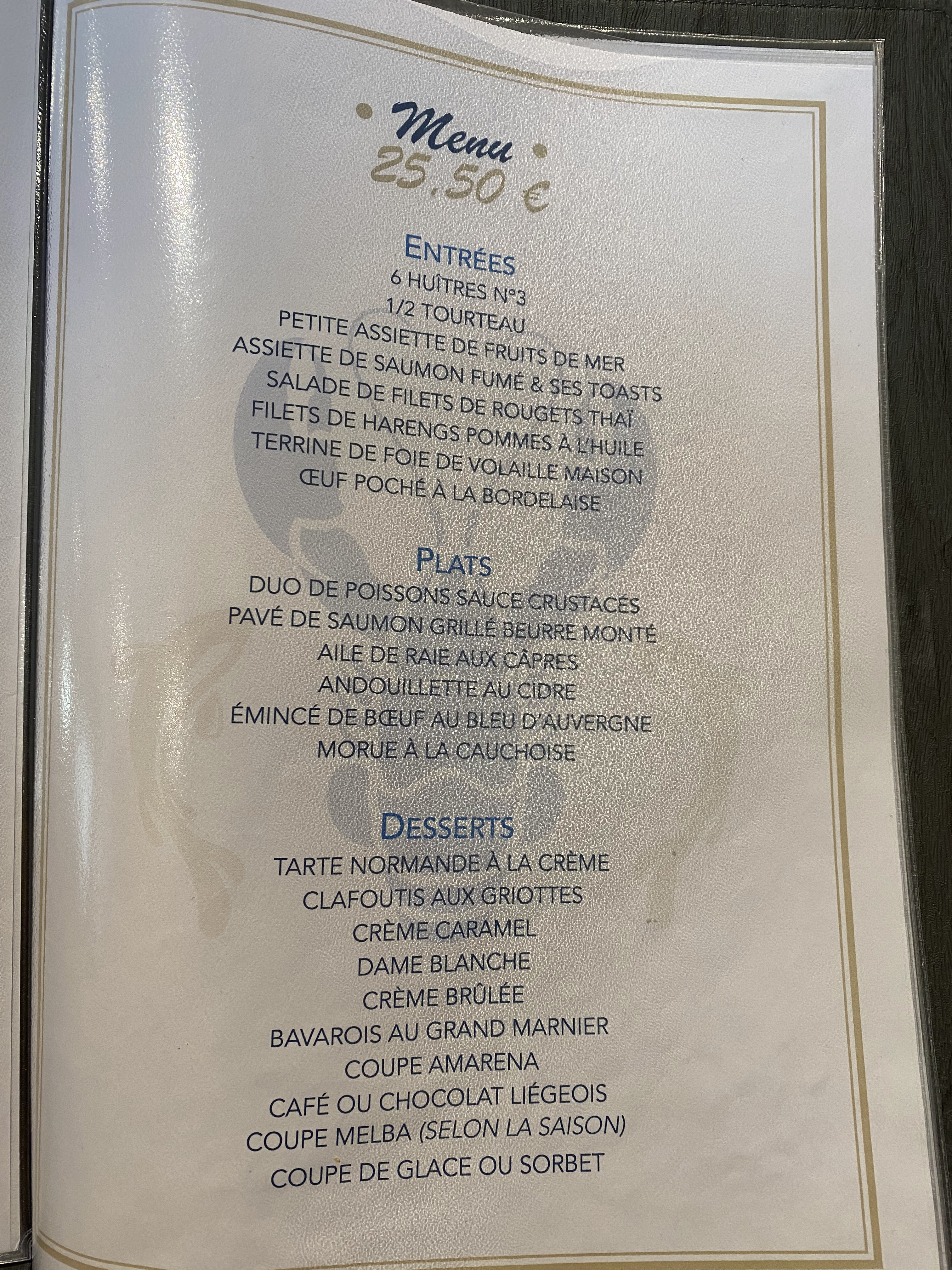 1ere fois Cadre: très bien , calme sauf si il y a un groupe parlant fort.. Accueil, ambiance bien : mais pitié supprimer la musique de fond criarde très désagréable Serveuses : très bien, bon contact Menu : tarif correct Entrée : huîtres : bien Plat: duo poisson : bien Dessert : bien Café : bien A refaire Un point important : cuisine traditionnelle que je prefere à l ensemble des cartes des autres restaurants mieux placés ( Burger, pizza...) . Ils font des cartes comme les grandes chaînes que l on trouve ailleurs...