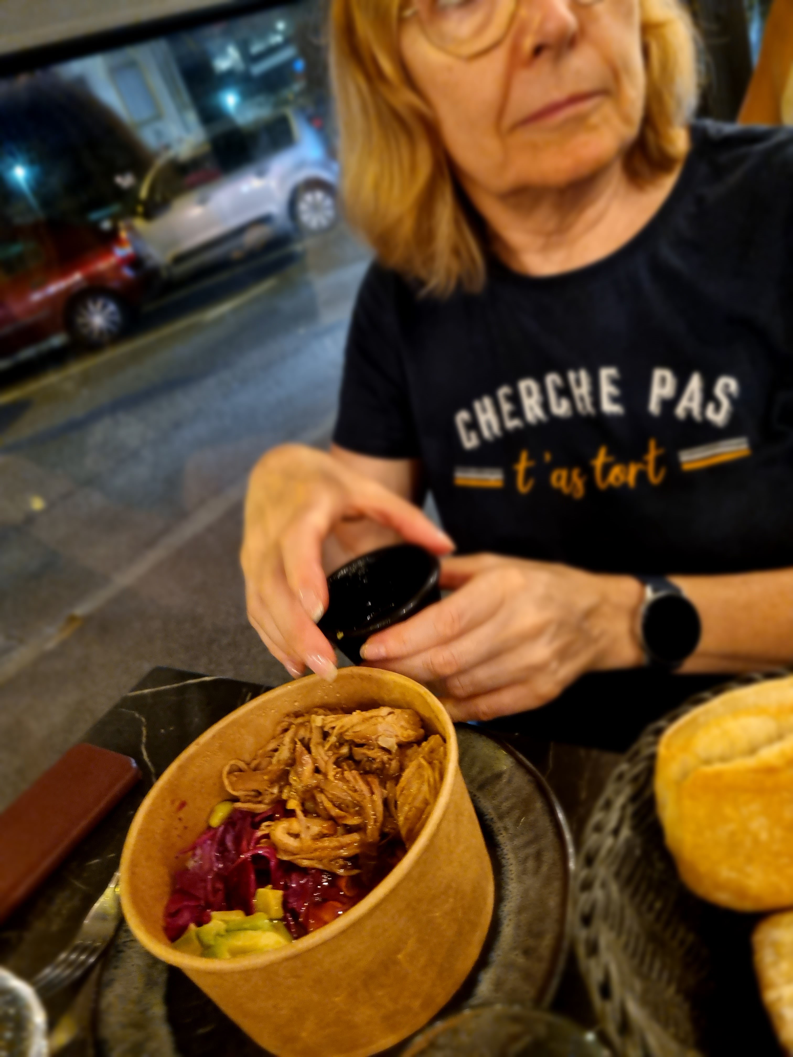 Bof!bof!bof! Pour l’aïoli de morue, l’aïoli bien! Mais les légumes servis autour, bof!bof!bof, poivron en bocaux, un artichaut et trois champignons en boîte, betterave rouge en sous vide, petit morceau de morue, je suis pas contre ce type de montage mais bon c’est 20 euros quand même le plat!