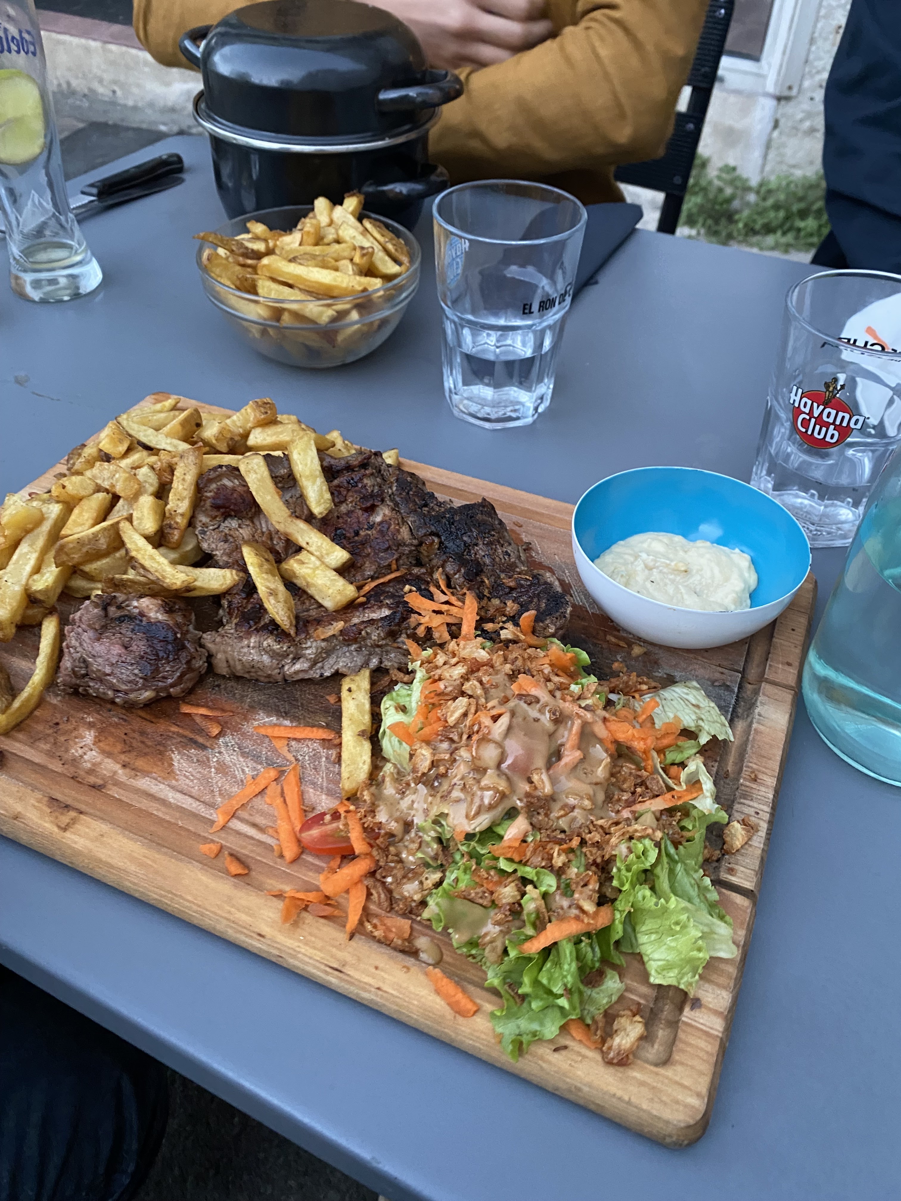 Repas pris en terrasse. Une éternité à être servis comparé à tous les autres restaurants du coin, je n’ai jamais vu ça…. De plus en re demandant un tartare (a volonté), on nous a resservi dans la même assiette ! Patron hautain.