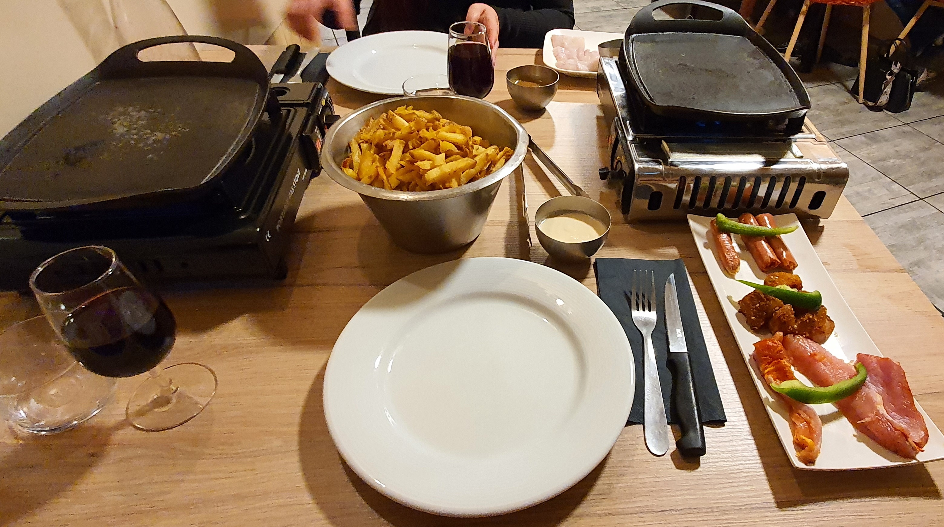 Dîner à 2 un mardi soir. Restaurant original ou vous faites vous même votre cuisson via une plancha électrique posé sur votre table. La carte est varié. Serveur très sympathique et souriant. Donc allez y.