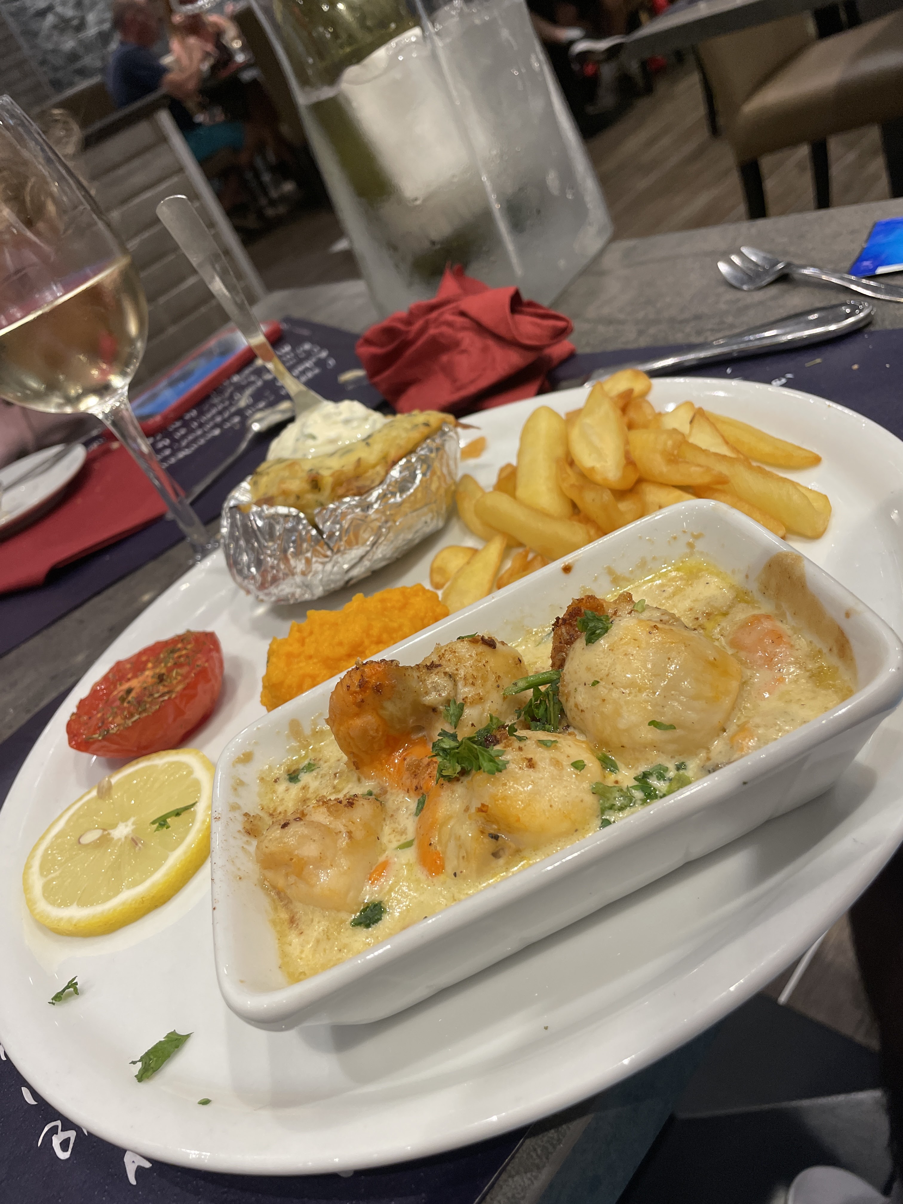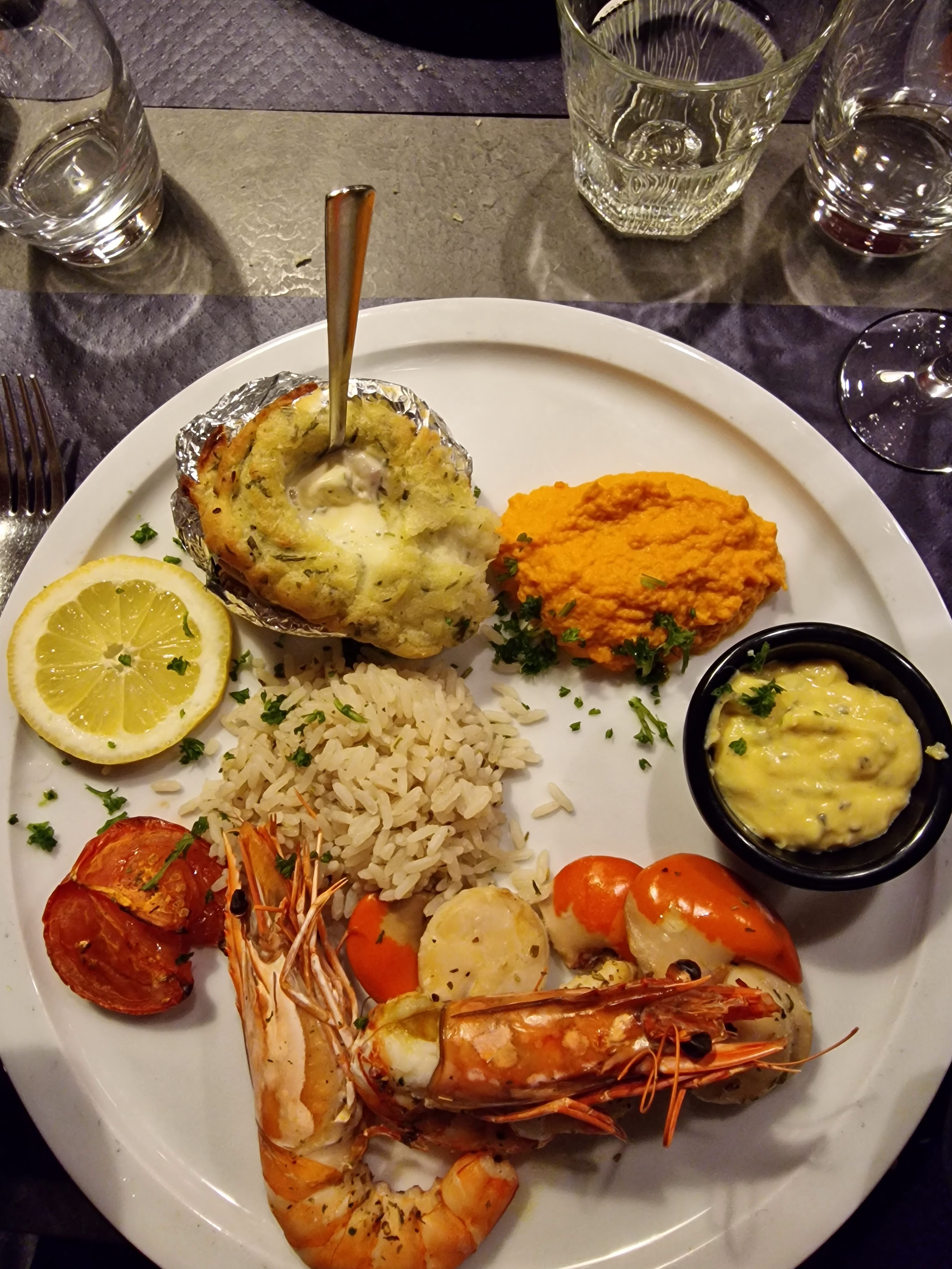 Super bien accueilli, l’entrée est super j’ai pris le plat avec les huîtres, les bulots ainsi que les écrevisses et langoustines Et en plat, j’ai pris le gratin de Saint-Jacques, accompagné de ses moules et ses légumes. Sincèrement je vous le recommande cet excellent. Je joins les photos en preuve
